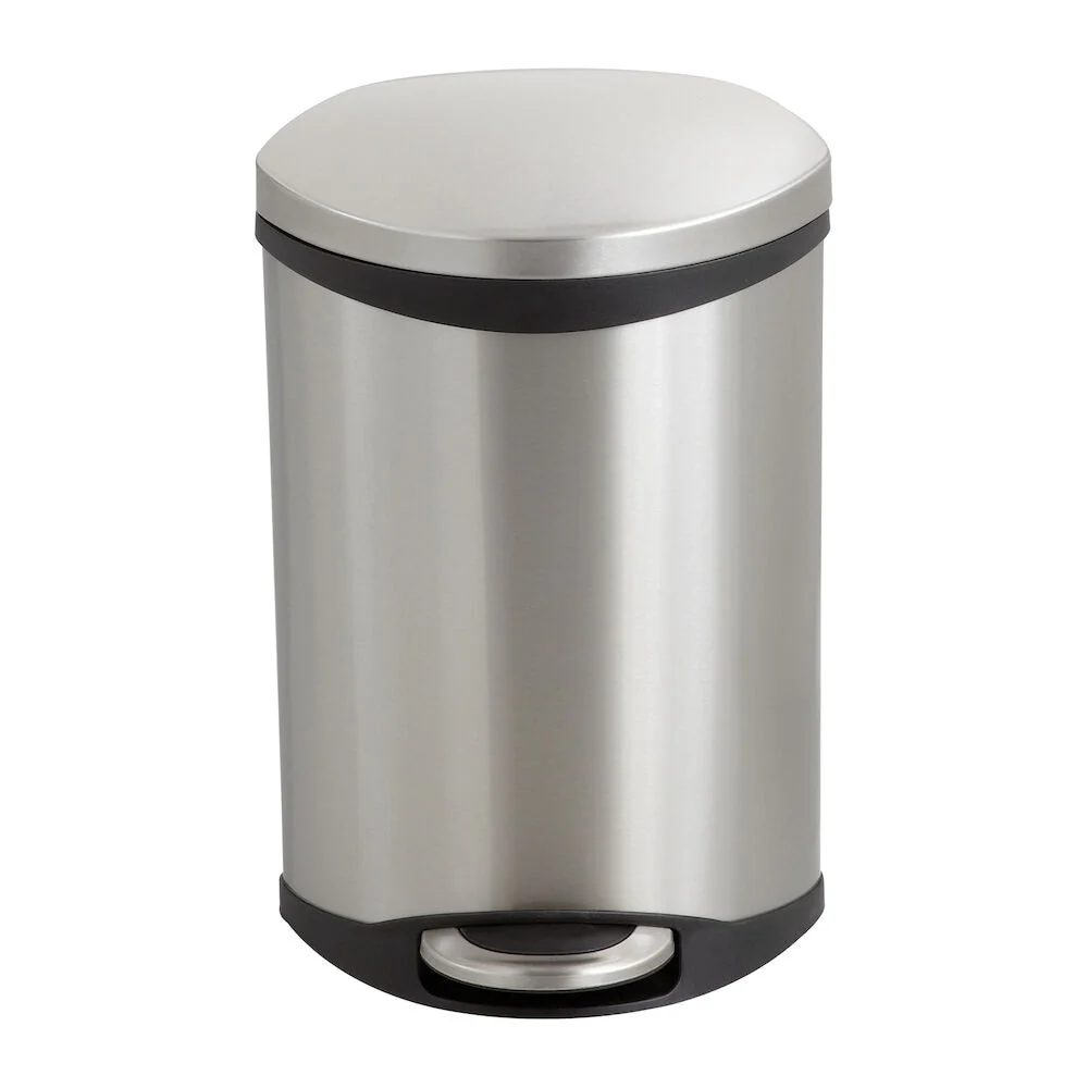 Make an impression with this small 3 gallon step-on trash can - a durable stainless steel garbage can for the bathroom, bedroom, entryway, and beyond. This hands-free garbage can has an elliptical shape, allowing it to fit into room corners to help save on valuable space and is fingerprint proof, ensuring it will always look its best. The waste receptacle features a rigid plastic liner with built-in bag retainer and the lid closes slowly to prevent slamming for a more quiet close.