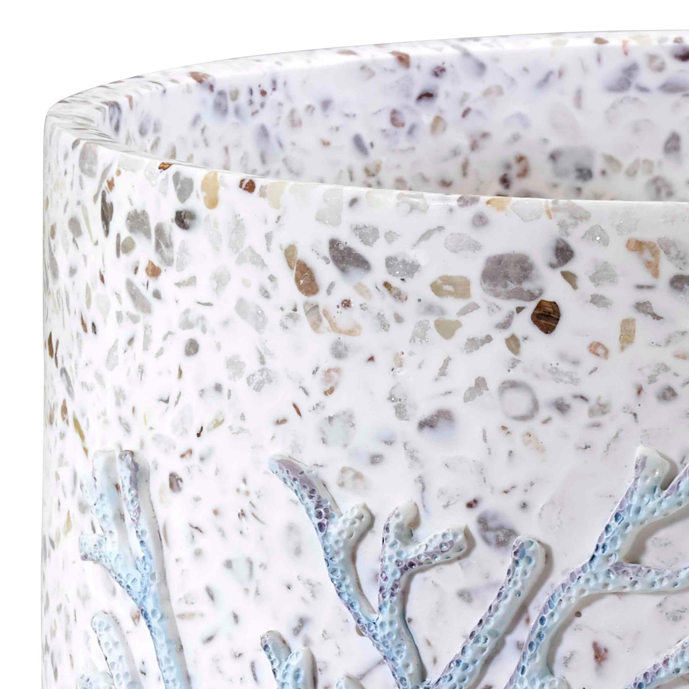 The Avanti Coastal Terrazzo Decorative Wastebasket features a raised nautilus, starfish and coral design on a multi-color terrazzo. The terrazzo base is created from white resin mixed with colored stones. Coordinating shower curtain, towels, rug and accessories available.