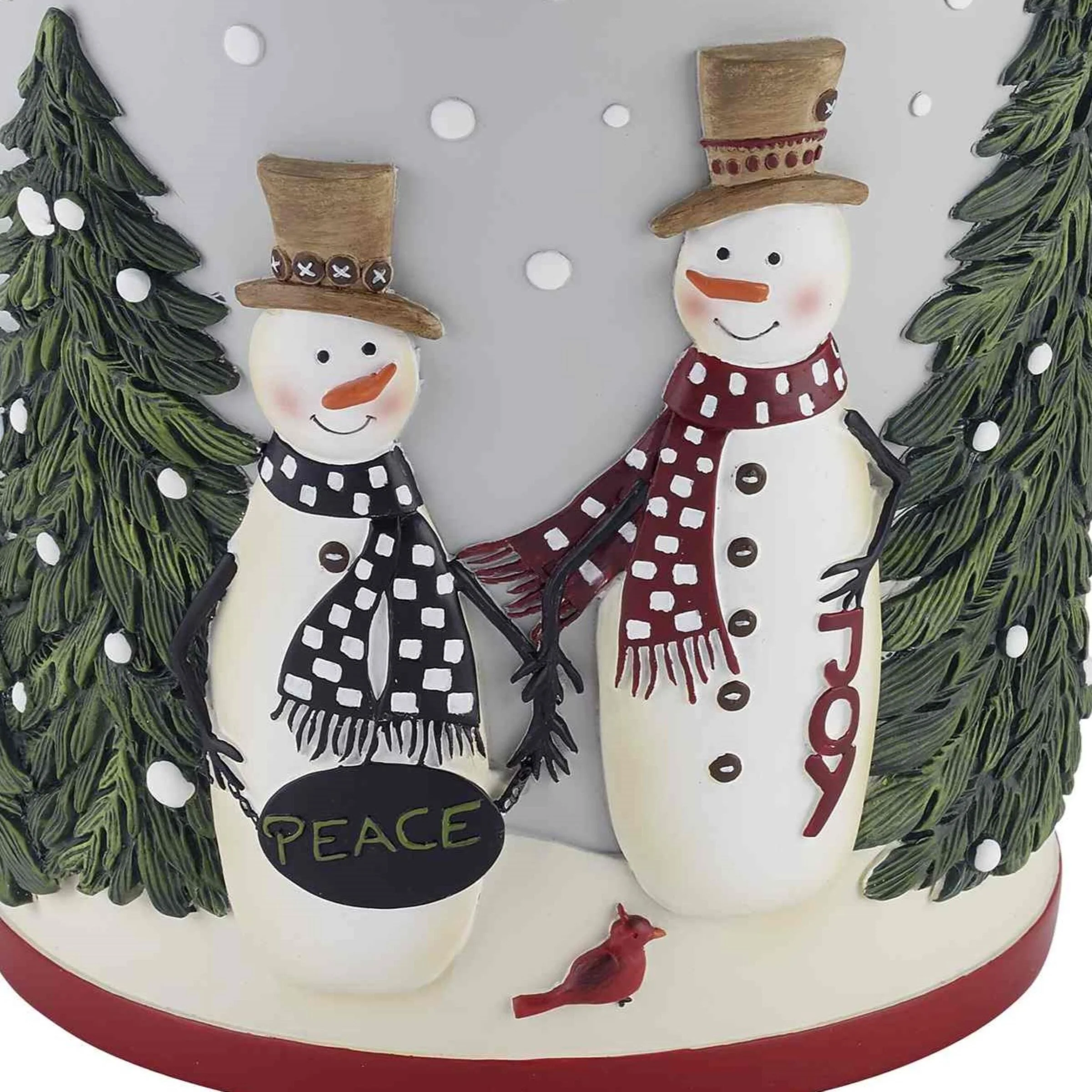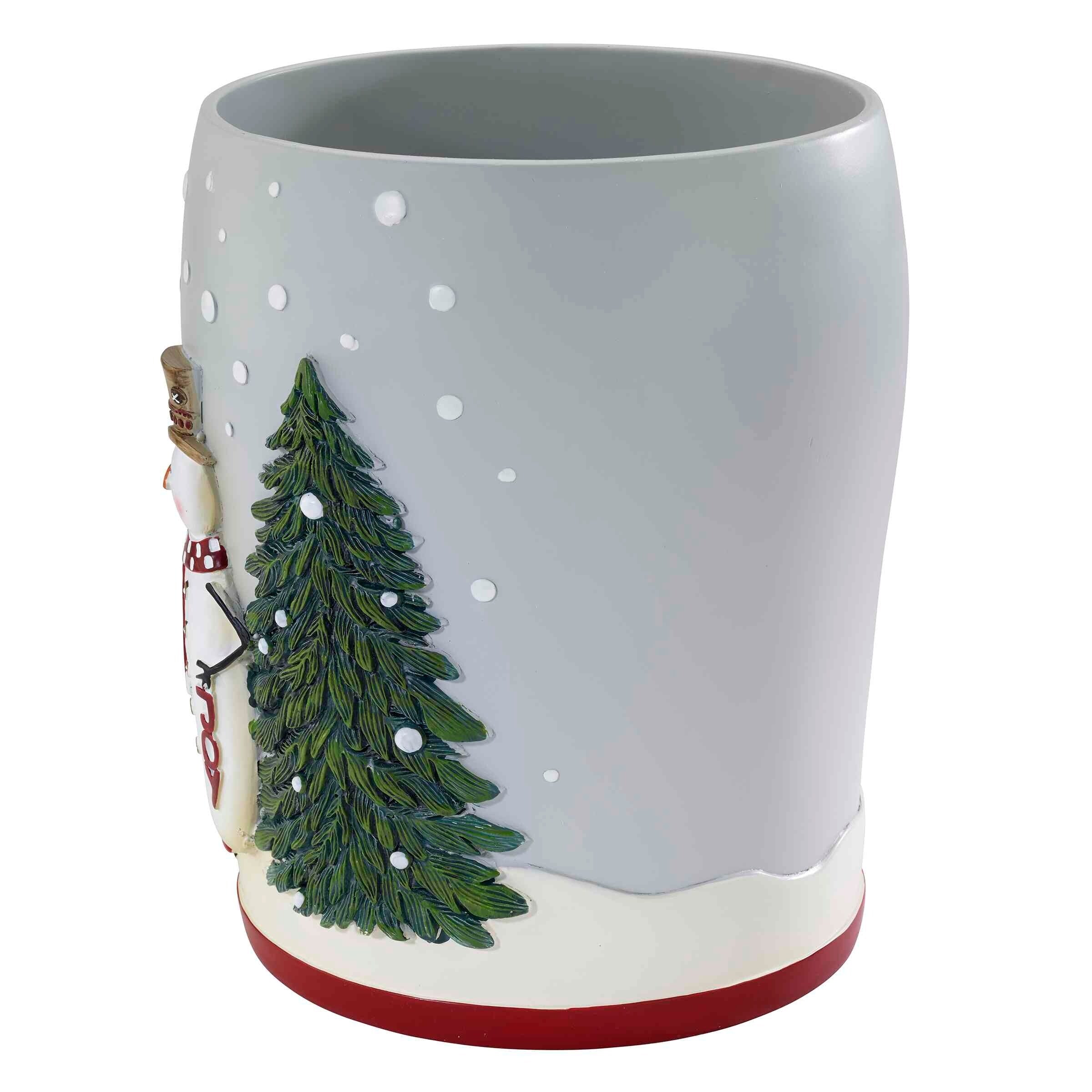 The Avanti Country Friends Wastebasket is decorated with two friendly snowmen with checked scarves and carrot noses, holding a 'peace' sign surrounded by two snowy pine trees. The base is grey with a coordinating red stripe on the bottom. Made of durable hand-painted resin.