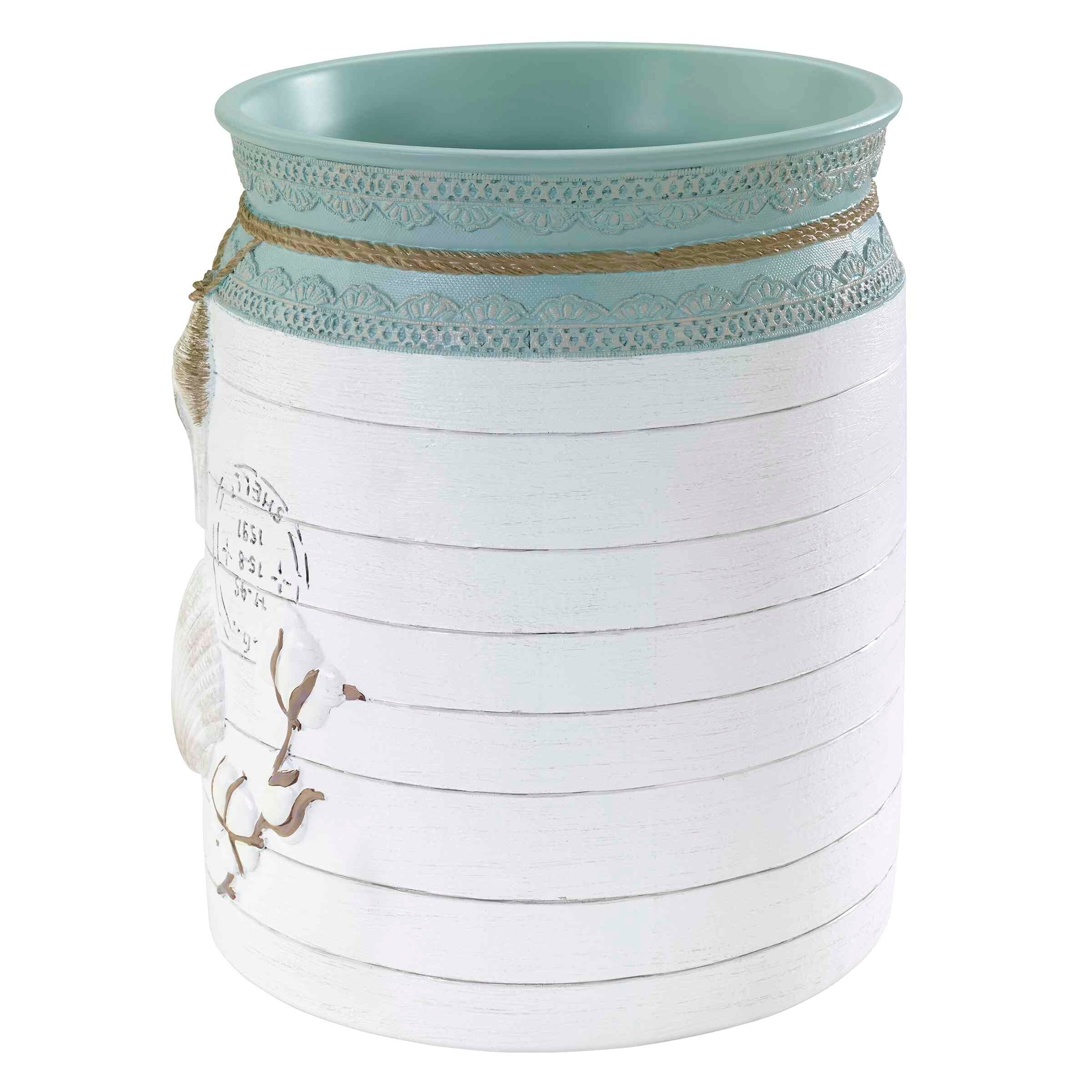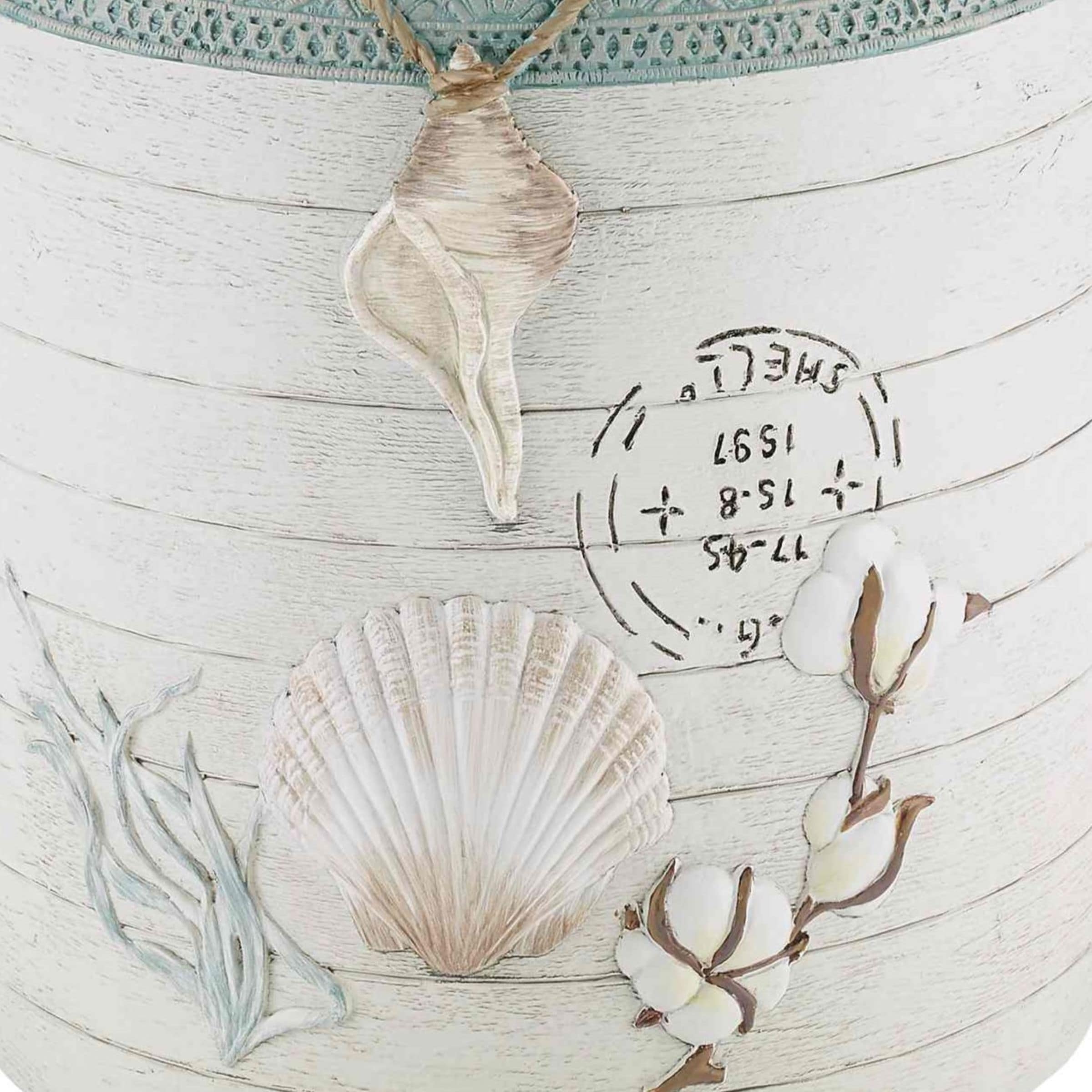 The Avanti Farmhouse Shell Wastebasket features a fan shell, coral and cotton on the vine with a shell medallion hanging on a faux rope in aqua and beige. The background is textured, off-white shiplap with a coordinating aqua border with lace on top. Made of durable, hand-painted resin.