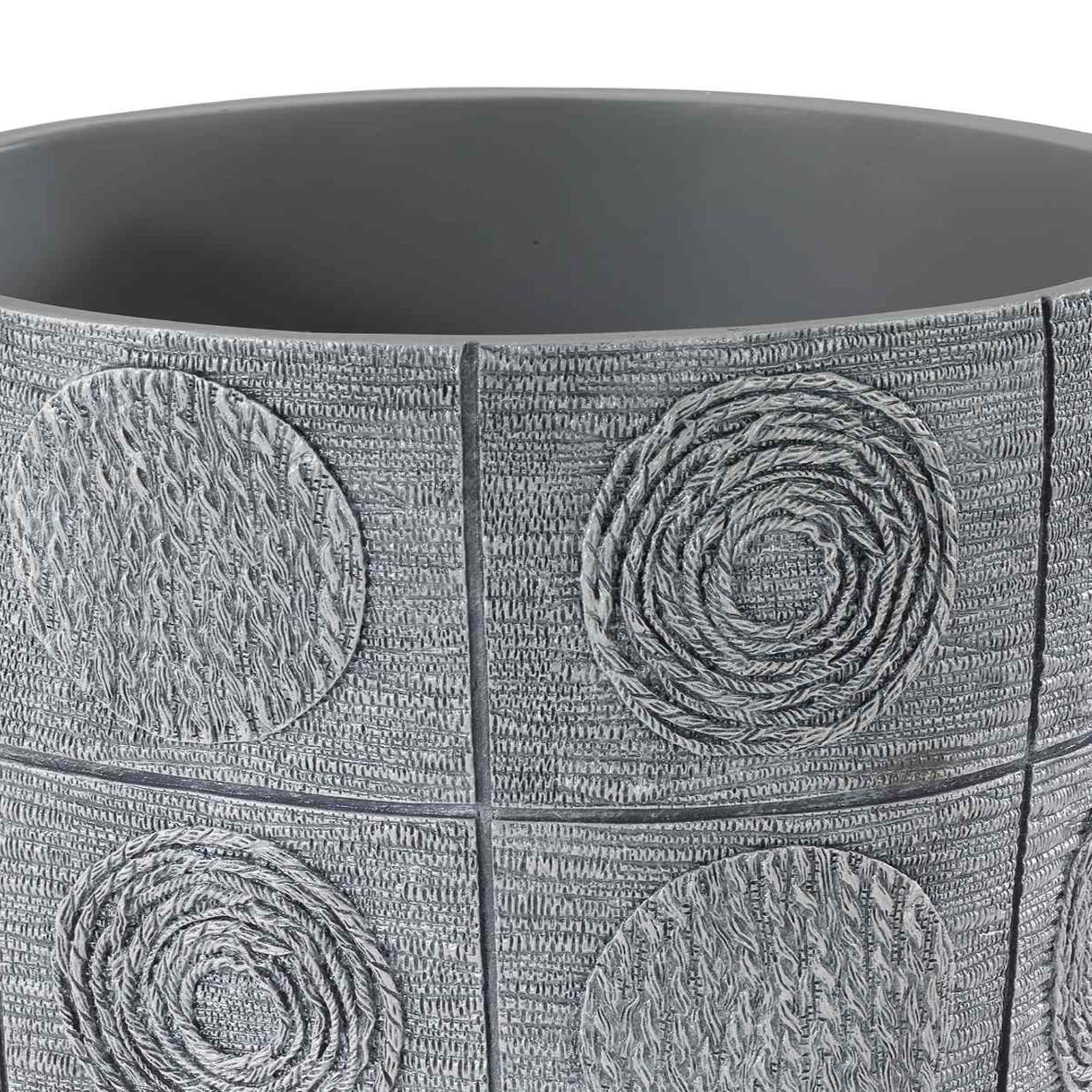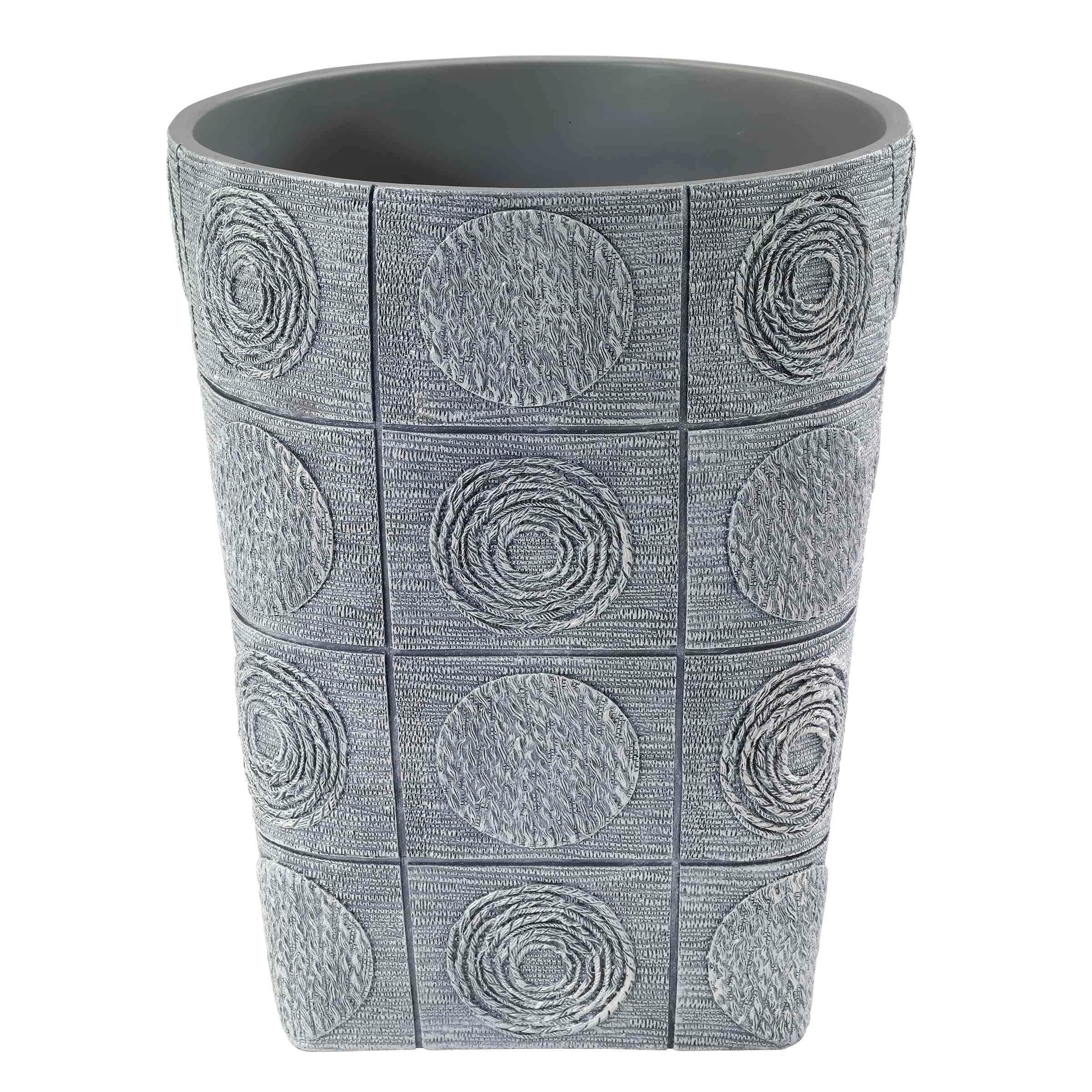 The Avanti Galaxy Decorative Wastebasket features a contemporary geometric design with different silver and grey textured circles centered in textured boxed squares. Made of durable, hand-painted resin. Coordinating shower curtain, towels, rug and accessories available.