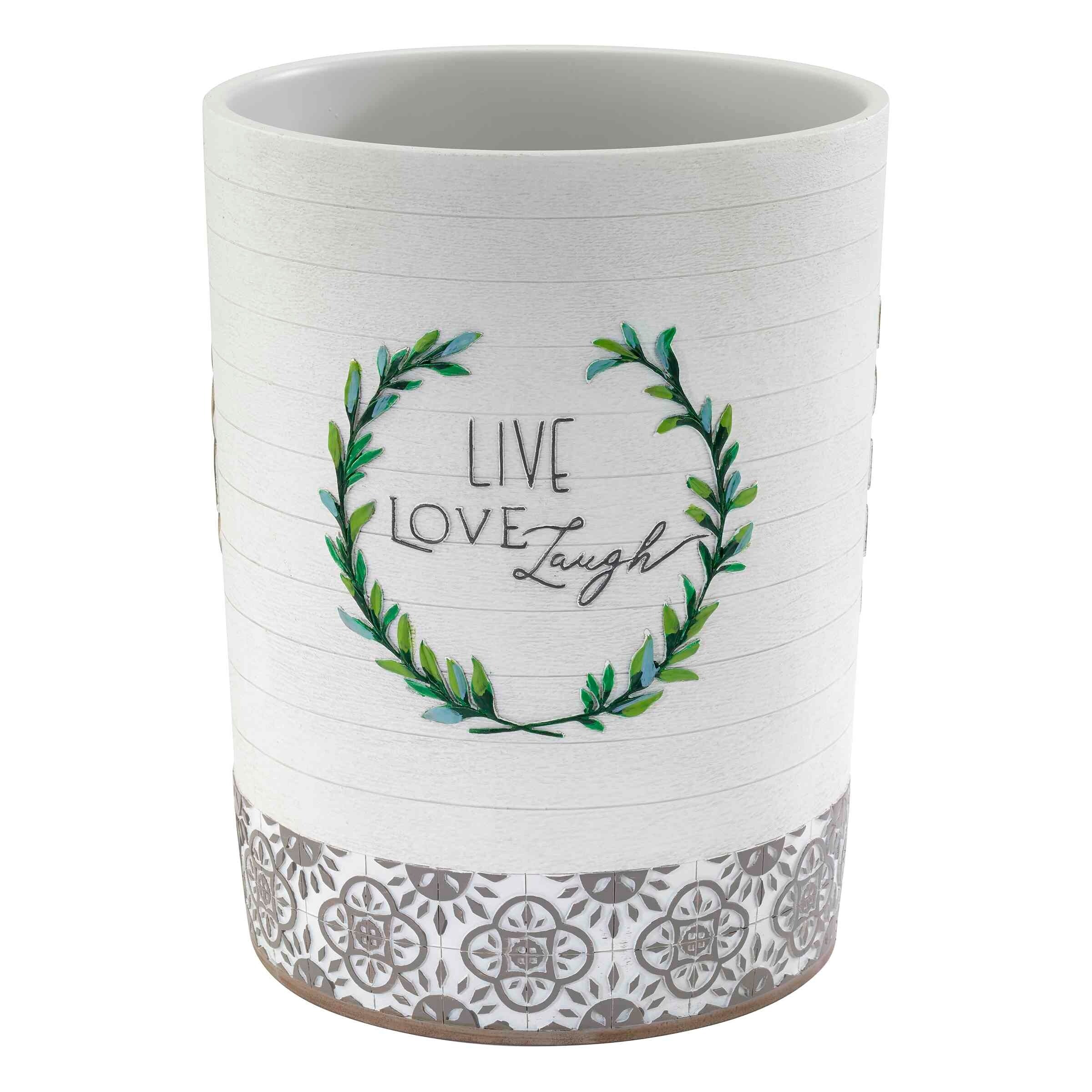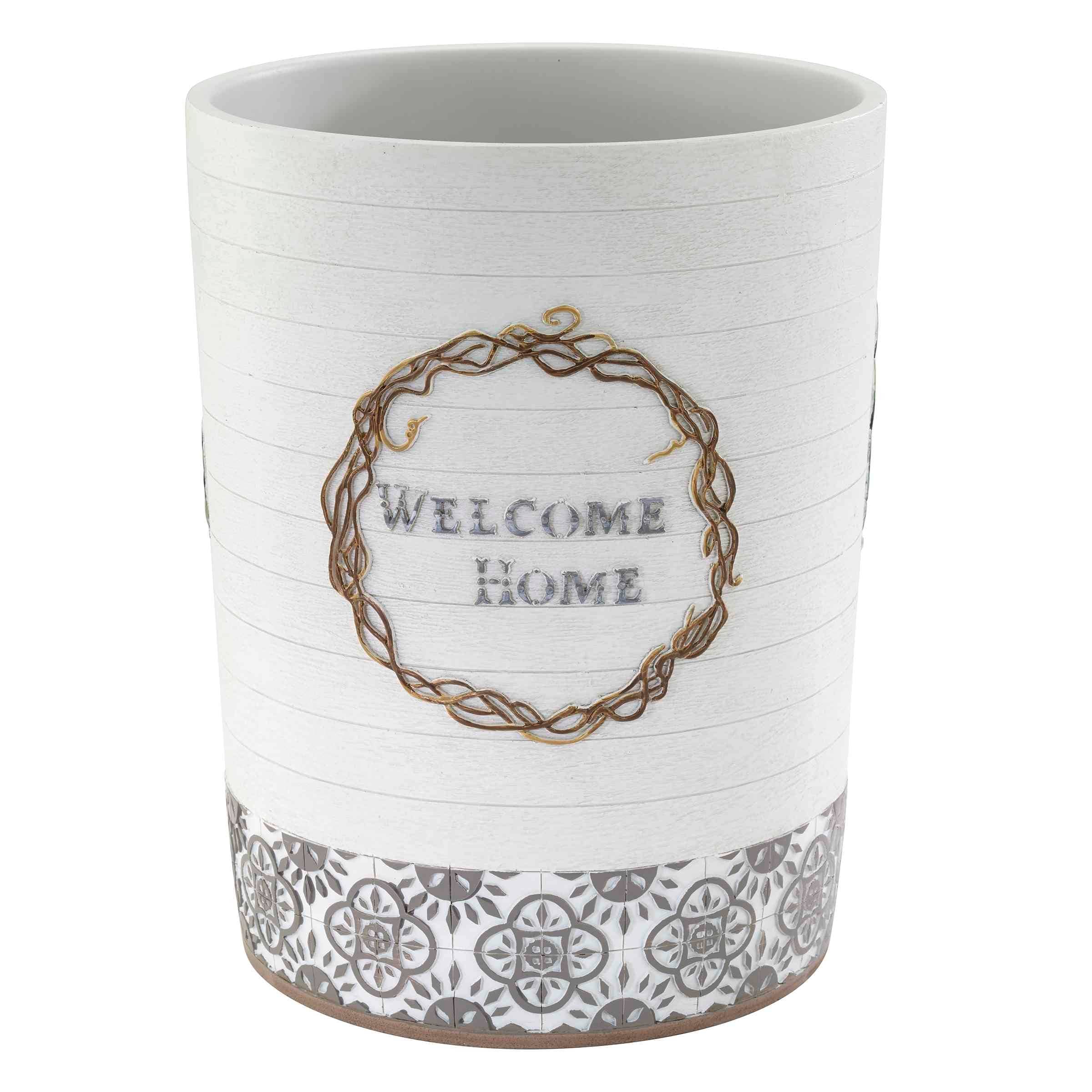 The Avanti Modern Farmhouse Decorative Wastebasket is decorated with 'Home & Family, Friends, Faith' in various fonts on white a shiplap ground. Medallion border wraps the bottom. Coordinating accessories, towels, rug and shower curtain also available,