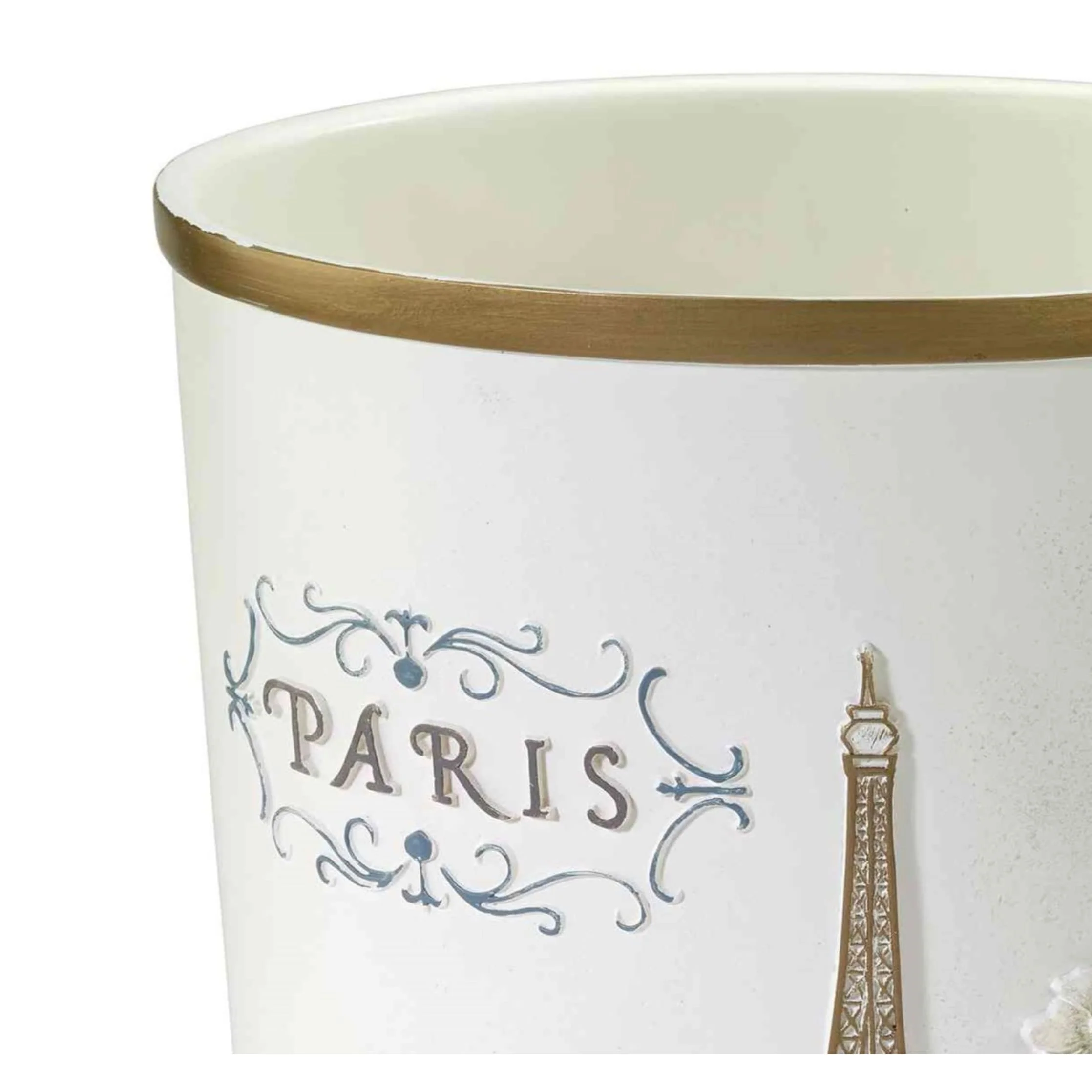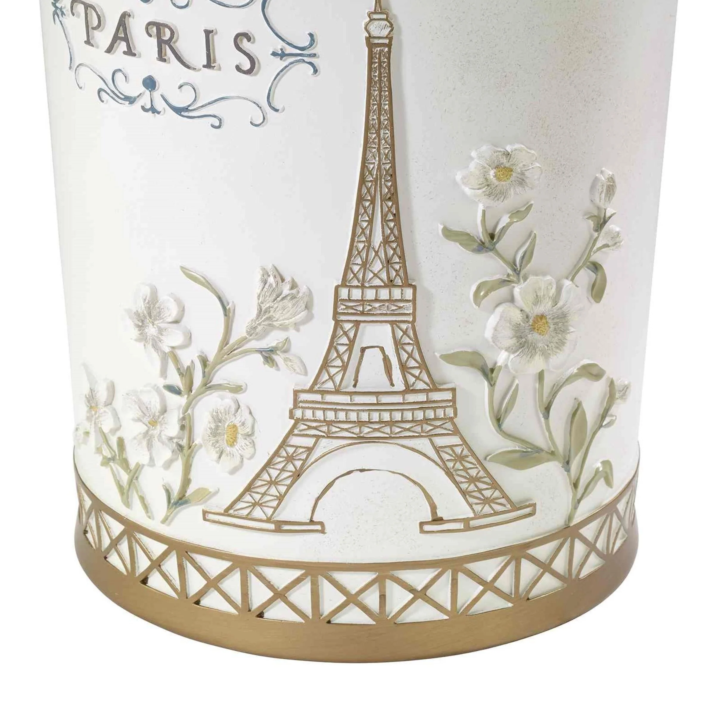 The Avanti Paris Botanique Wastebasket features a large Eiffel Tower and 'Paris' in grey surrounded by scrollwork with flowers on an off-white base. The bottom is bordered with a gold Eiffel Tower grid. Crafted in durable resin, hand-painted. Accessories, rug, towels and shower curtain available.