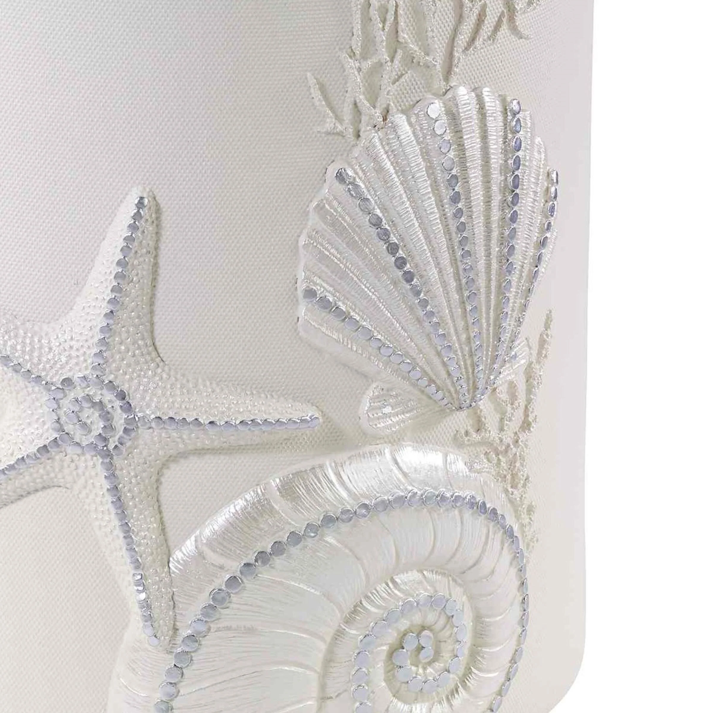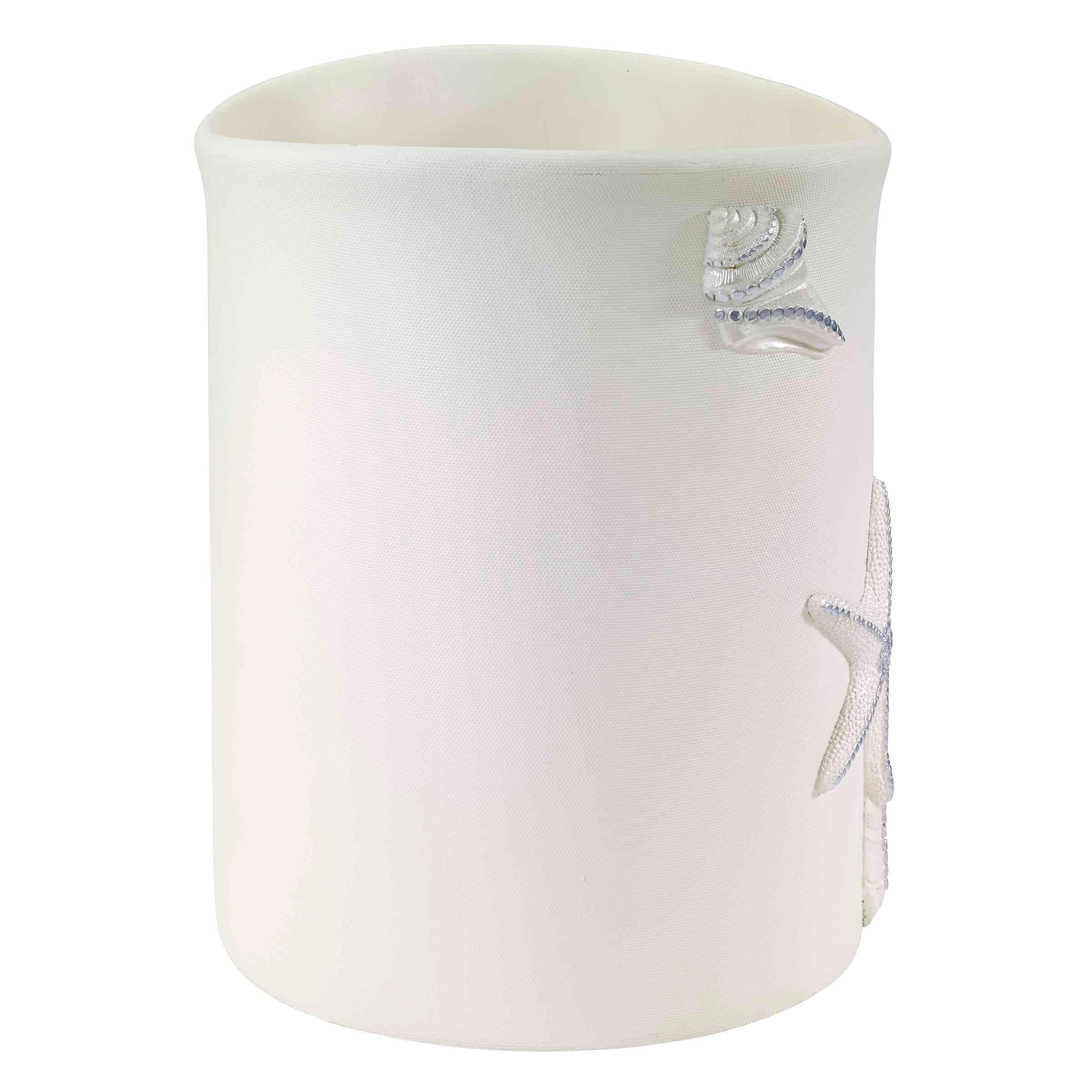 The Avanti Sequin Shells Decorative Wastebasket features an ivory textured body with a raised fan shell, nautilus, coral and starfish with silver highlights. Perfect for any bathroom, office or bedroom. Coordinating accessories, shower curtain, rug and towels available.