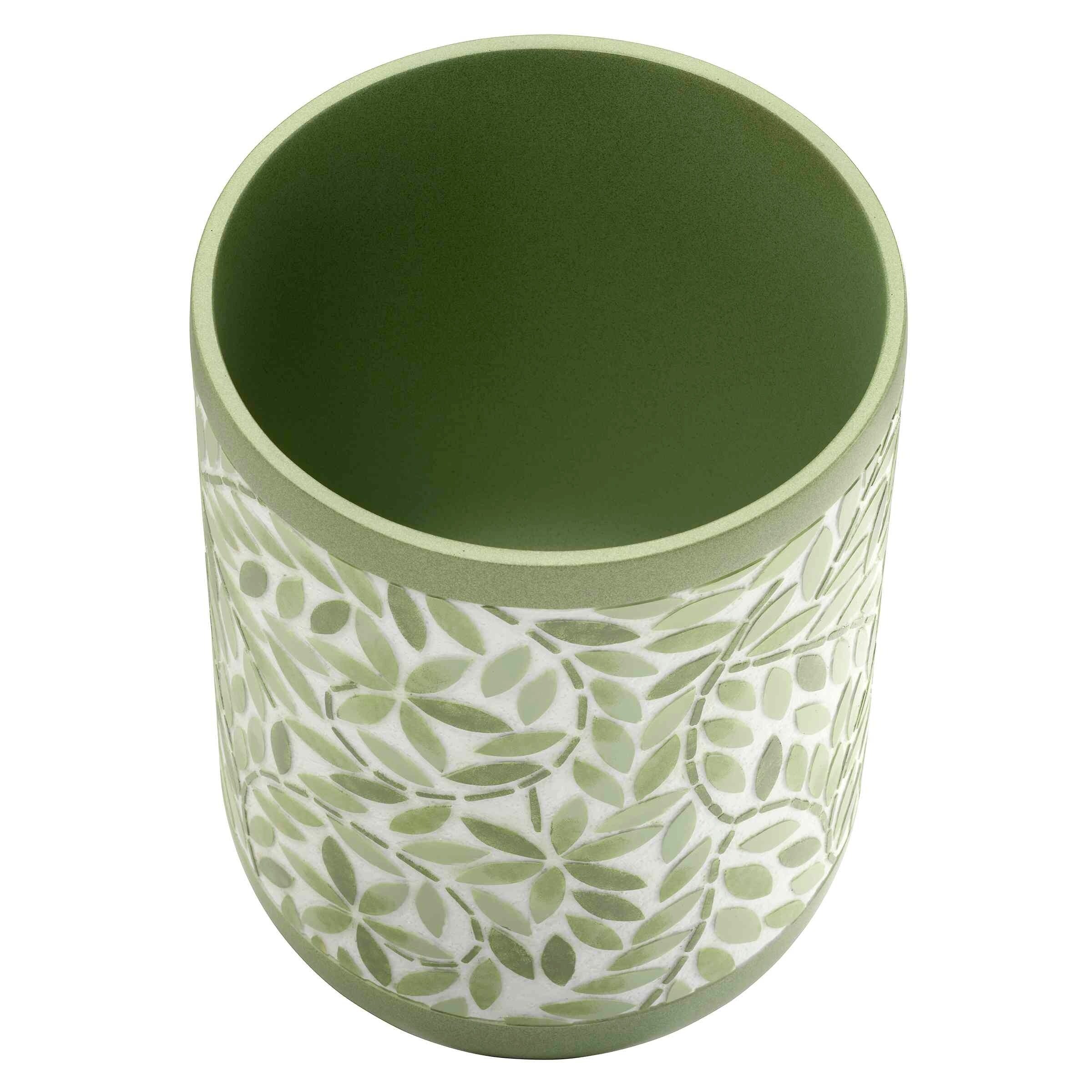 The Avanti Stratford Green Wastebasket features a raised leaf and vine design in various shades of green with a matching top border and base. Made of durable, hand-painted resin for easy care and long life. Other matching accessories available.