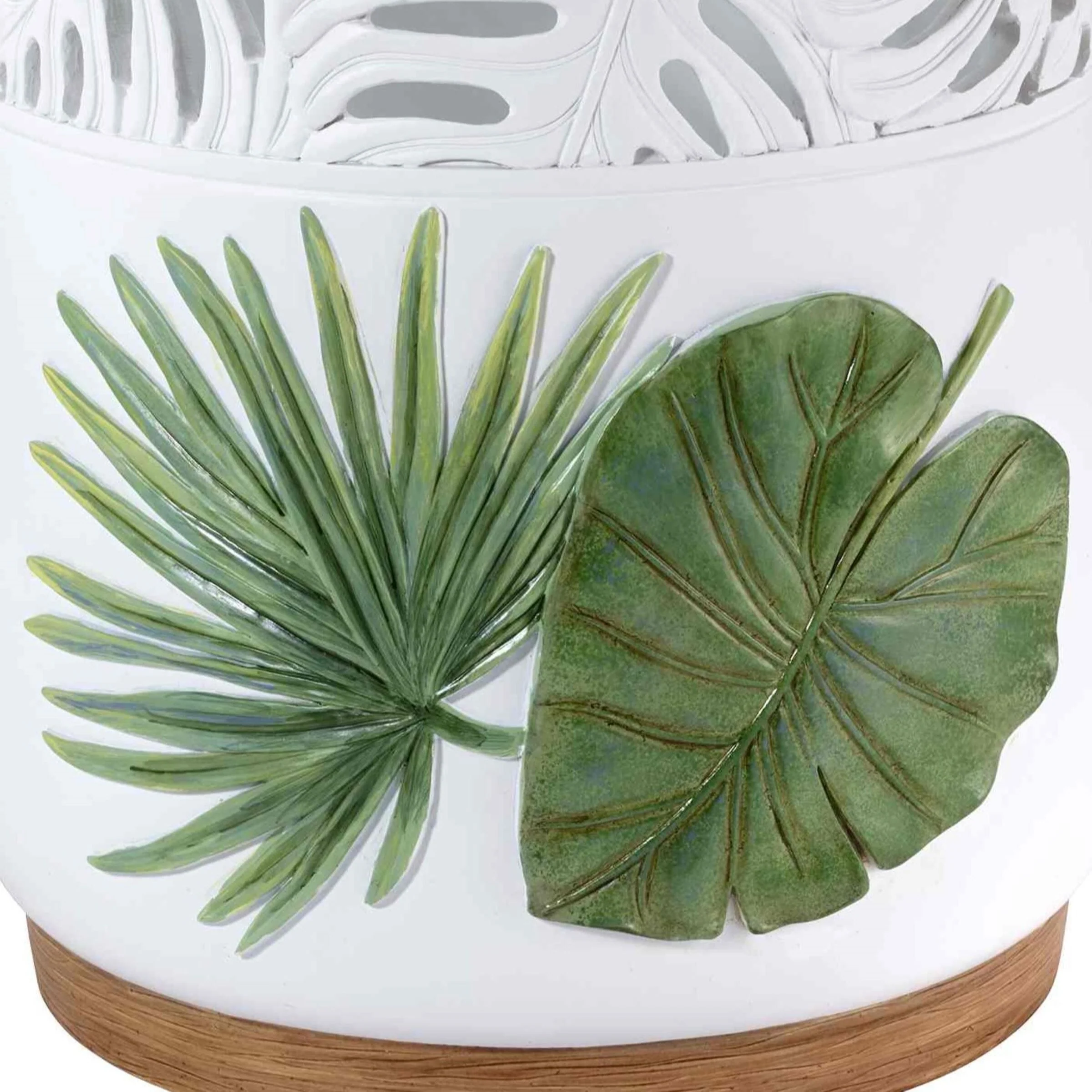 The Avanti Viva Palm Wastebasket features a textural white leaf cut-out background with large three-dimensional philodendron and petticoat palm leaves in multiple shades of green. The base is decorated with a faux-wood finish. Made of durable, hand-painted resin for long-lasting use.