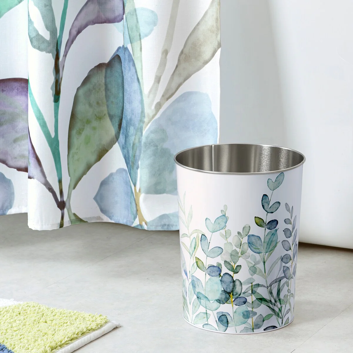 Give your bathroom a refreshing makeover with the Botanical Wastebasket by Allure Home Creation. This beautiful can is made of metal printed with a flowing array of abstract leaves in soothing watercolor shades on a white ground. The interior is finished in a solid chrome color. Both decorative and functional, it will work well in your bathroom or bedroom and will easily fit in most spaces. The soft, relaxed feeling of this design will bring a feeling of calm to your peaceful bathroom retreat. Hand Wash, Spot or Wipe Clean. Complete the look by coordinating with other pieces in the Botanical Bath Collection or use alone.