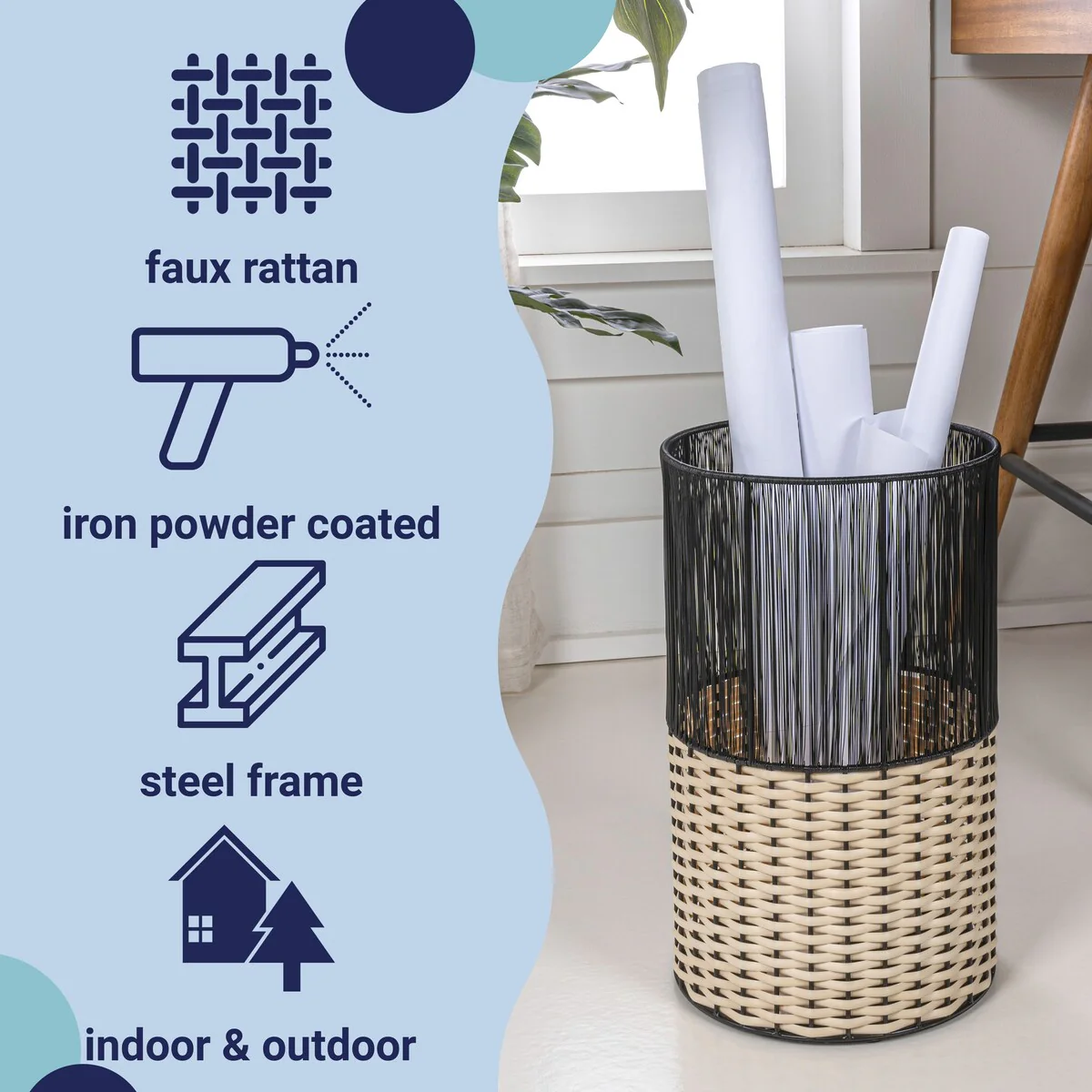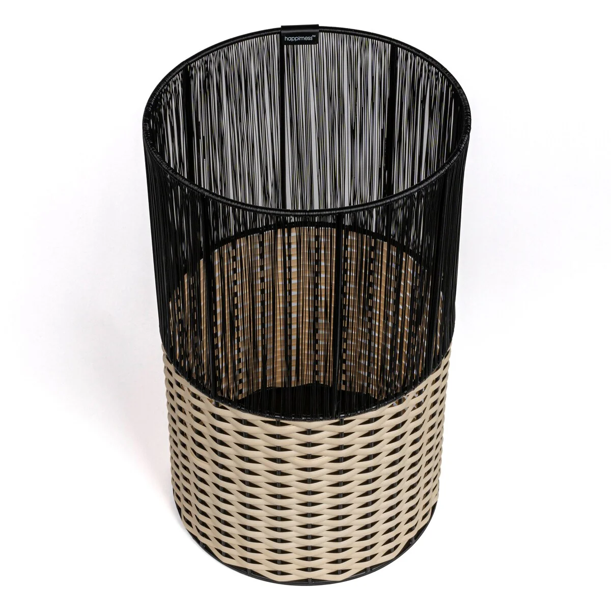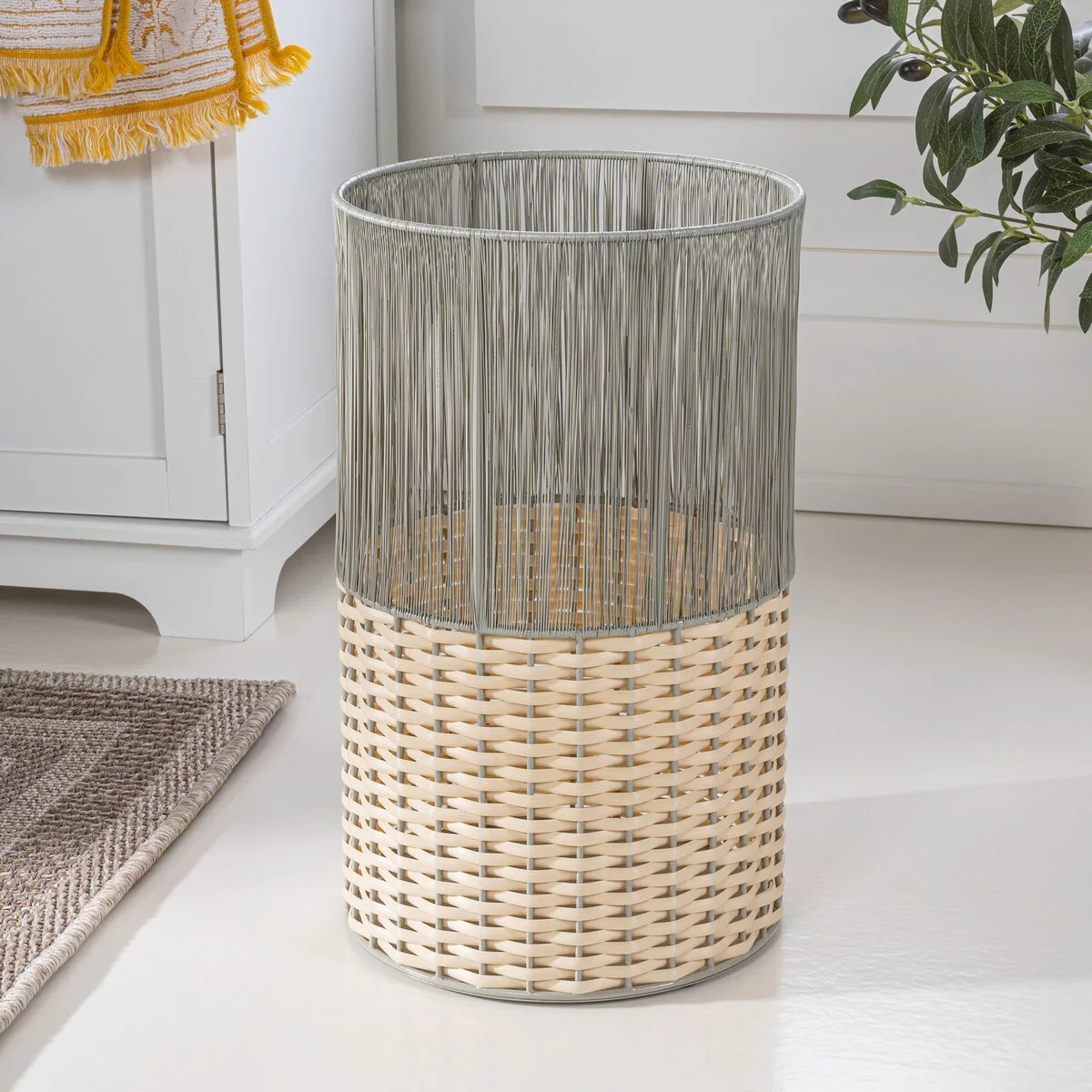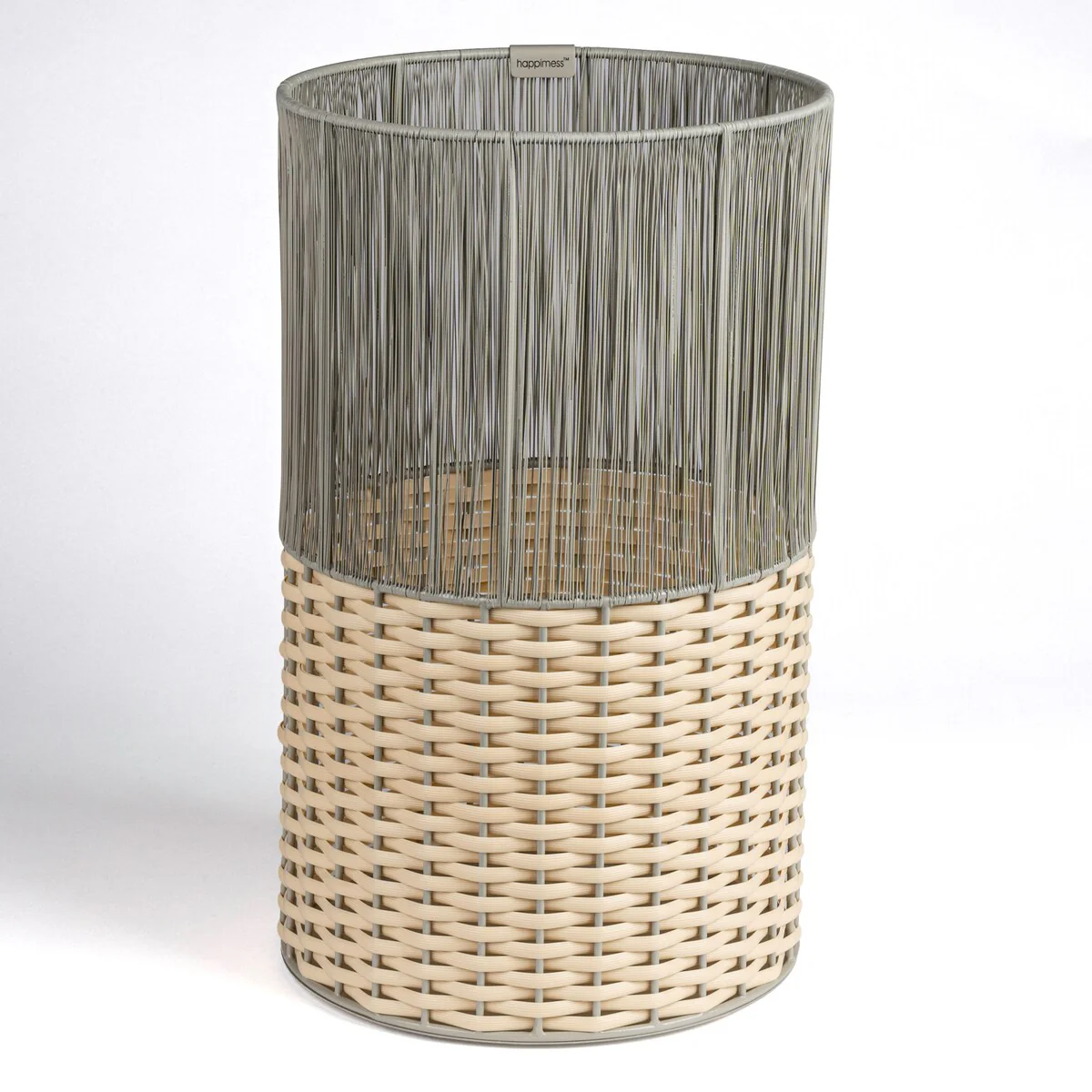 Add modern color and texture to your home with our two-tone wicker trash can. This slim wastebasket is the perfect shape to tuck into a small bathroom, bedroom or office. Durable enough for outdoor use, it's made from synthetic wicker woven onto a steel frame.