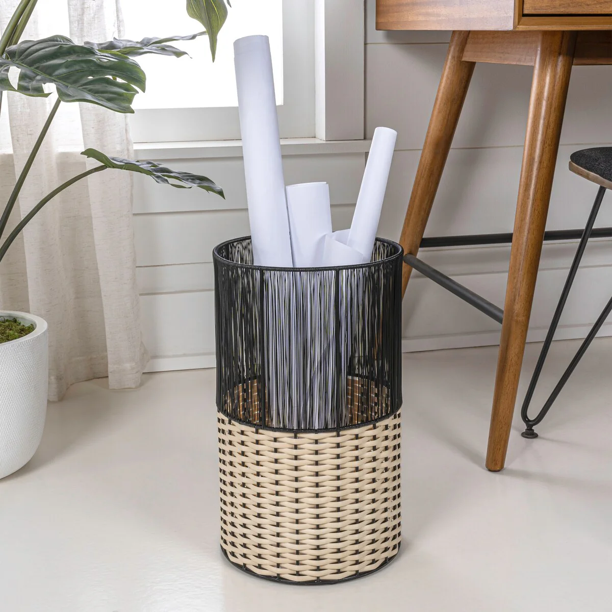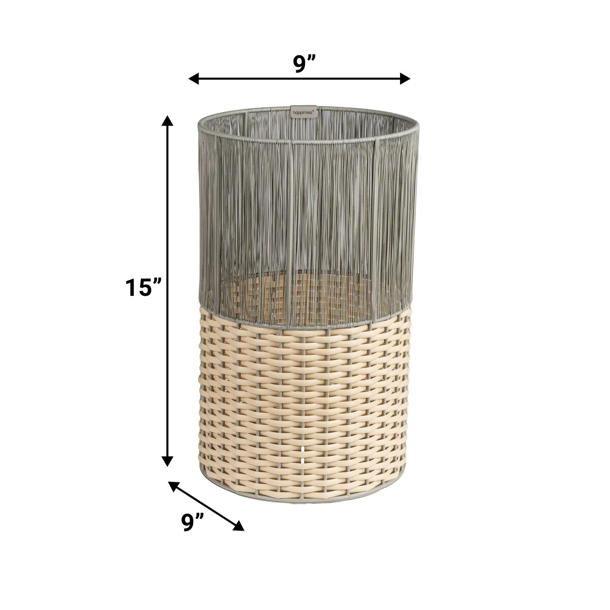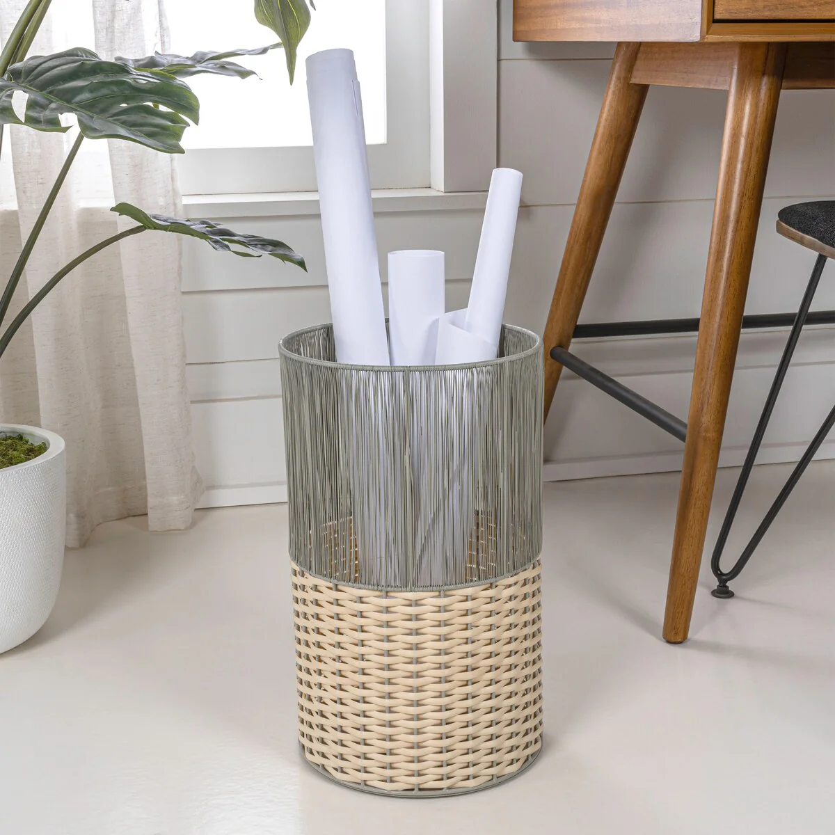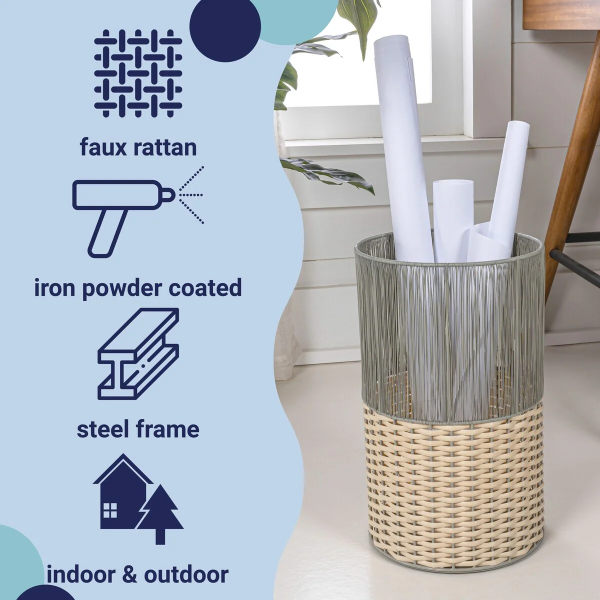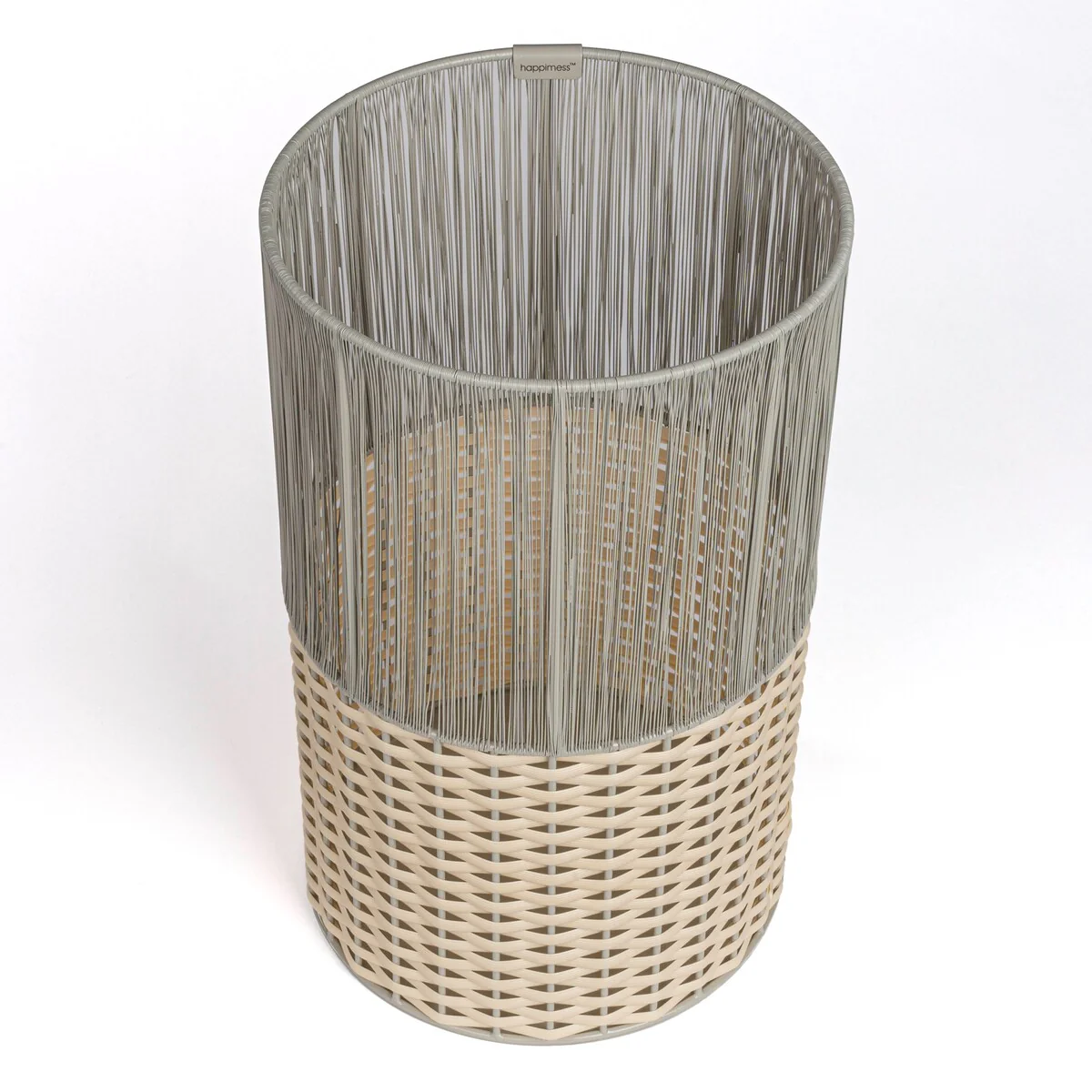 Add modern color and texture to your home with our two-tone wicker trash can. This slim wastebasket is the perfect shape to tuck into a small bathroom, bedroom or office. Durable enough for outdoor use, it's made from synthetic wicker woven onto a steel frame.