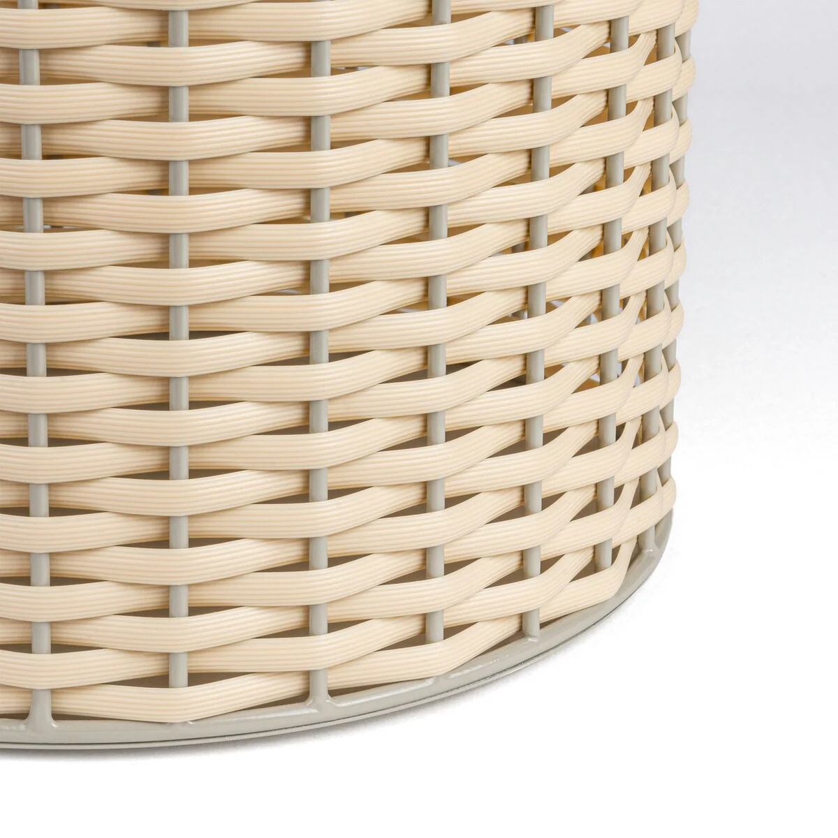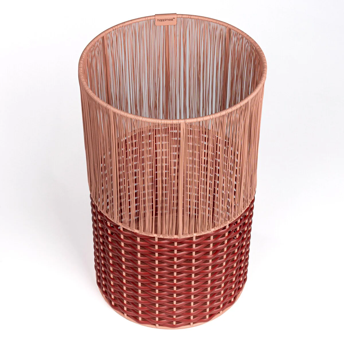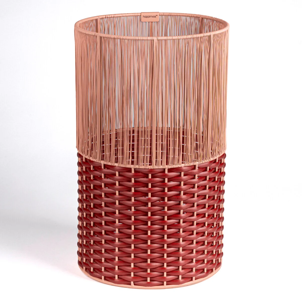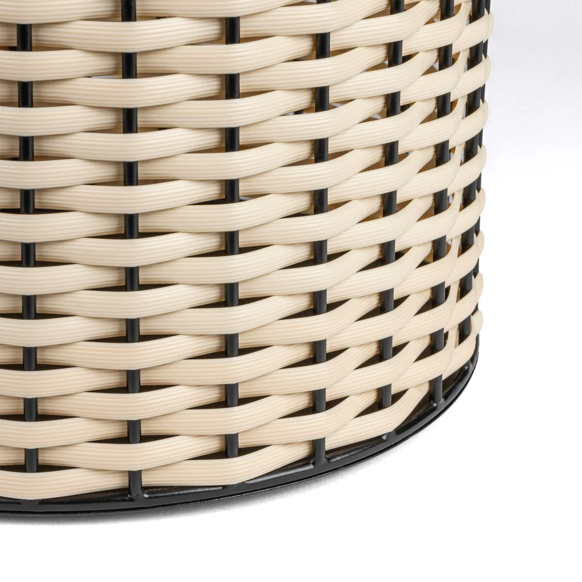 Add modern color and texture to your home with our two-tone wicker trash can. This slim wastebasket is the perfect shape to tuck into a small bathroom, bedroom or office. Durable enough for outdoor use, it's made from synthetic wicker woven onto a steel frame.
