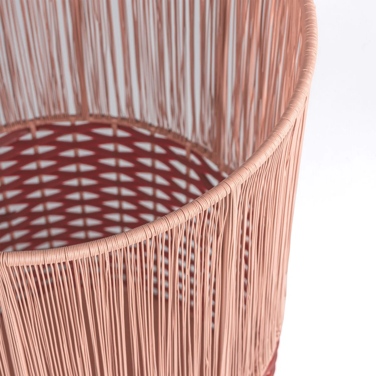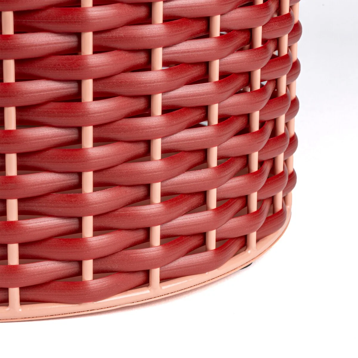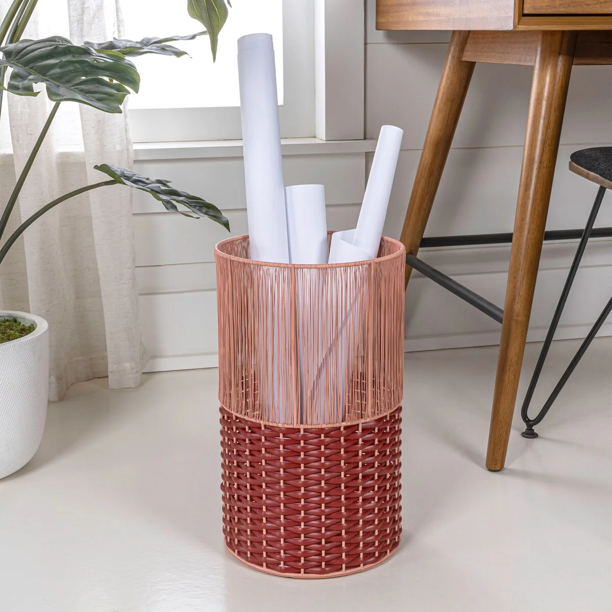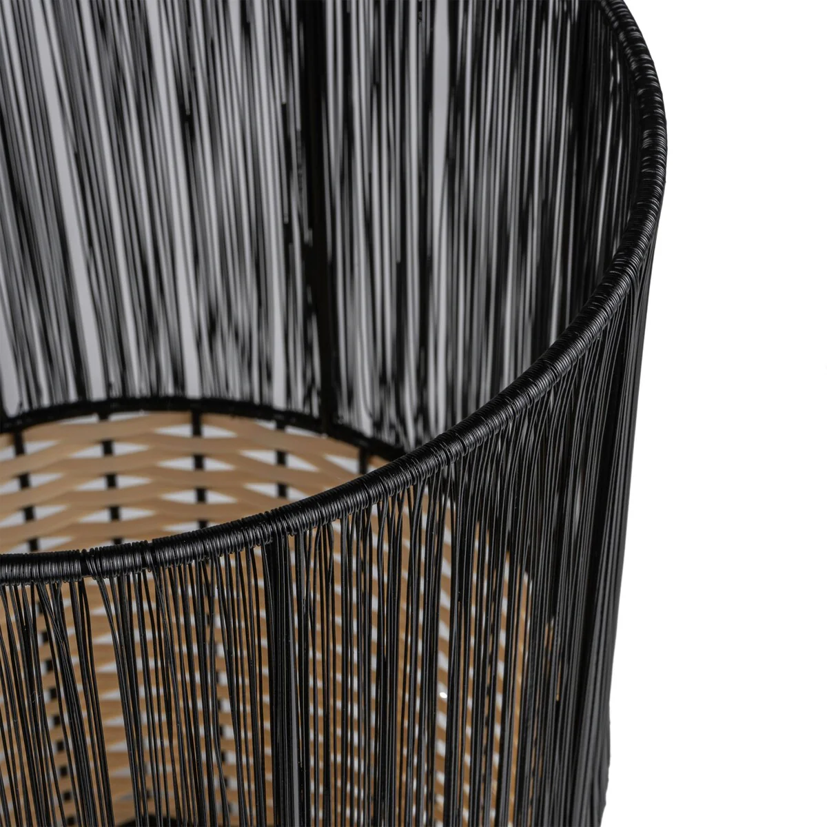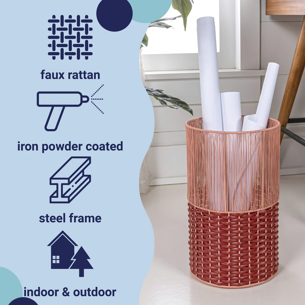 Add modern color and texture to your home with our two-tone wicker trash can. This slim wastebasket is the perfect shape to tuck into a small bathroom, bedroom or office. Durable enough for outdoor use, it's made from synthetic wicker woven onto a steel frame.
