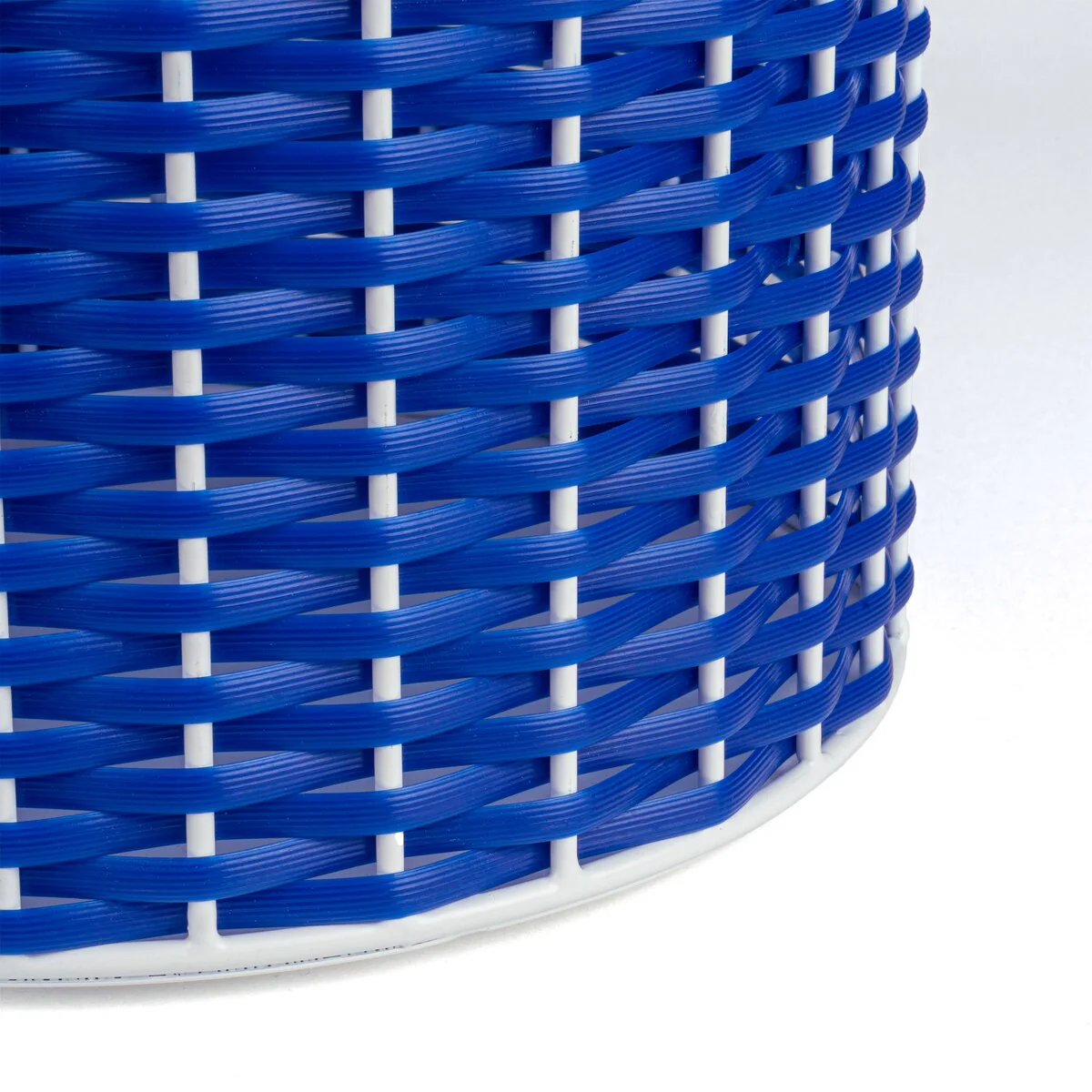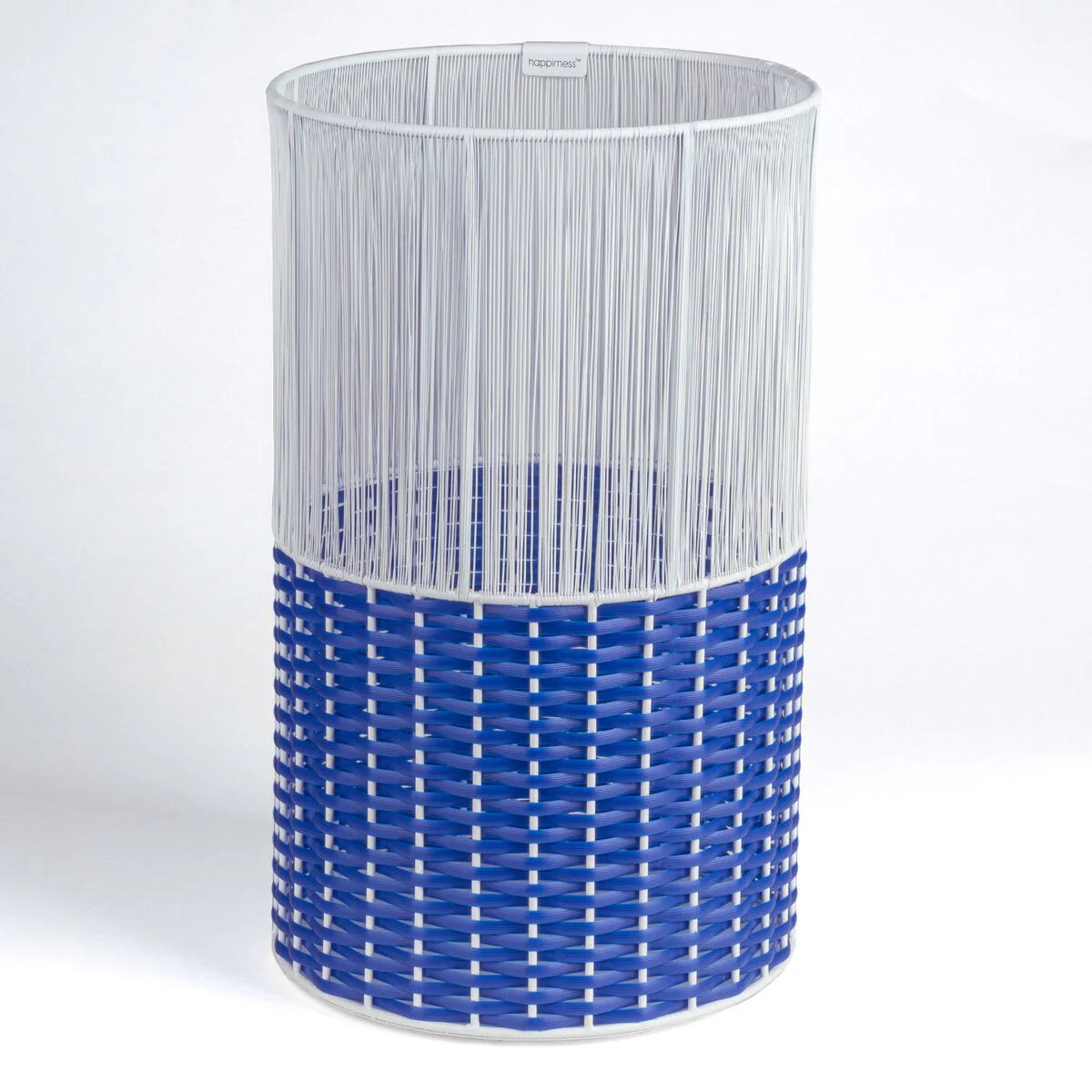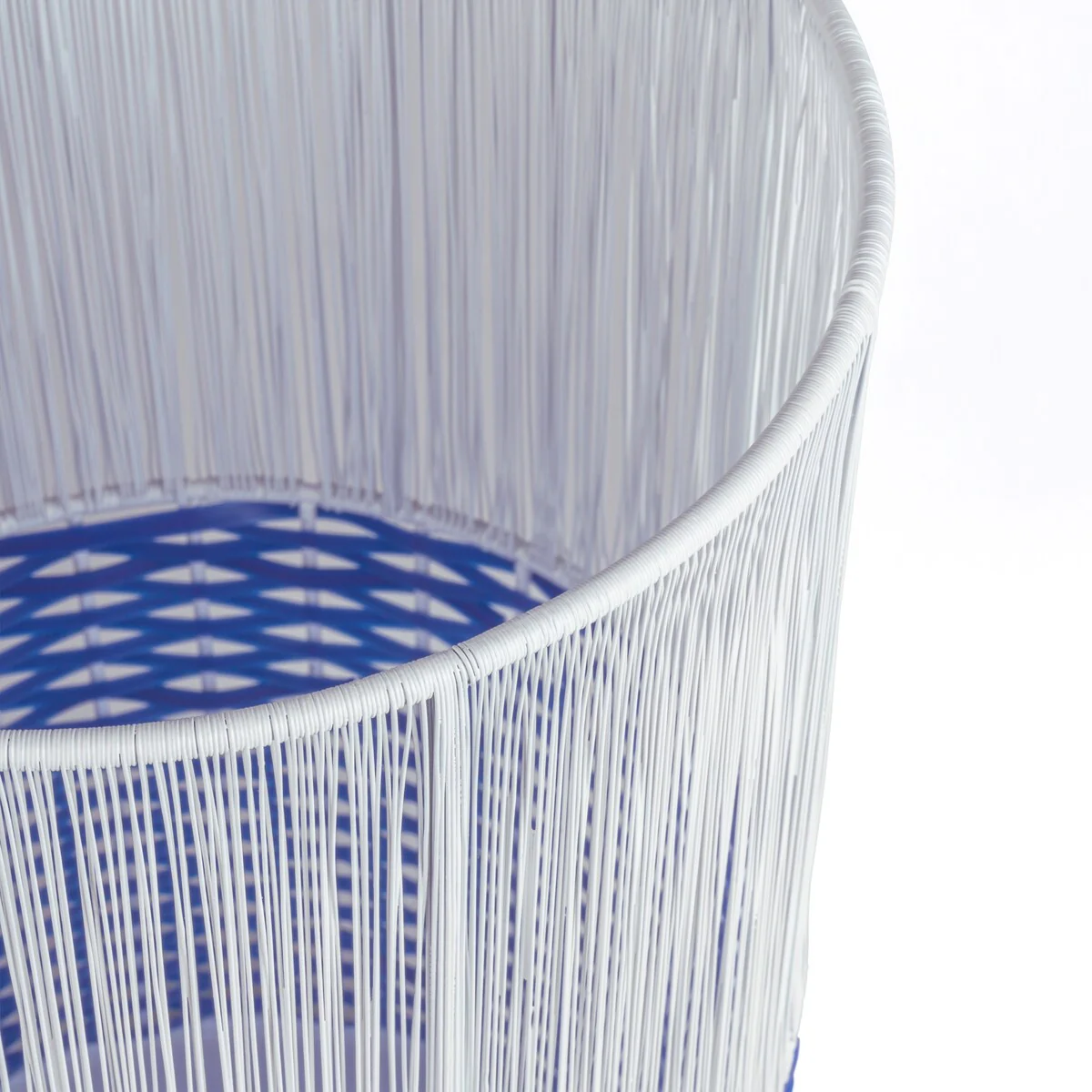 - White-toned string on the top section contrasts with blue wicker on the bottom