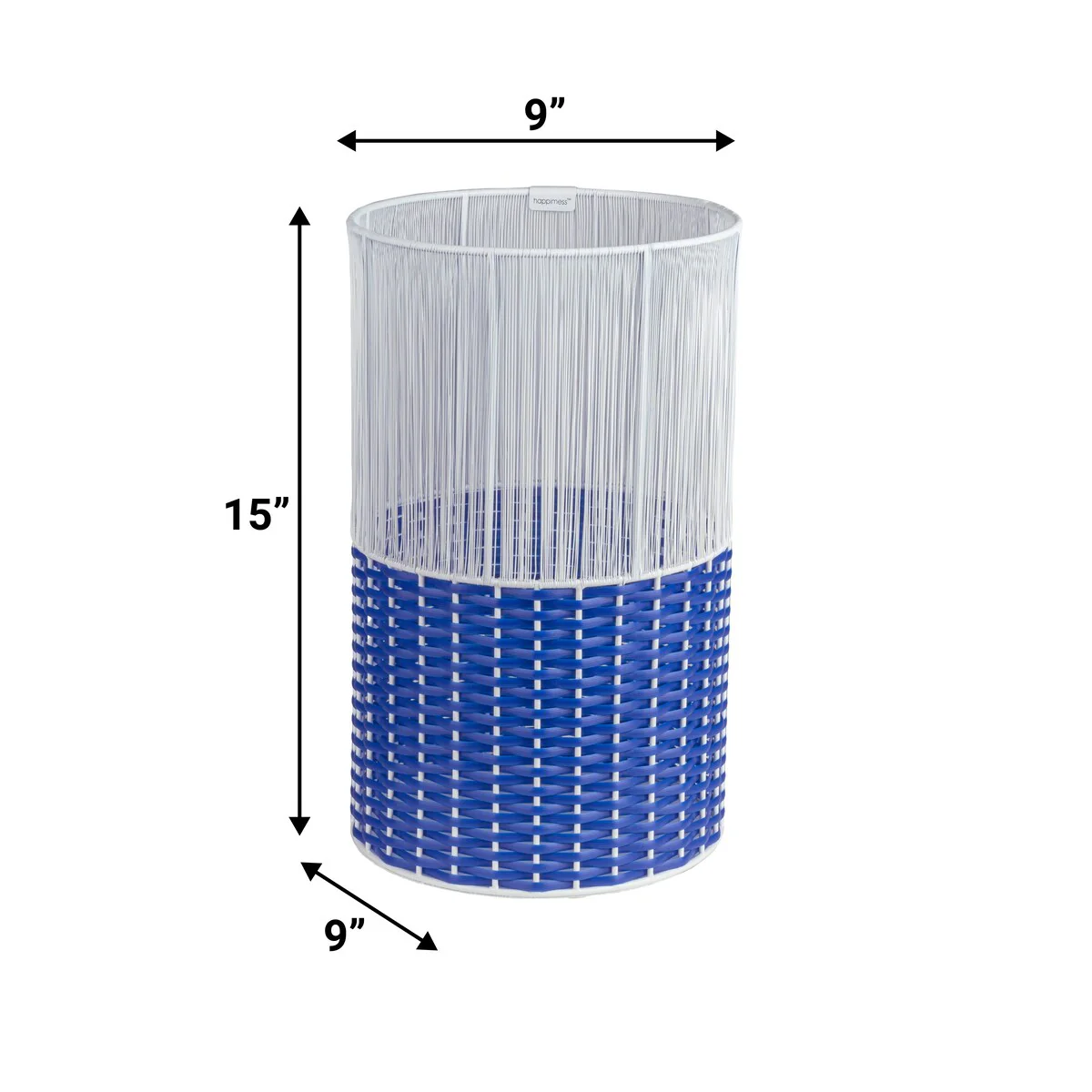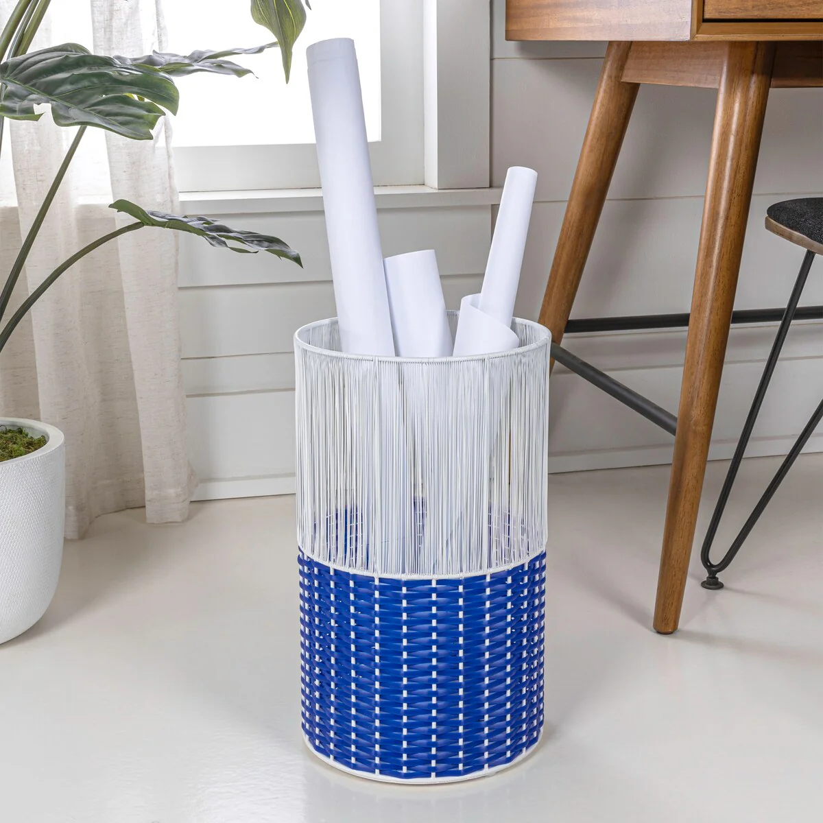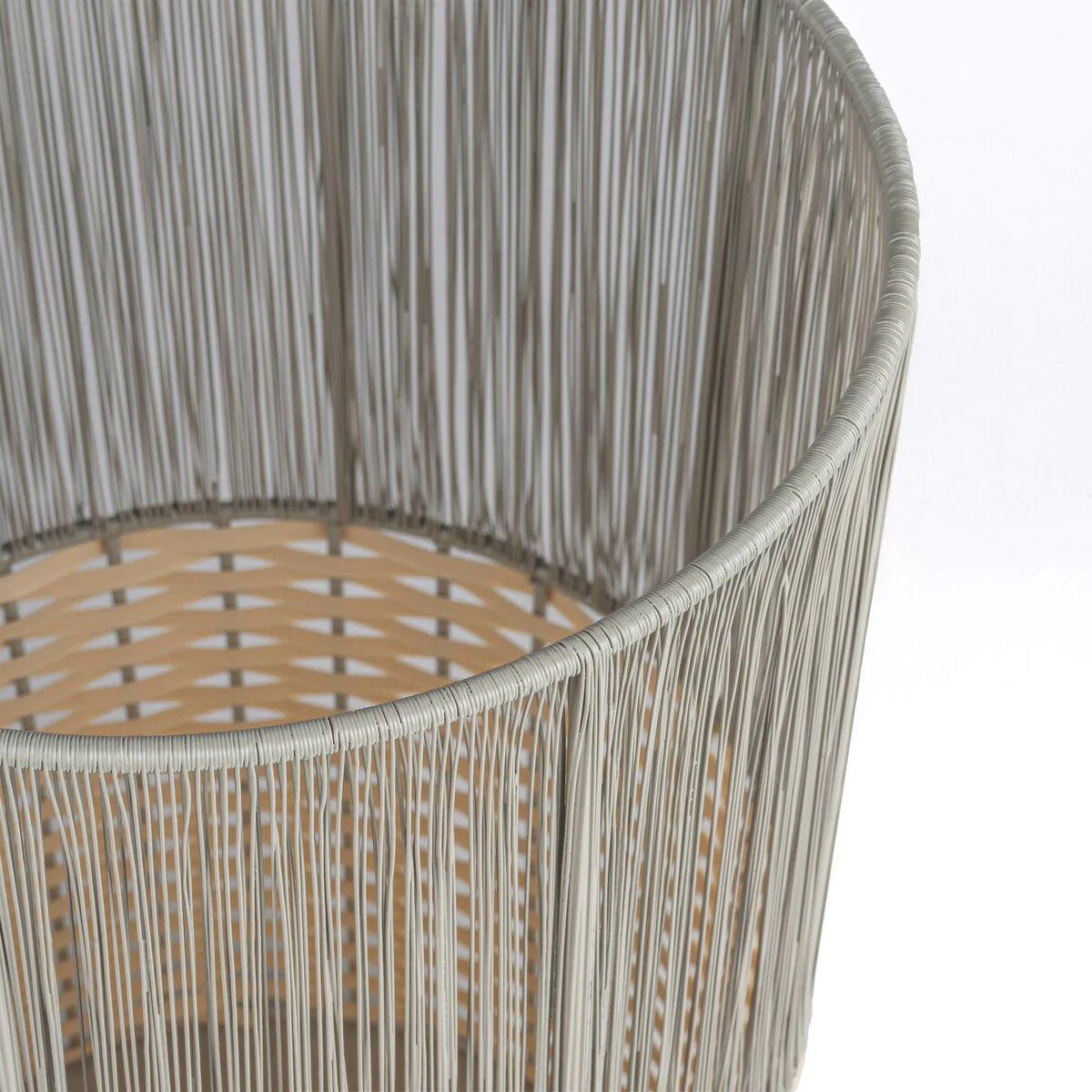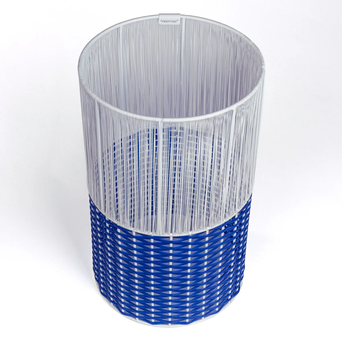 - White-toned string on the top section contrasts with blue wicker on the bottom