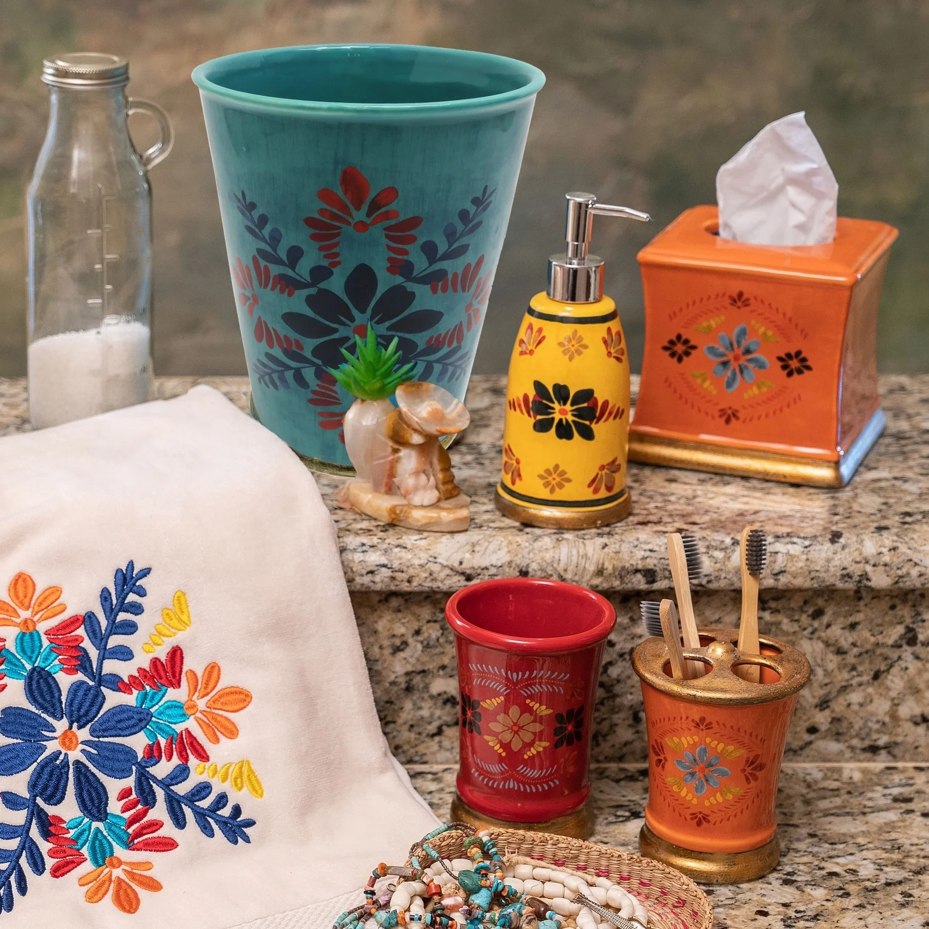 Add a Southwestern touch to your room with the Bonita Waste Basket. Inspired by classic Talavera pottery, the beautiful floral pattern and rich turquoise color adds a bright, playful touch to the space. Pair with our Bonita bathroom countertop accessories for a fun updated bathroom look. �