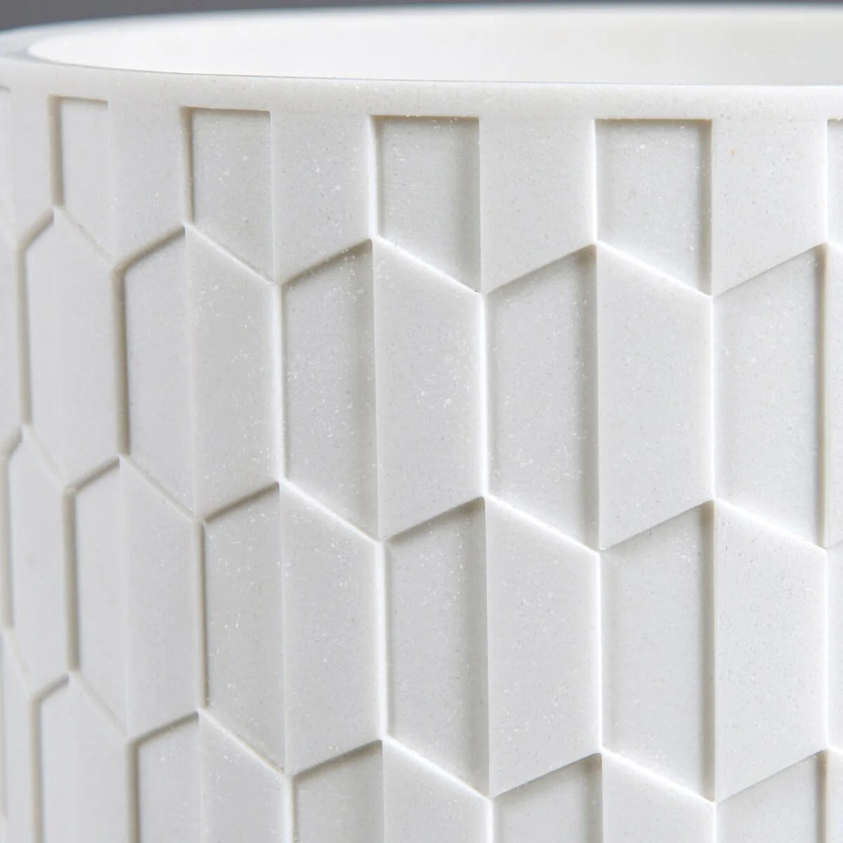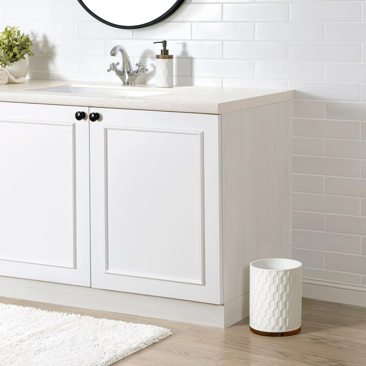 Add a crisp, clean touch to your bathroom with the Sarasota Wastebasket by Allure Home Creation. This cylindrical embossed can, crafted from resin mixed with crystal sand in white with a subtle shimmery effect accented with a warm wood grain base, features a dimensional geometric design. Both decorative and functional, it will work well in your bathroom, bedroom or other rooms in your home and will easily fit in most spaces. This eye-catching piece will add sophisticated style and textural appeal to your bathroom. Use alone or coordinate with other matching pieces in the Sarasota Bath Collection. Spot or Wipe Clean.�