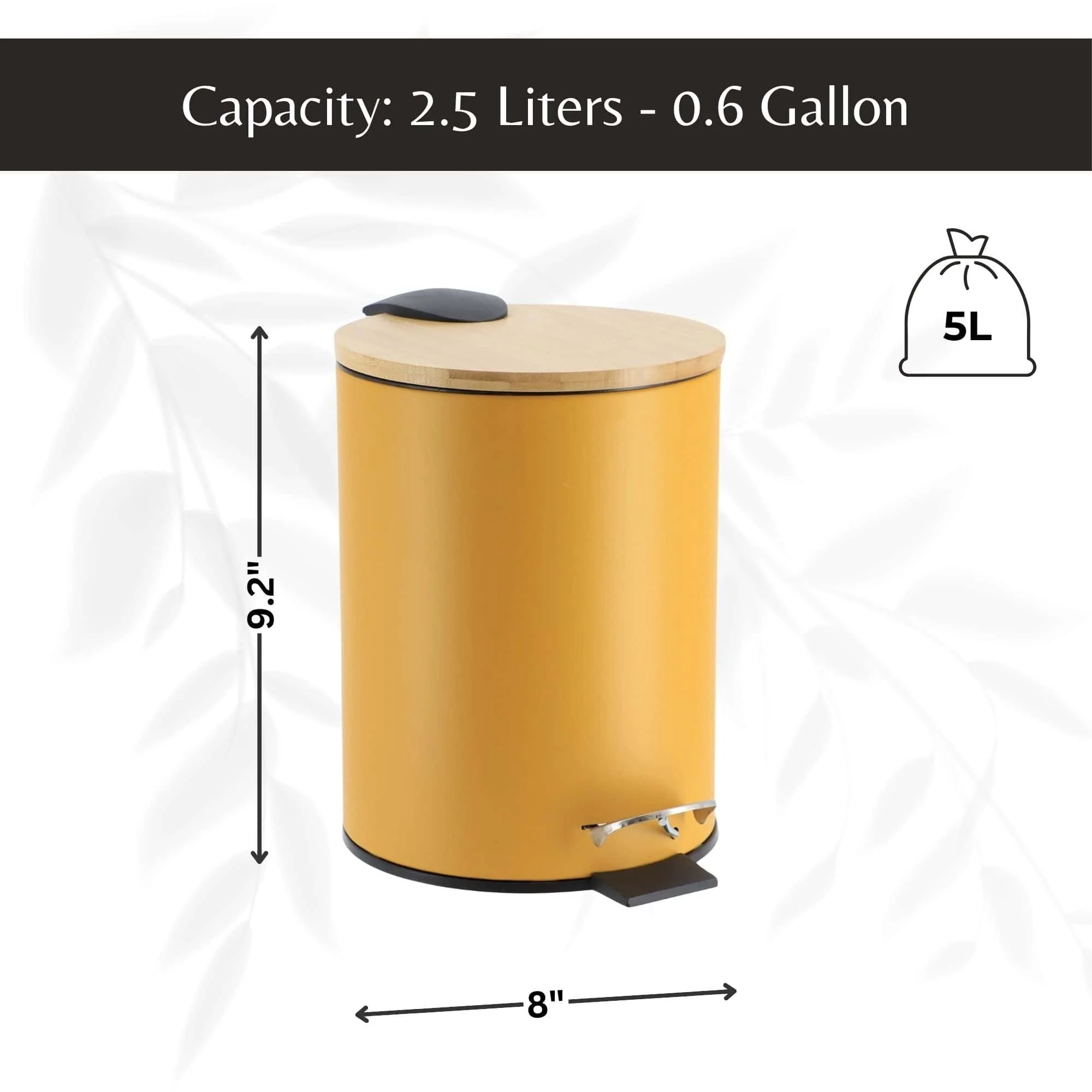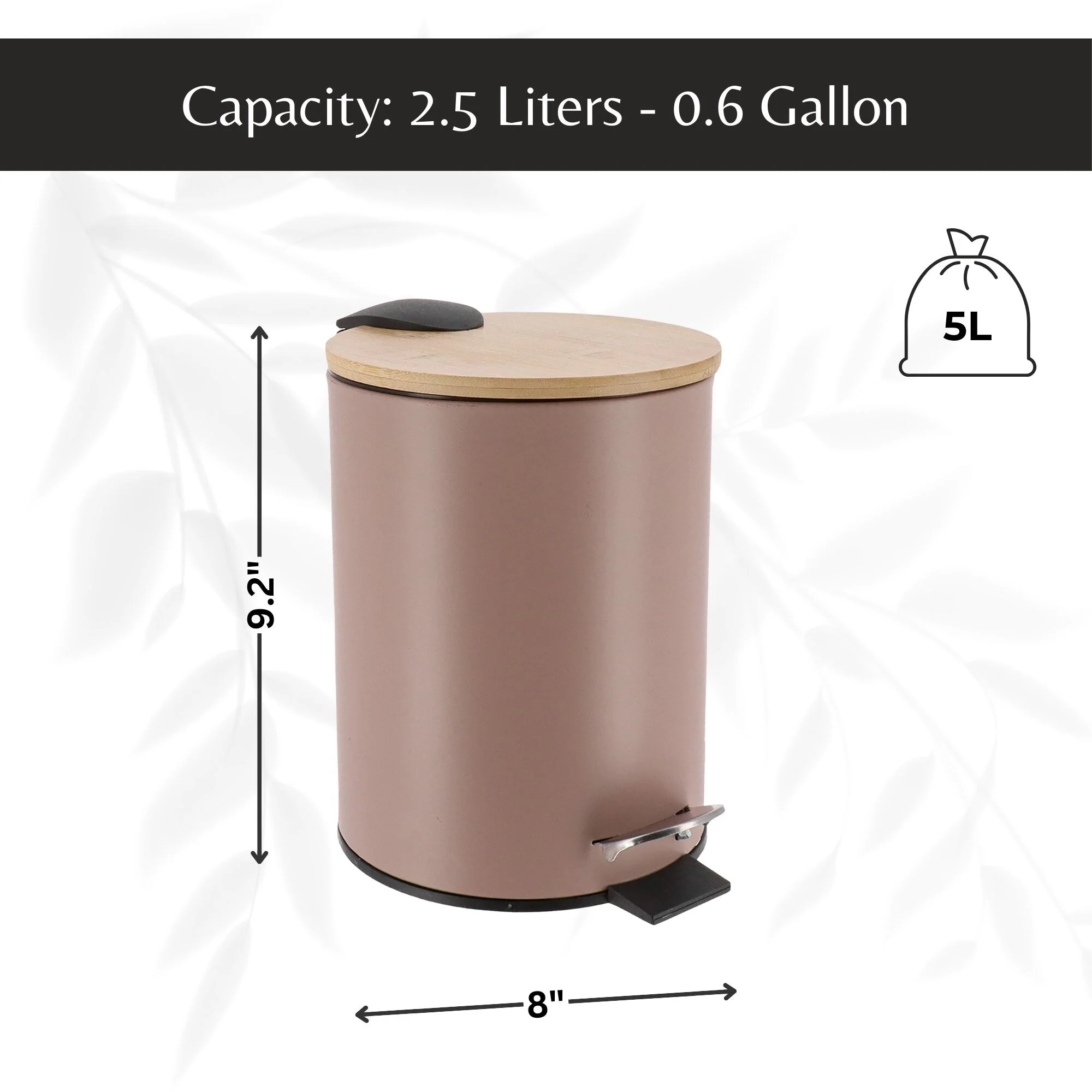 - COMPACT DESIGN: Space-saving trash can with a 2.5L (0.6-gallon) capacity, ideal for small spaces. Dimensions: 9.2''H x 8''L x 8''W