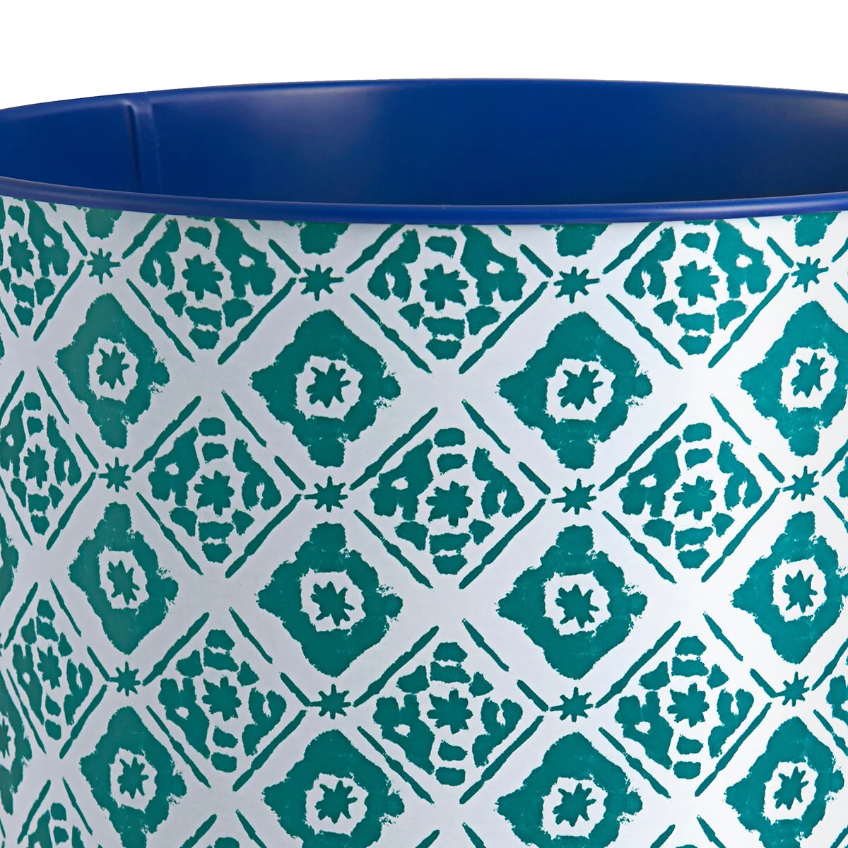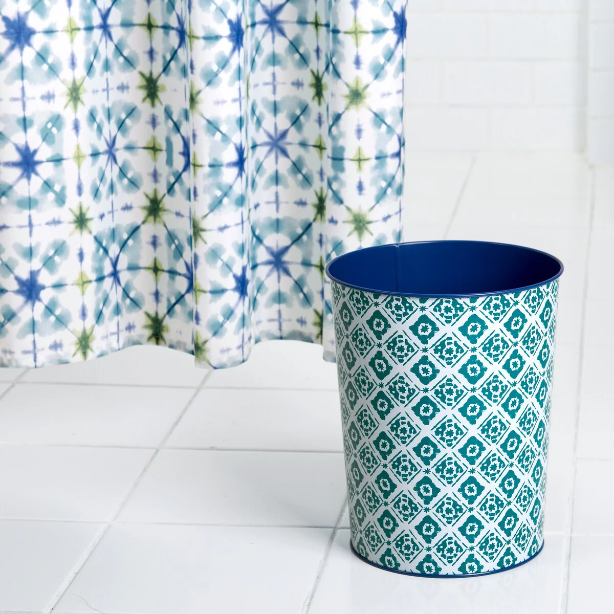 Transform your bathroom into a calm and serene sanctuary with the Tie Dye Wastebasket by Allure Home Creation. This classic shaped waste can is made of metal featuring a printed updated medallion design in a distressed teal blue on white with a solid dark blue interior. Both decorative and functional, it will work well in your bathroom, bedroom or other rooms in your home and will easily fit in most spaces. Use this fashionable piece to dress your room and create your perfect bathroom retreat. Use alone or coordinate with other matching pieces in the Tie Dye Bath Collection. Spot or Wipe Clean.