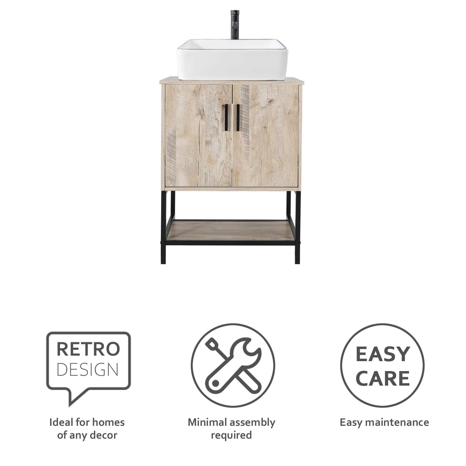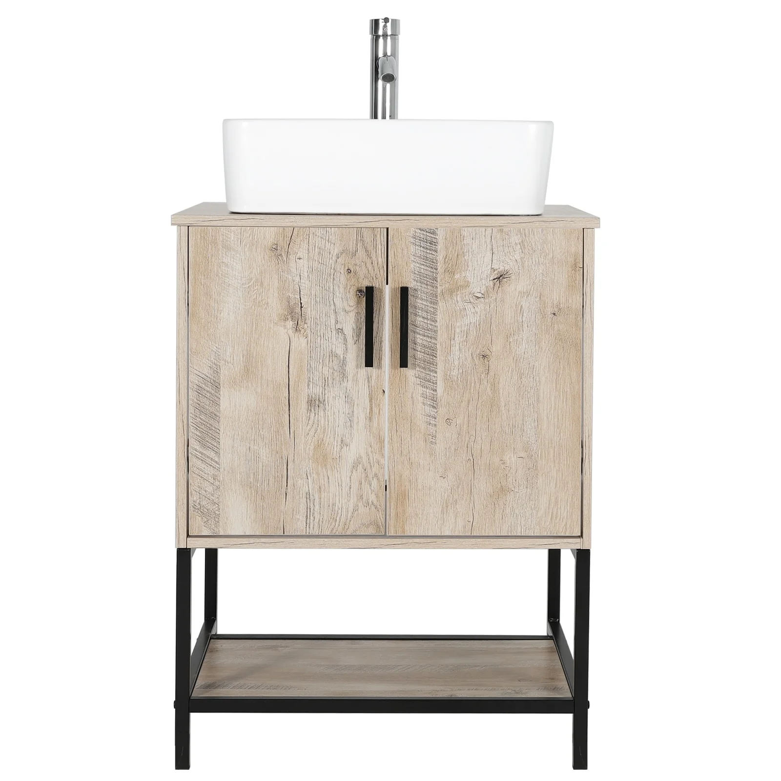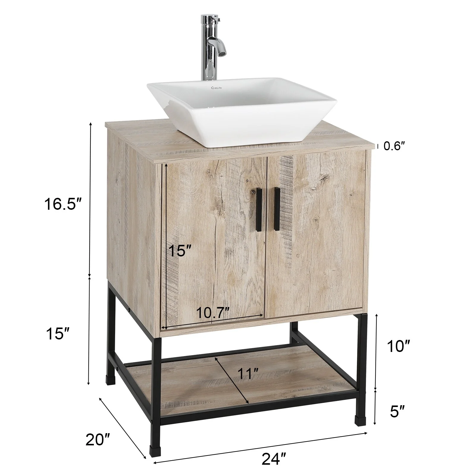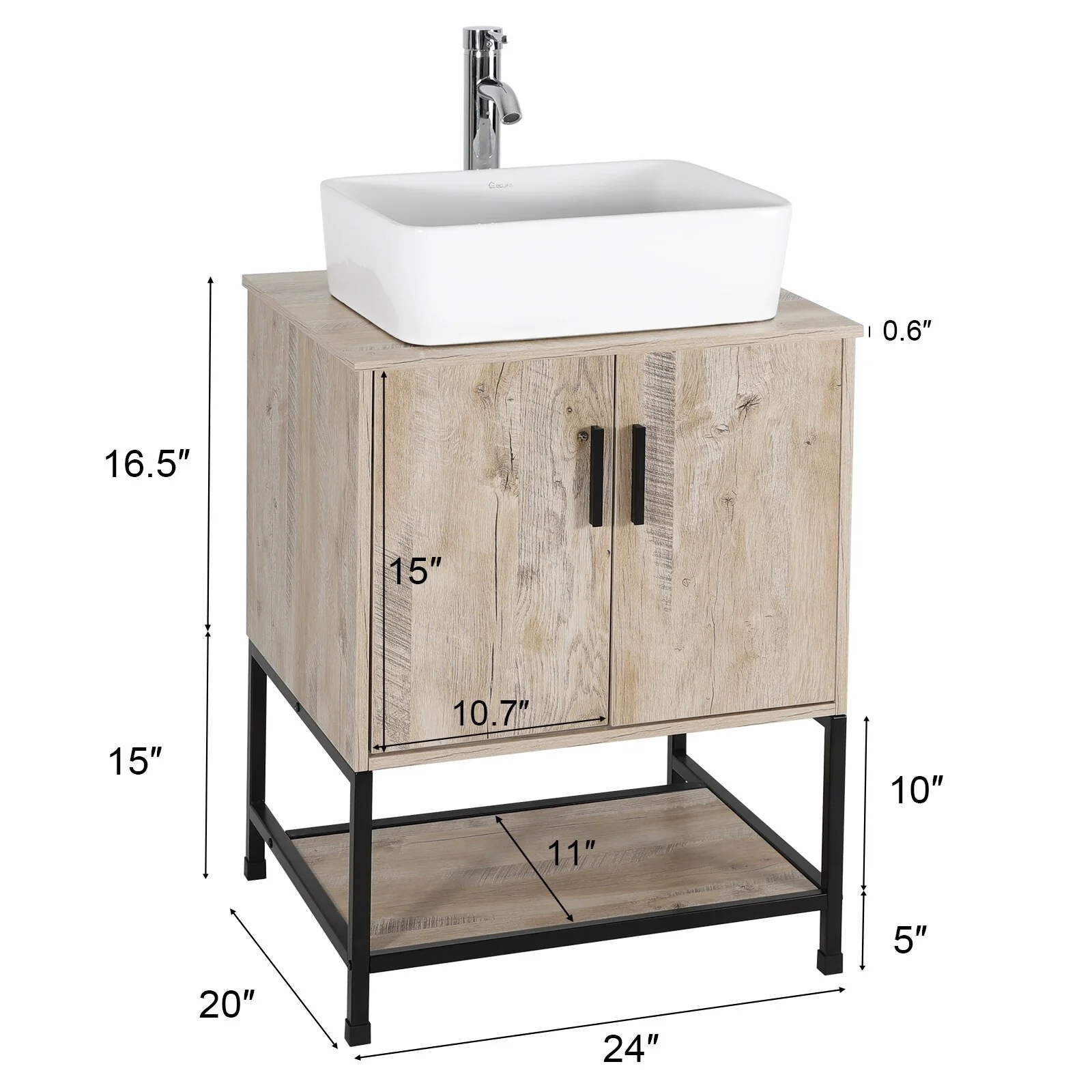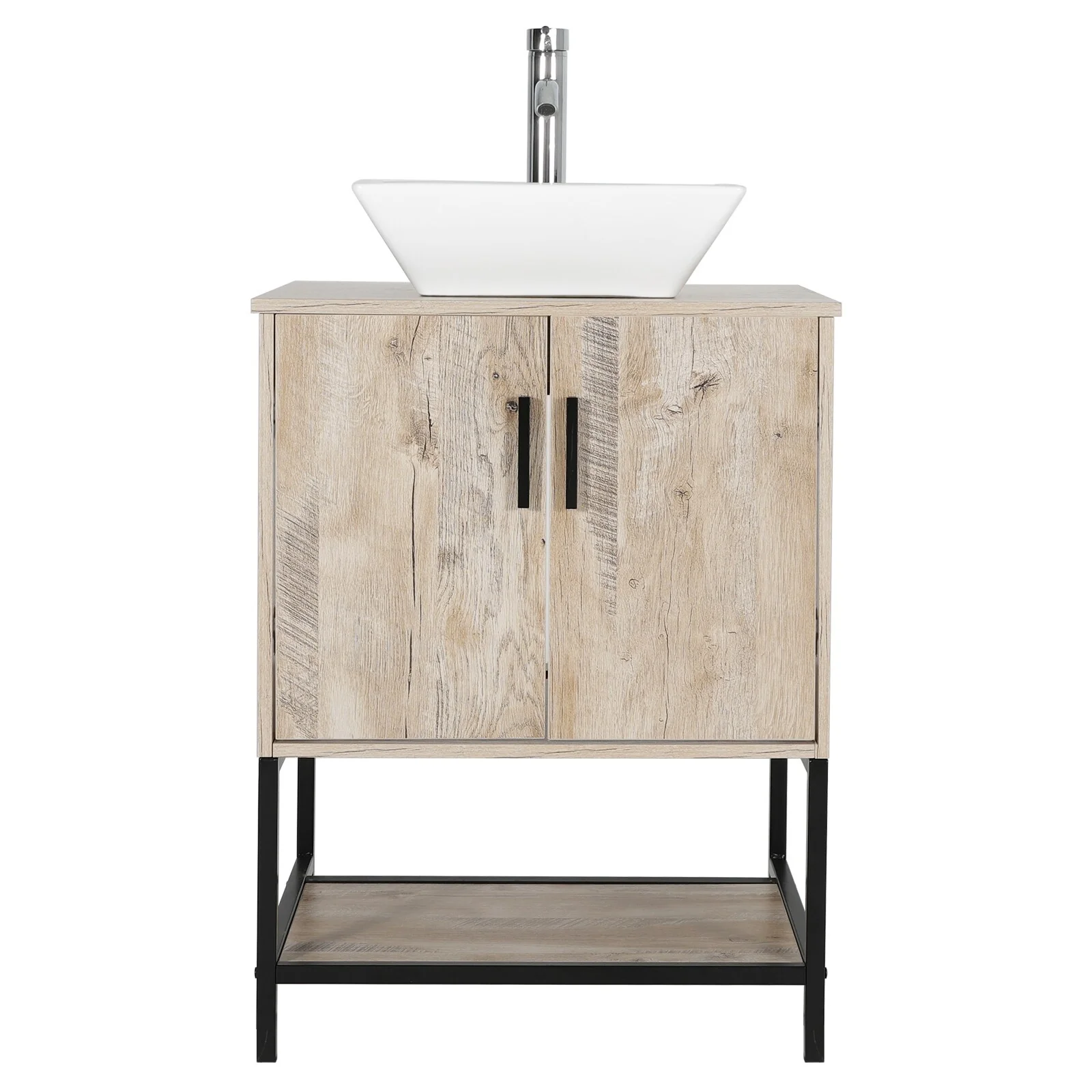 This eclife 24' Single Bathroom Vanity Set brings mid-century modern style to your bathroom or powder room. The top is easy to clean and wear-resistance, match with a high-quality tempered glass/ceramic bowl and faucet to keep it bright for long-lasting beauty. Two stunning rectangle metal handles are easy to open ample storage cabinet. A black durable square tube frame link base and cabinet, and a square tube crossbar stabilizing structure are added at the same time. Not only providing enough storage door cabinets, but also bringing an open storage space makes it more convenient and flexible; leaving 5'H from the ground makes the vanity-free from the influence of the wet environment in the bathroom, and easy to clean the floor of the bottom space. The countertop and vanity are pre-hole, It is easy to put together.