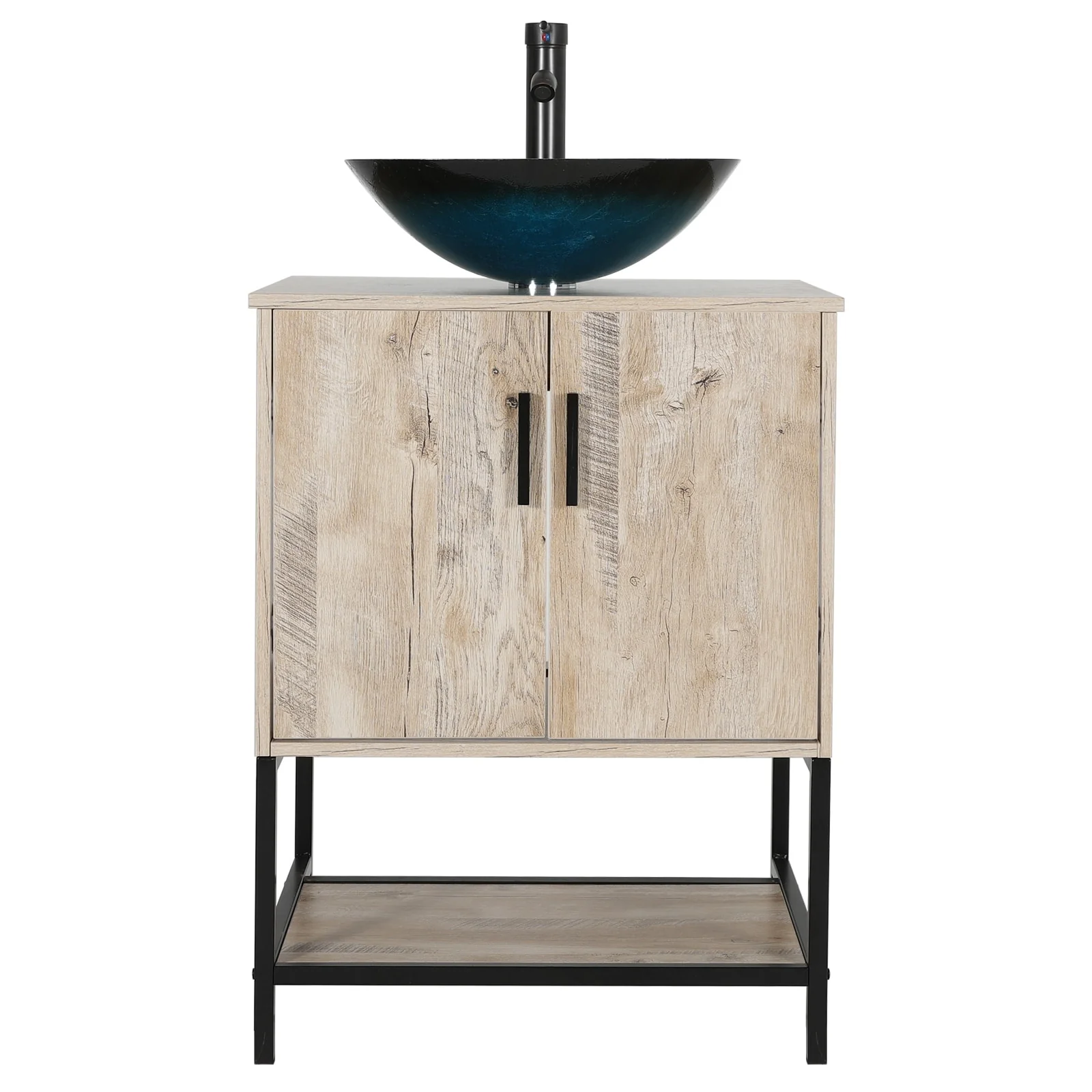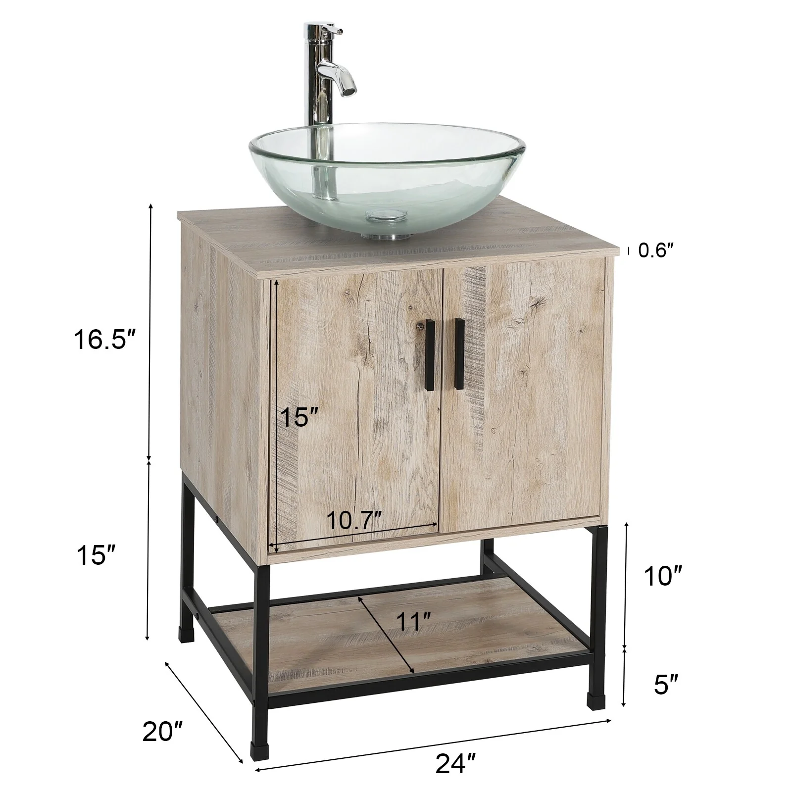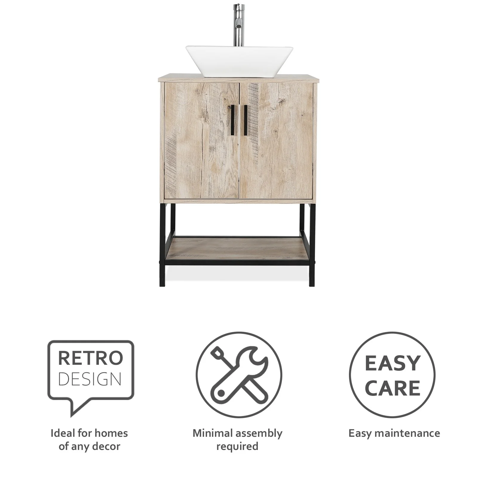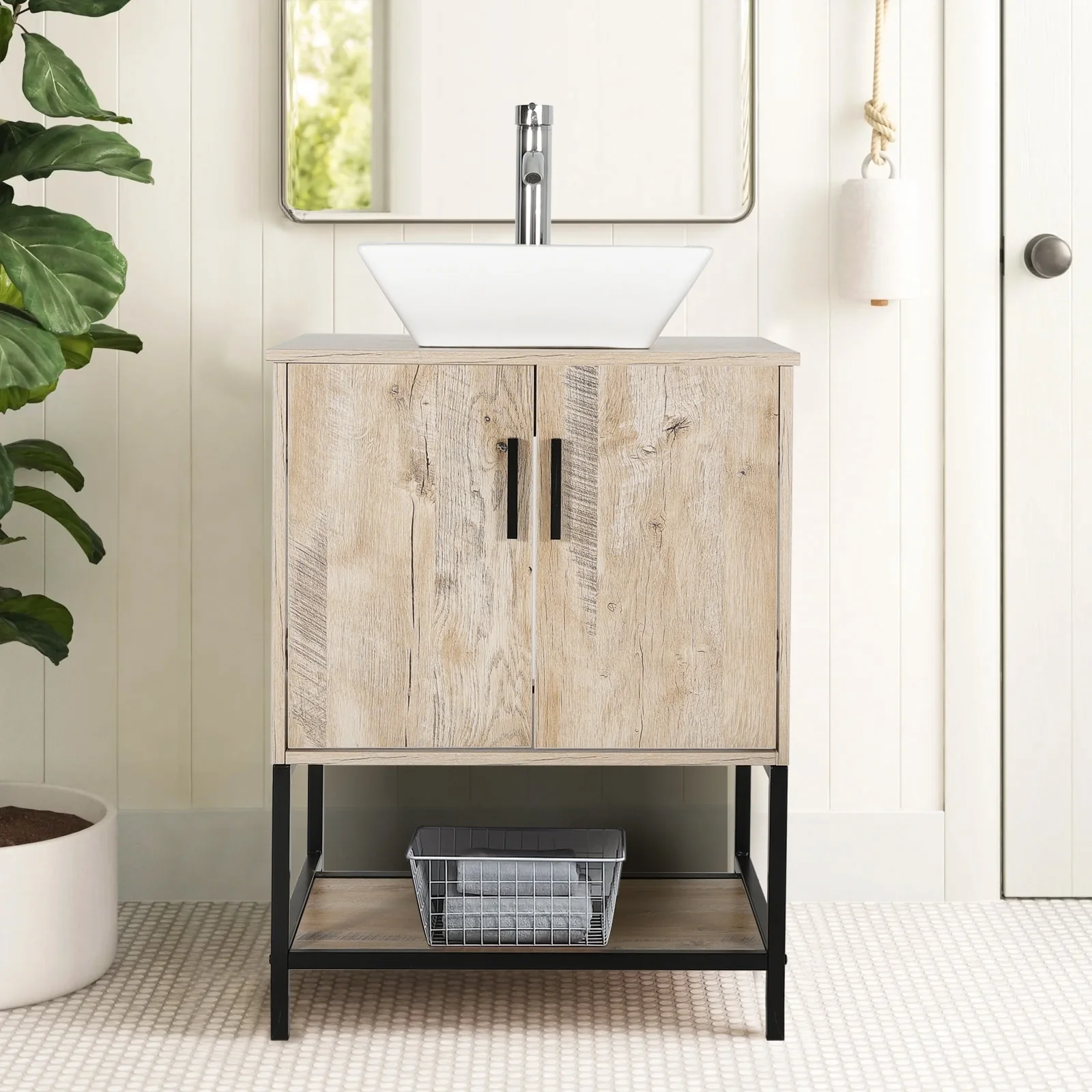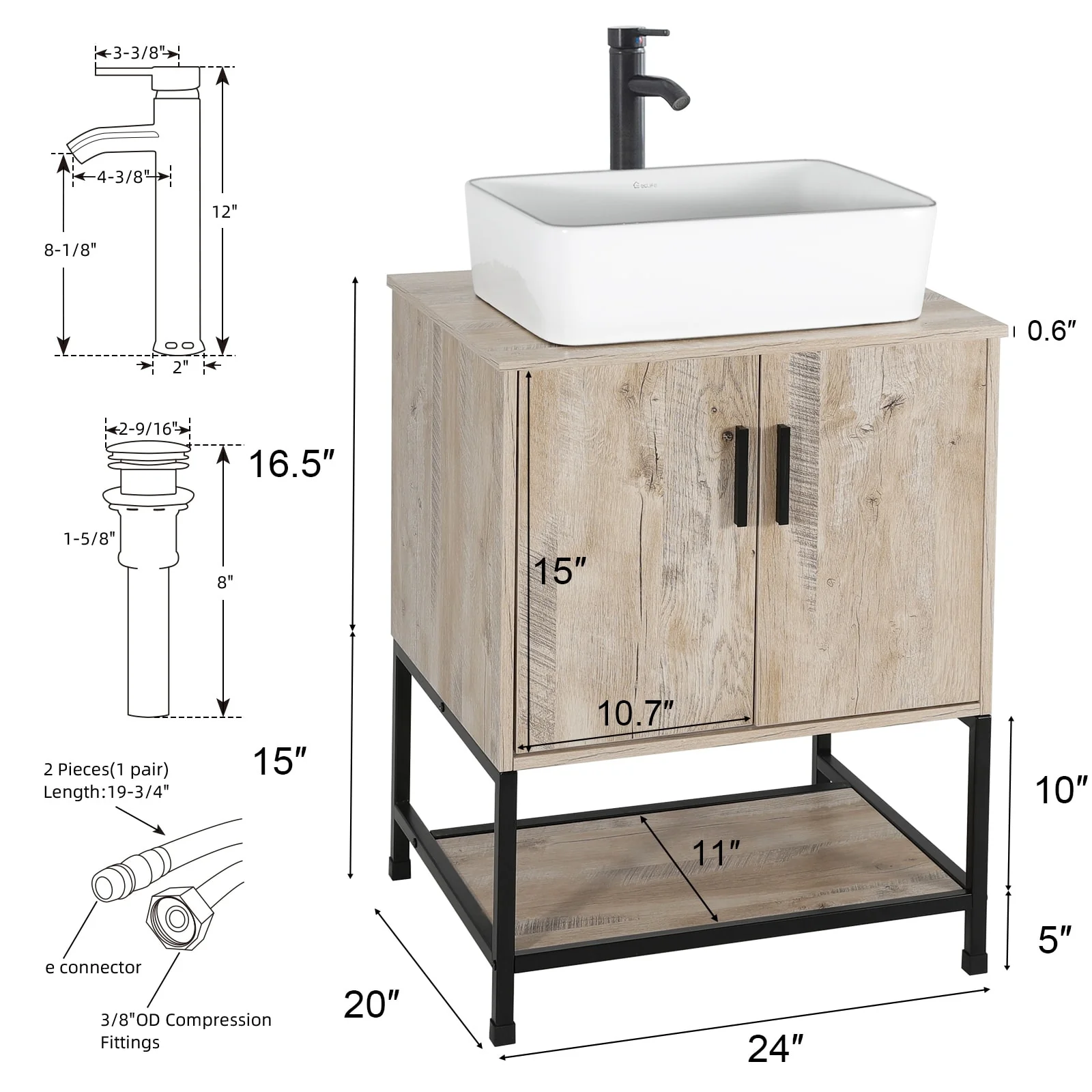 This eclife 24' Single Bathroom Vanity Set brings mid-century modern style to your bathroom or powder room. The top is easy to clean and wear-resistance, match with a high-quality tempered glass/ceramic bowl and faucet to keep it bright for long-lasting beauty. Two stunning rectangle metal handles are easy to open ample storage cabinet. A black durable square tube frame link base and cabinet, and a square tube crossbar stabilizing structure are added at the same time. Not only providing enough storage door cabinets, but also bringing an open storage space makes it more convenient and flexible; leaving 5'H from the ground makes the vanity-free from the influence of the wet environment in the bathroom, and easy to clean the floor of the bottom space. The countertop and vanity are pre-hole, It is easy to put together.
