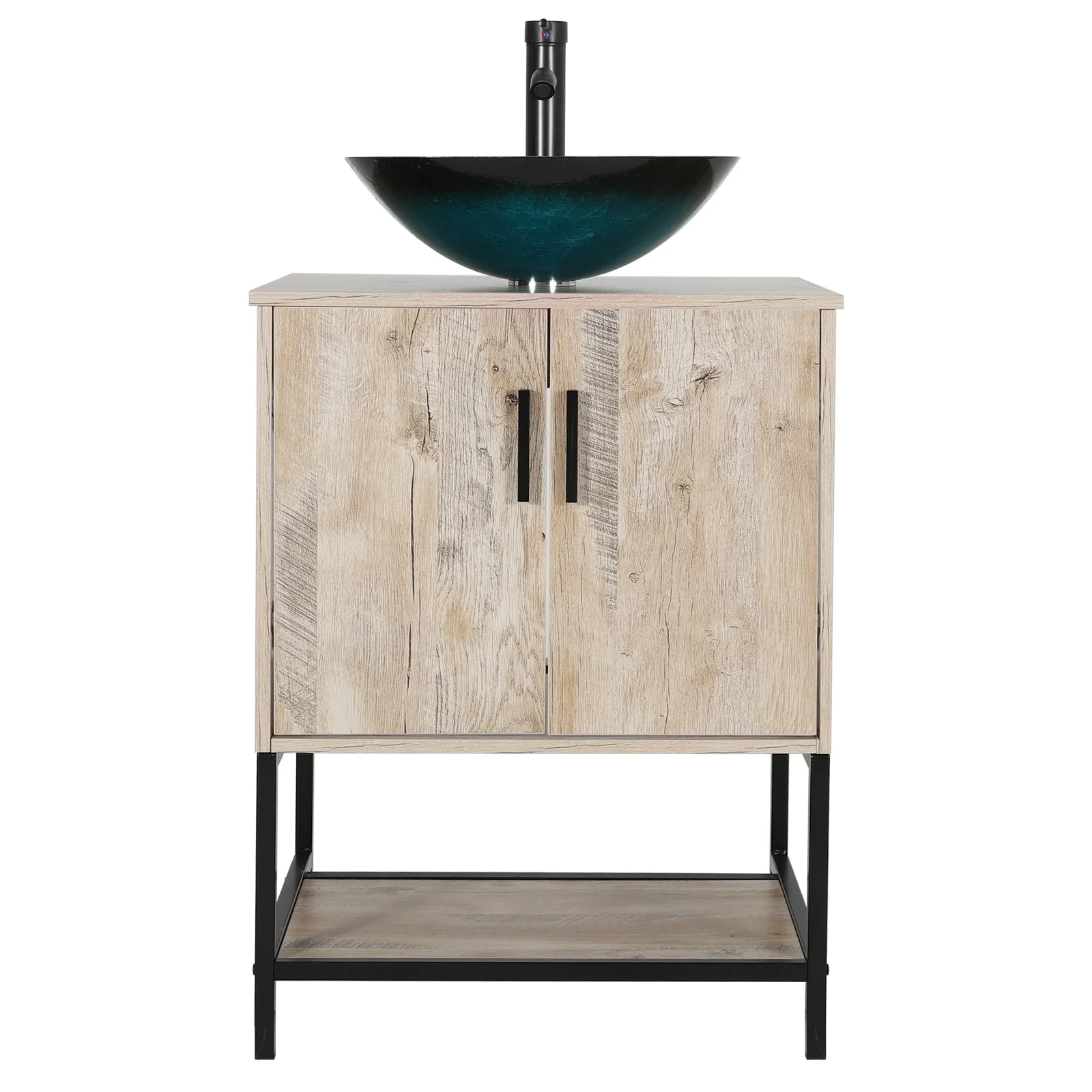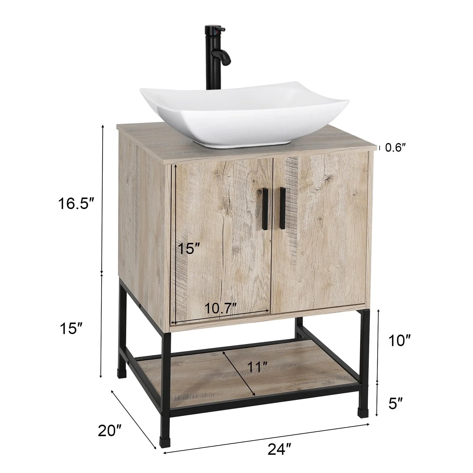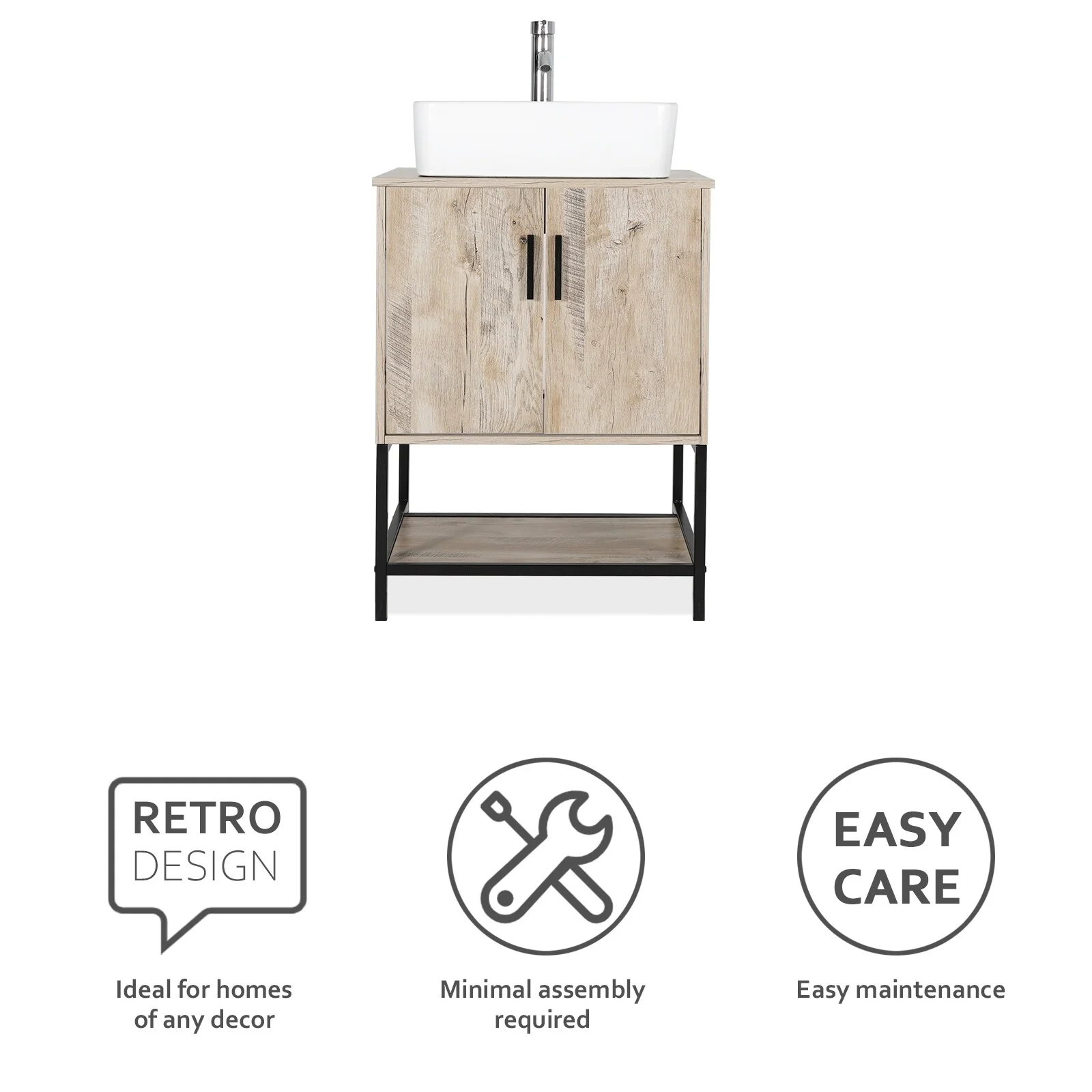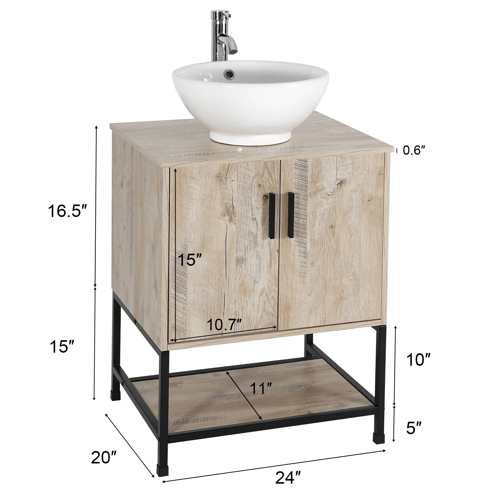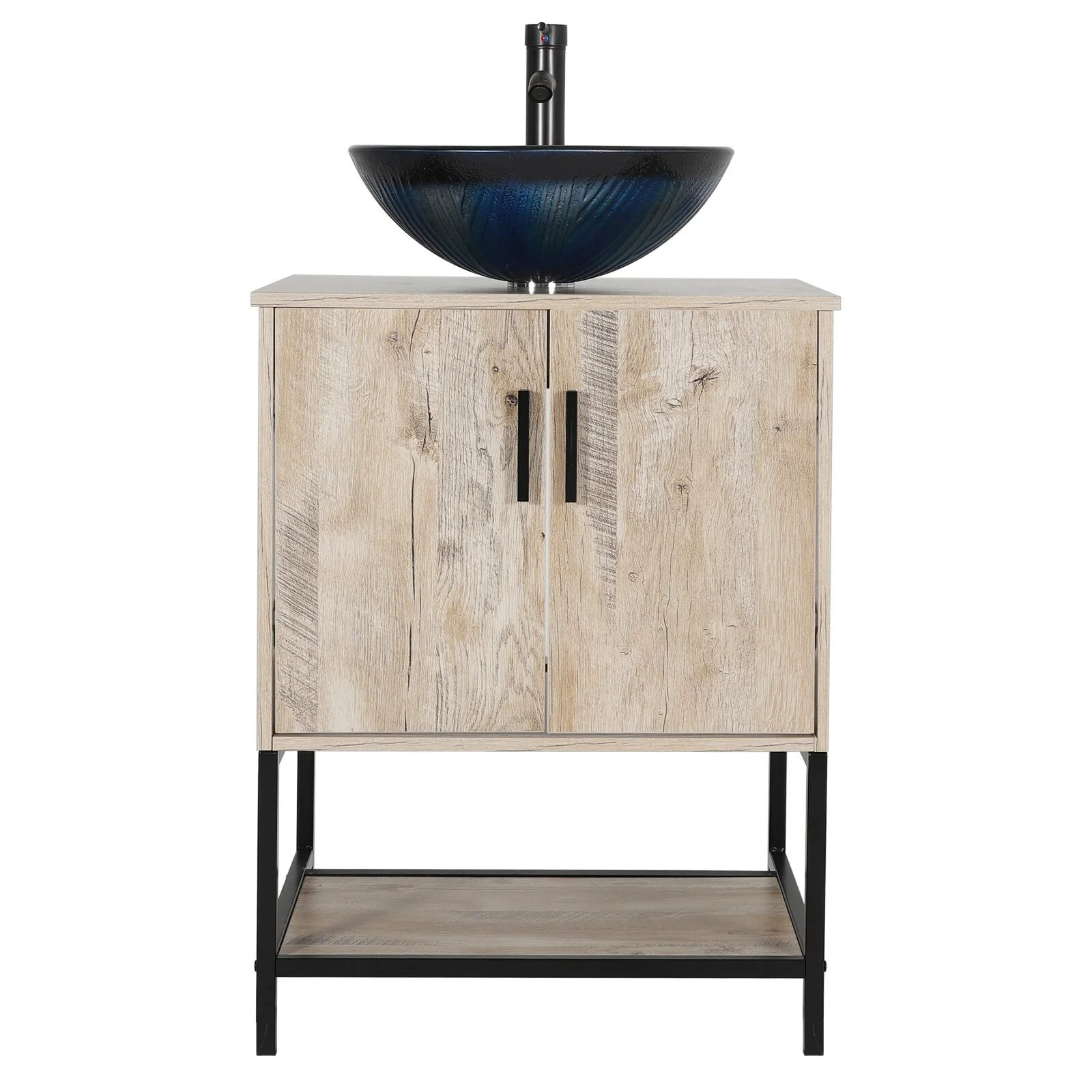 This eclife 24' Single Bathroom Vanity Set brings mid-century modern style to your bathroom or powder room. The top is easy to clean and wear-resistance, match with a high-quality tempered glass/ceramic bowl and faucet to keep it bright for long-lasting beauty. Two stunning rectangle metal handles are easy to open ample storage cabinet. A black durable square tube frame link base and cabinet, and a square tube crossbar stabilizing structure are added at the same time. Not only providing enough storage door cabinets, but also bringing an open storage space makes it more convenient and flexible; leaving 5'H from the ground makes the vanity-free from the influence of the wet environment in the bathroom, and easy to clean the floor of the bottom space. The countertop and vanity are pre-hole, It is easy to put together.