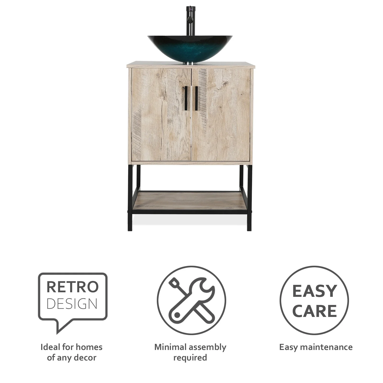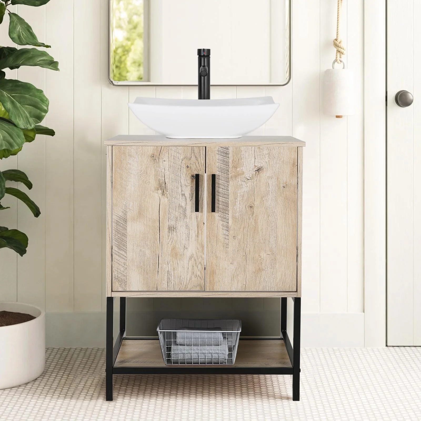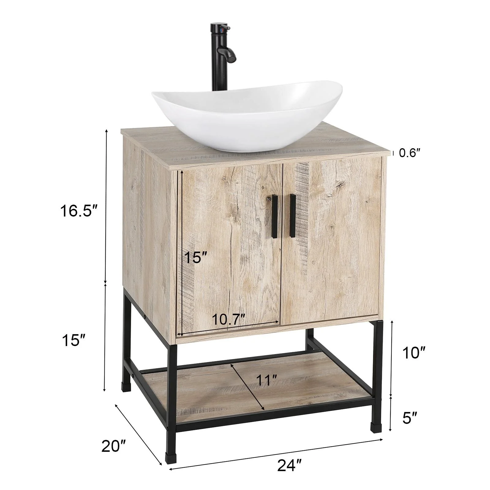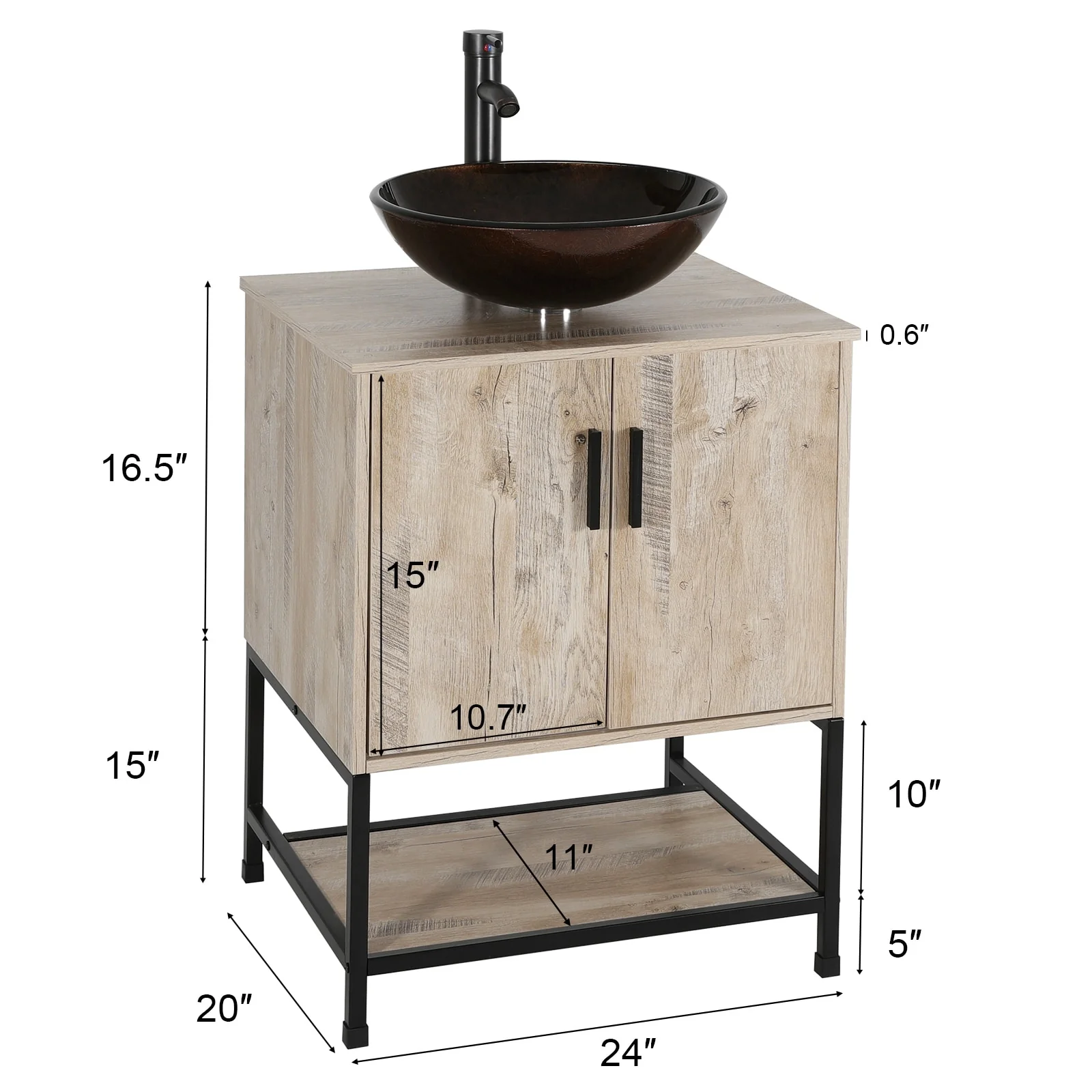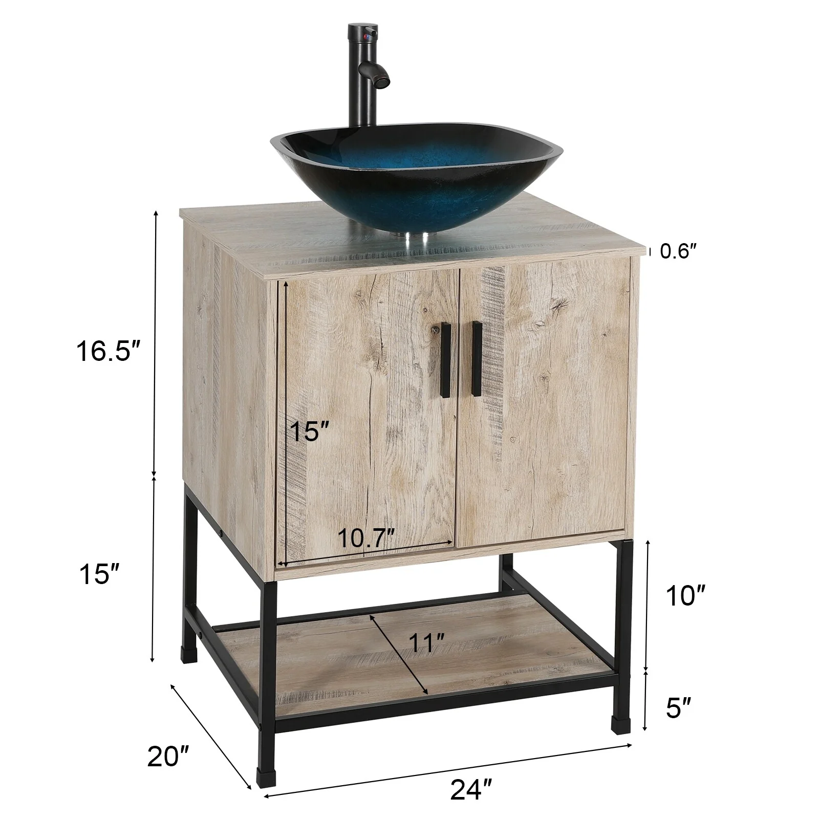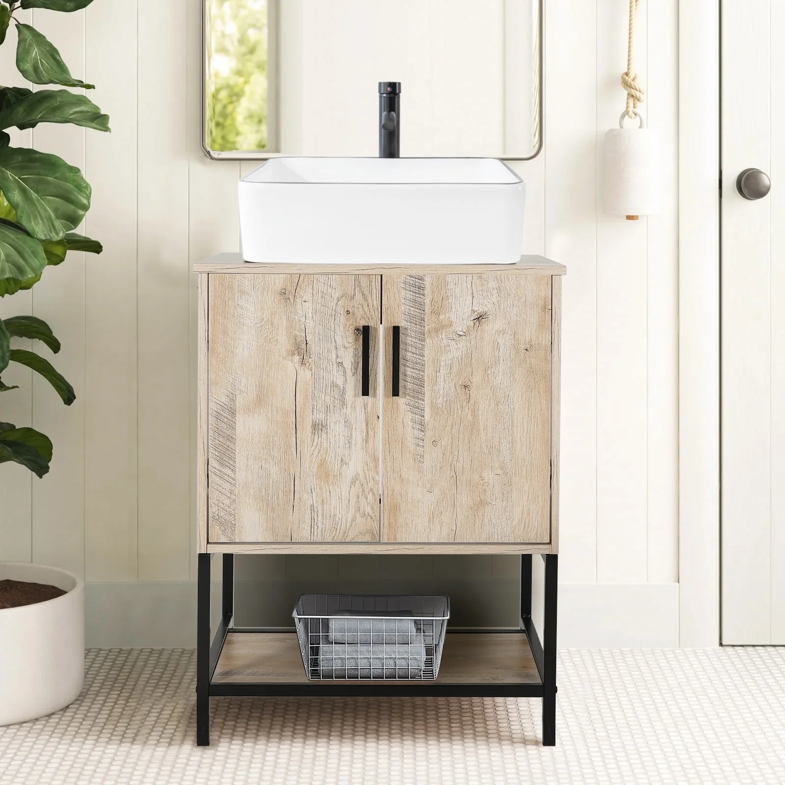 This eclife 24' Single Bathroom Vanity Set brings mid-century modern style to your bathroom or powder room. The top is easy to clean and wear-resistance, match with a high-quality tempered glass/ceramic bowl and faucet to keep it bright for long-lasting beauty. Two stunning rectangle metal handles are easy to open ample storage cabinet. A black durable square tube frame link base and cabinet, and a square tube crossbar stabilizing structure are added at the same time. Not only providing enough storage door cabinets, but also bringing an open storage space makes it more convenient and flexible; leaving 5'H from the ground makes the vanity-free from the influence of the wet environment in the bathroom, and easy to clean the floor of the bottom space. The countertop and vanity are pre-hole, It is easy to put together.