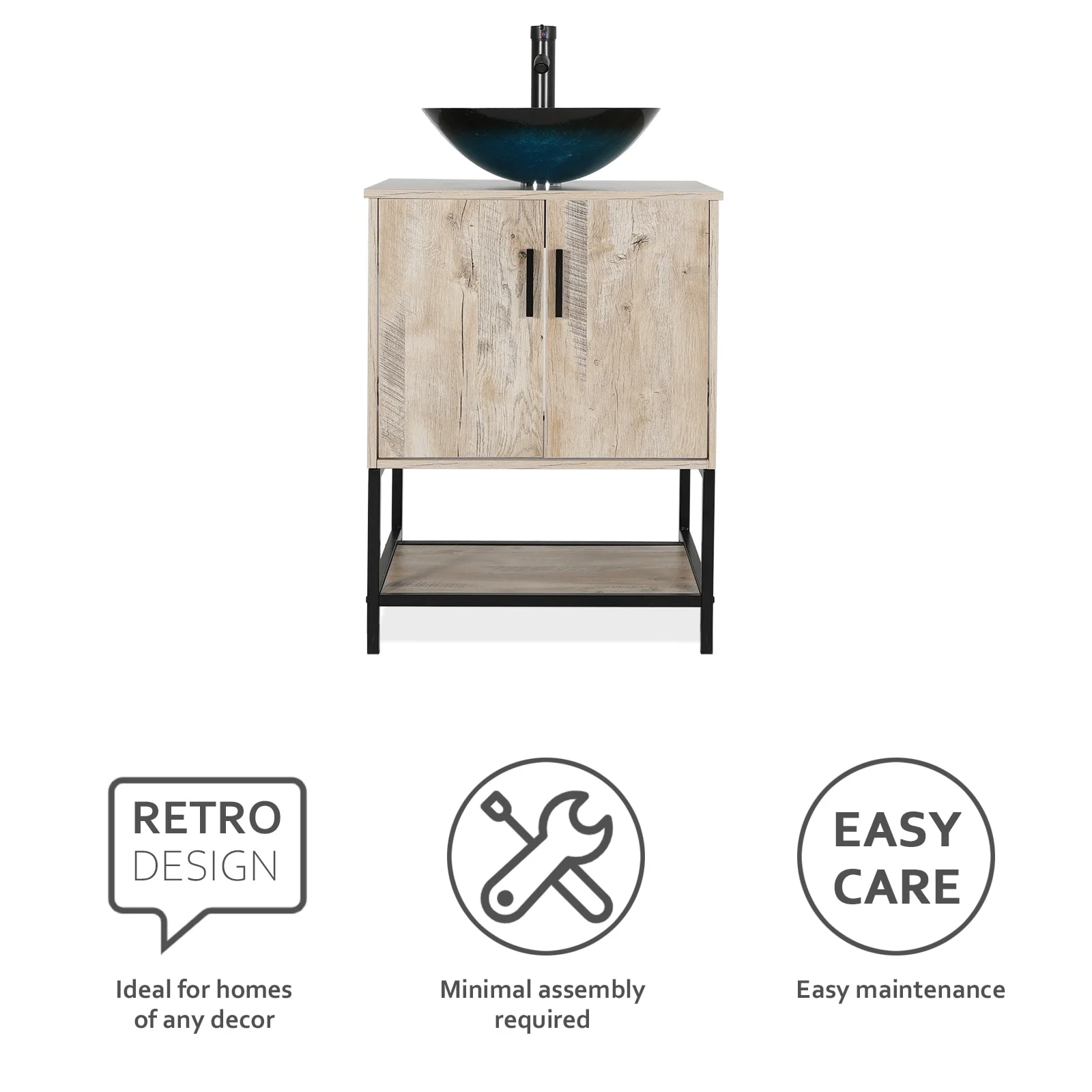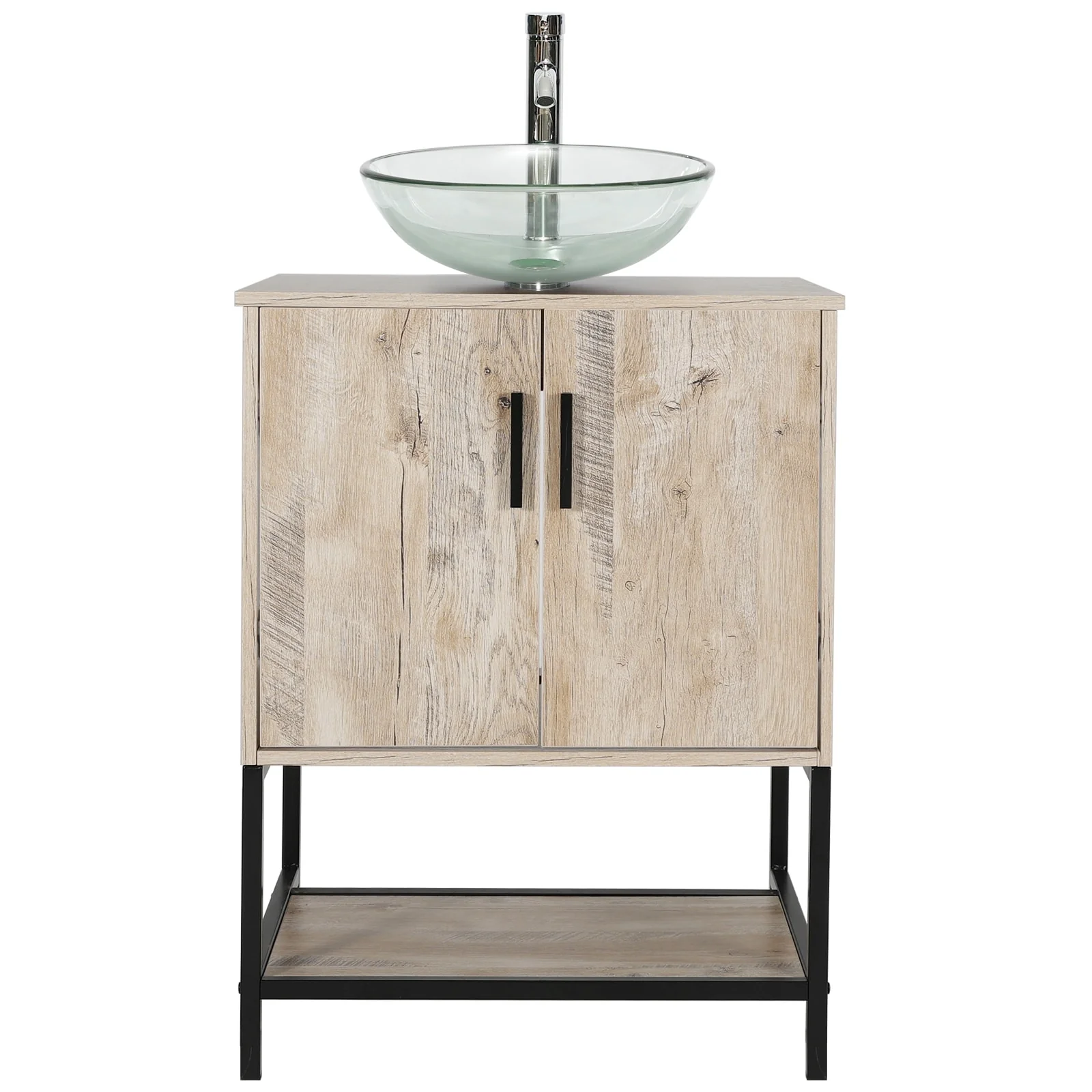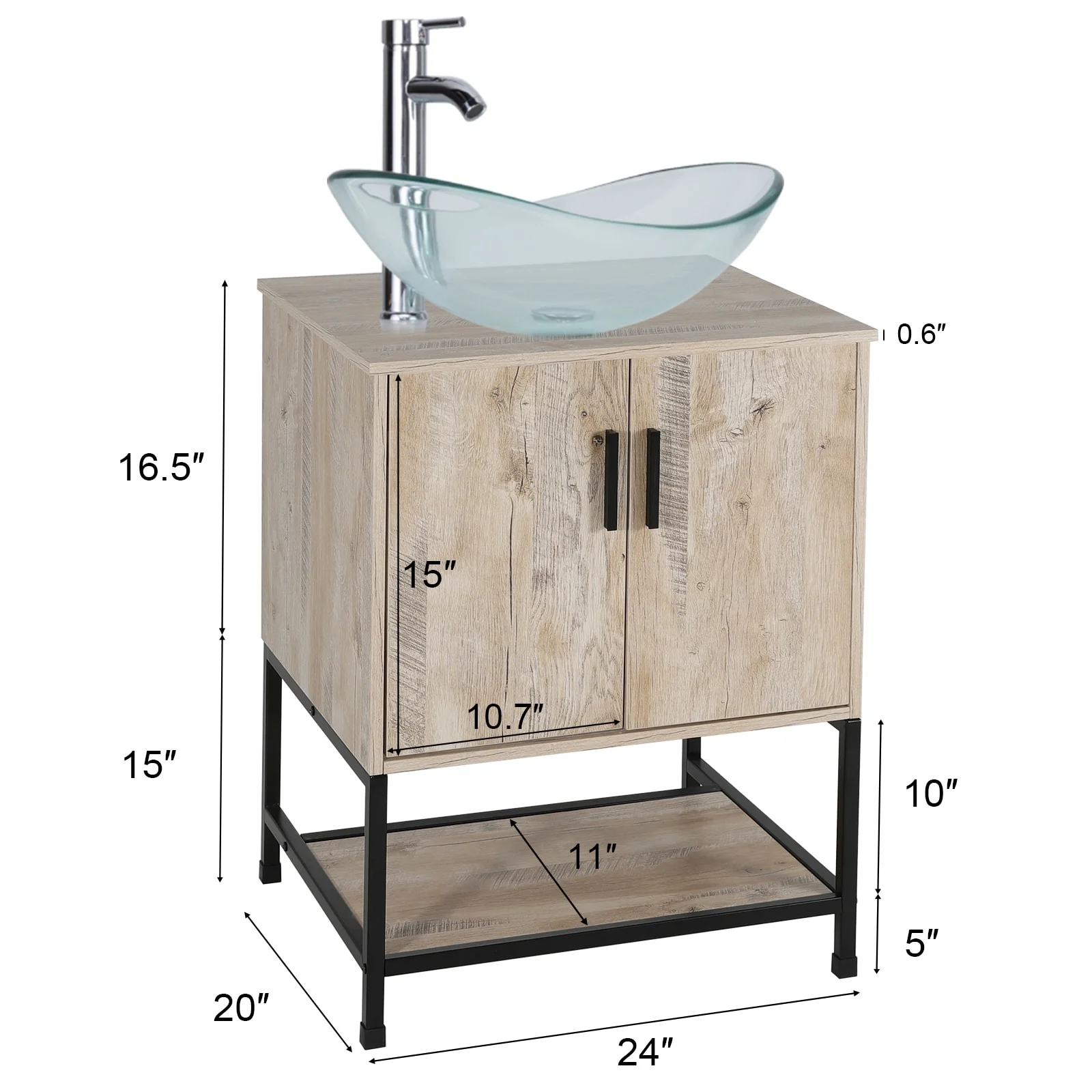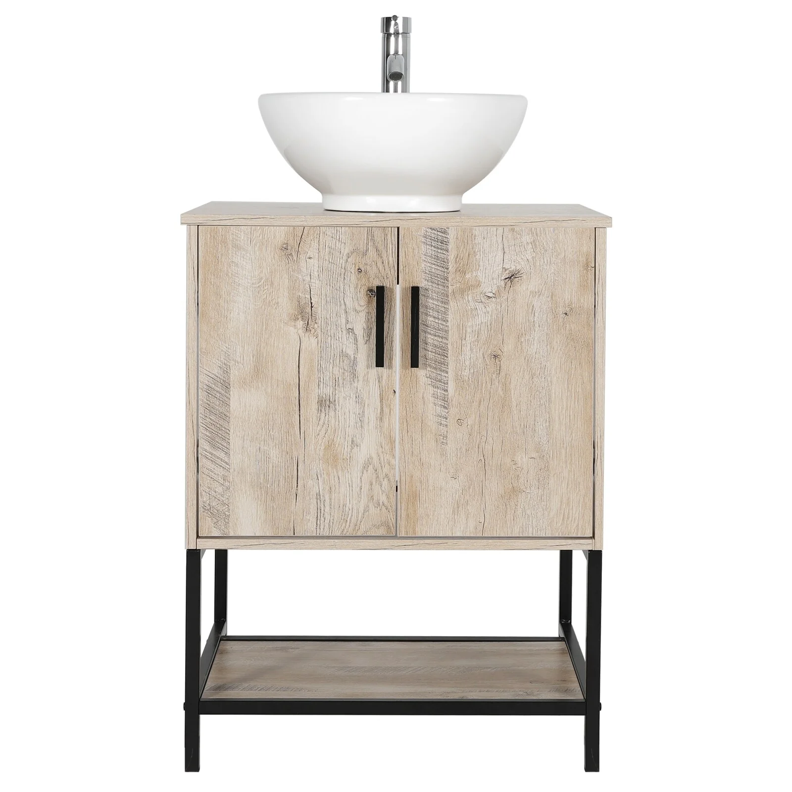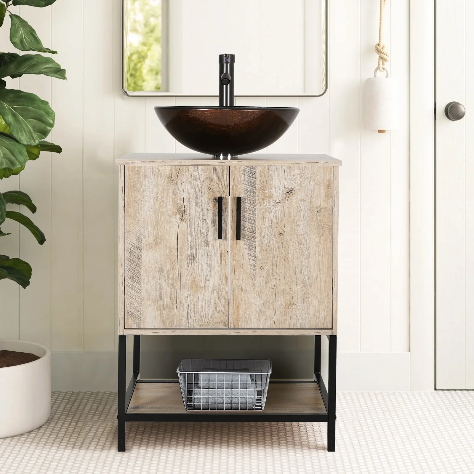 This eclife 24' Single Bathroom Vanity Set brings mid-century modern style to your bathroom or powder room. The top is easy to clean and wear-resistance, match with a high-quality tempered glass/ceramic bowl and faucet to keep it bright for long-lasting beauty. Two stunning rectangle metal handles are easy to open ample storage cabinet. A black durable square tube frame link base and cabinet, and a square tube crossbar stabilizing structure are added at the same time. Not only providing enough storage door cabinets, but also bringing an open storage space makes it more convenient and flexible; leaving 5'H from the ground makes the vanity-free from the influence of the wet environment in the bathroom, and easy to clean the floor of the bottom space. The countertop and vanity are pre-hole, It is easy to put together.