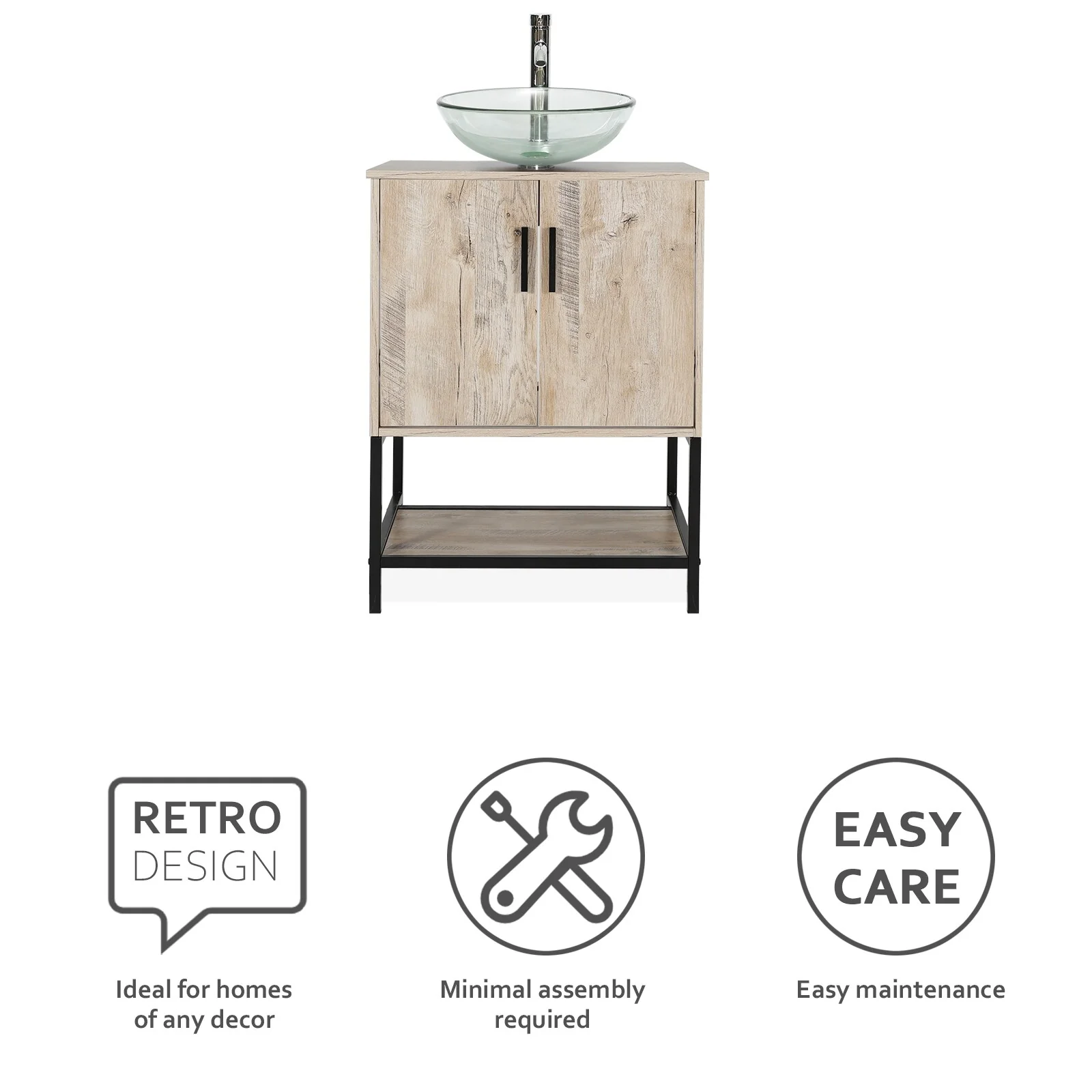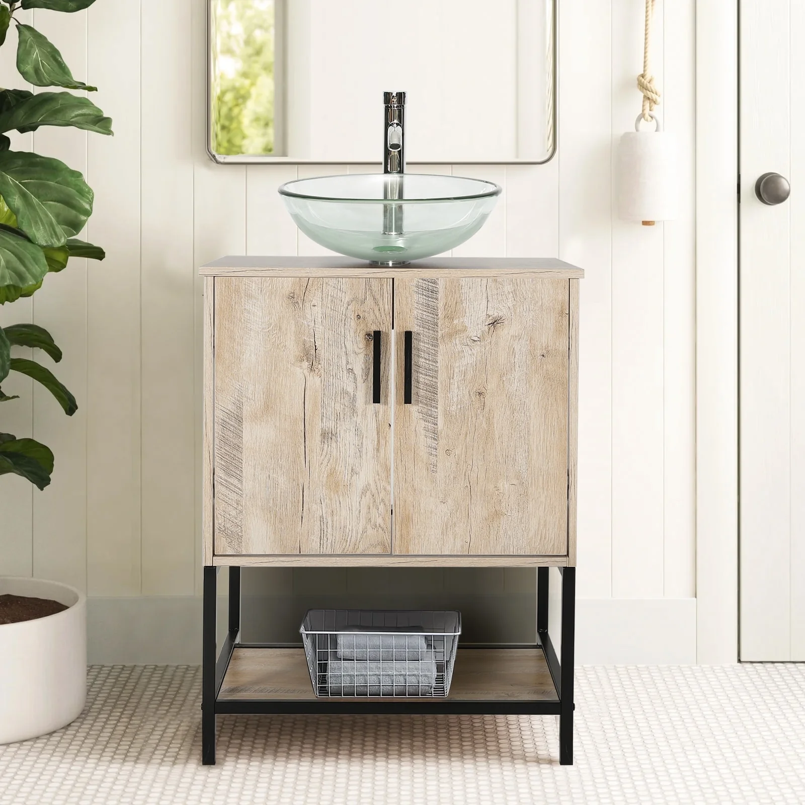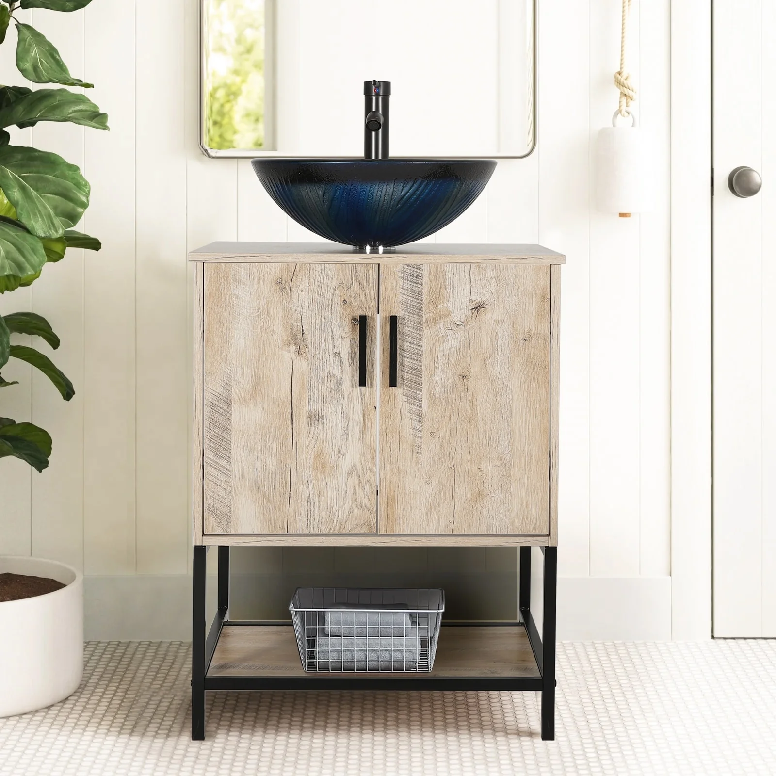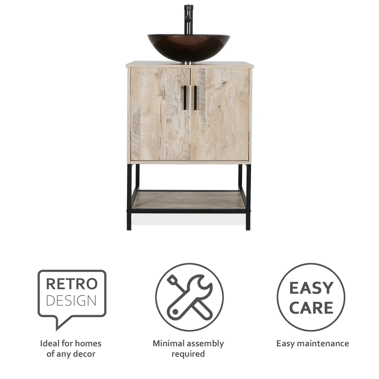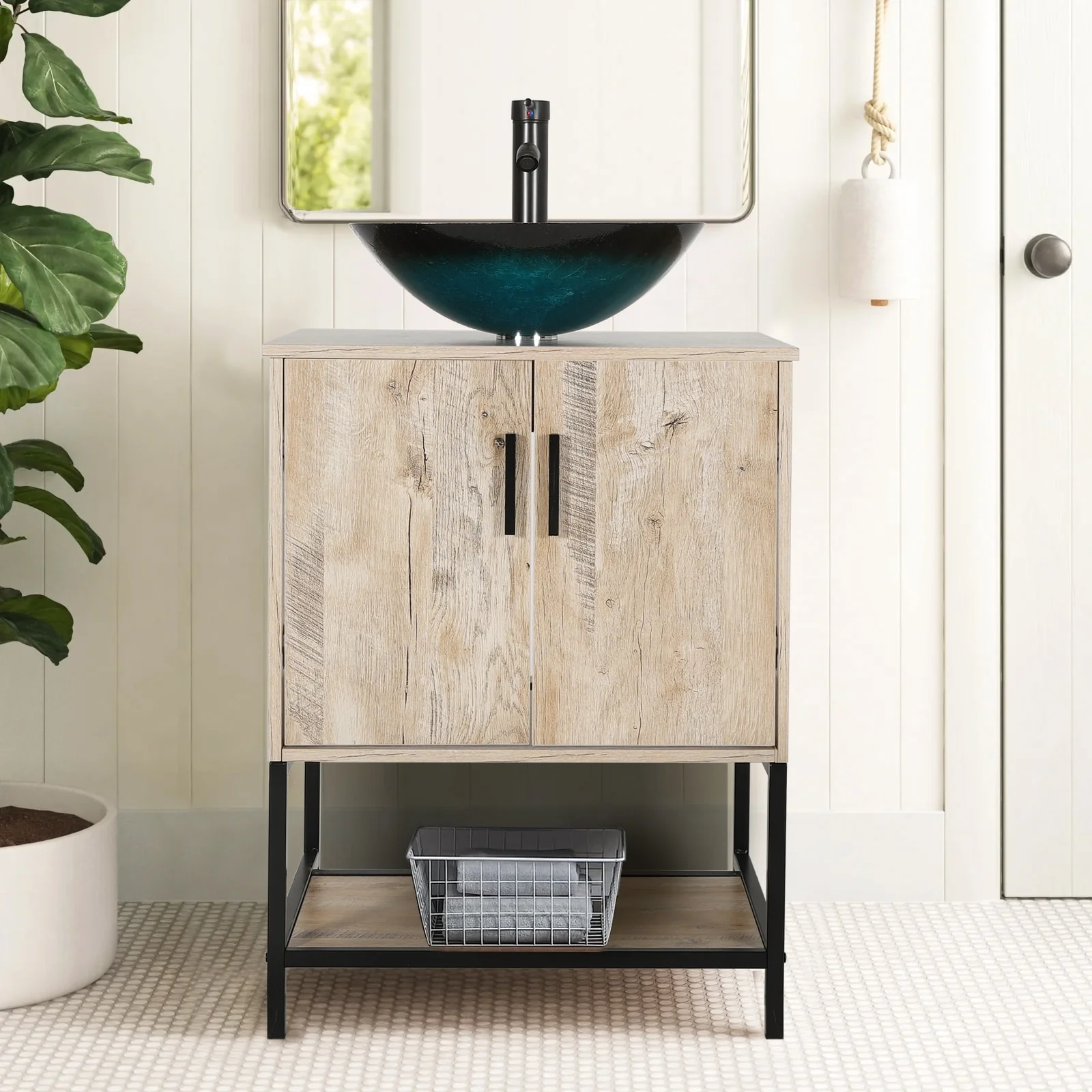 This eclife 24' Single Bathroom Vanity Set brings mid-century modern style to your bathroom or powder room. The top is easy to clean and wear-resistance, match with a high-quality tempered glass/ceramic bowl and faucet to keep it bright for long-lasting beauty. Two stunning rectangle metal handles are easy to open ample storage cabinet. A black durable square tube frame link base and cabinet, and a square tube crossbar stabilizing structure are added at the same time. Not only providing enough storage door cabinets, but also bringing an open storage space makes it more convenient and flexible; leaving 5'H from the ground makes the vanity-free from the influence of the wet environment in the bathroom, and easy to clean the floor of the bottom space. The countertop and vanity are pre-hole, It is easy to put together.