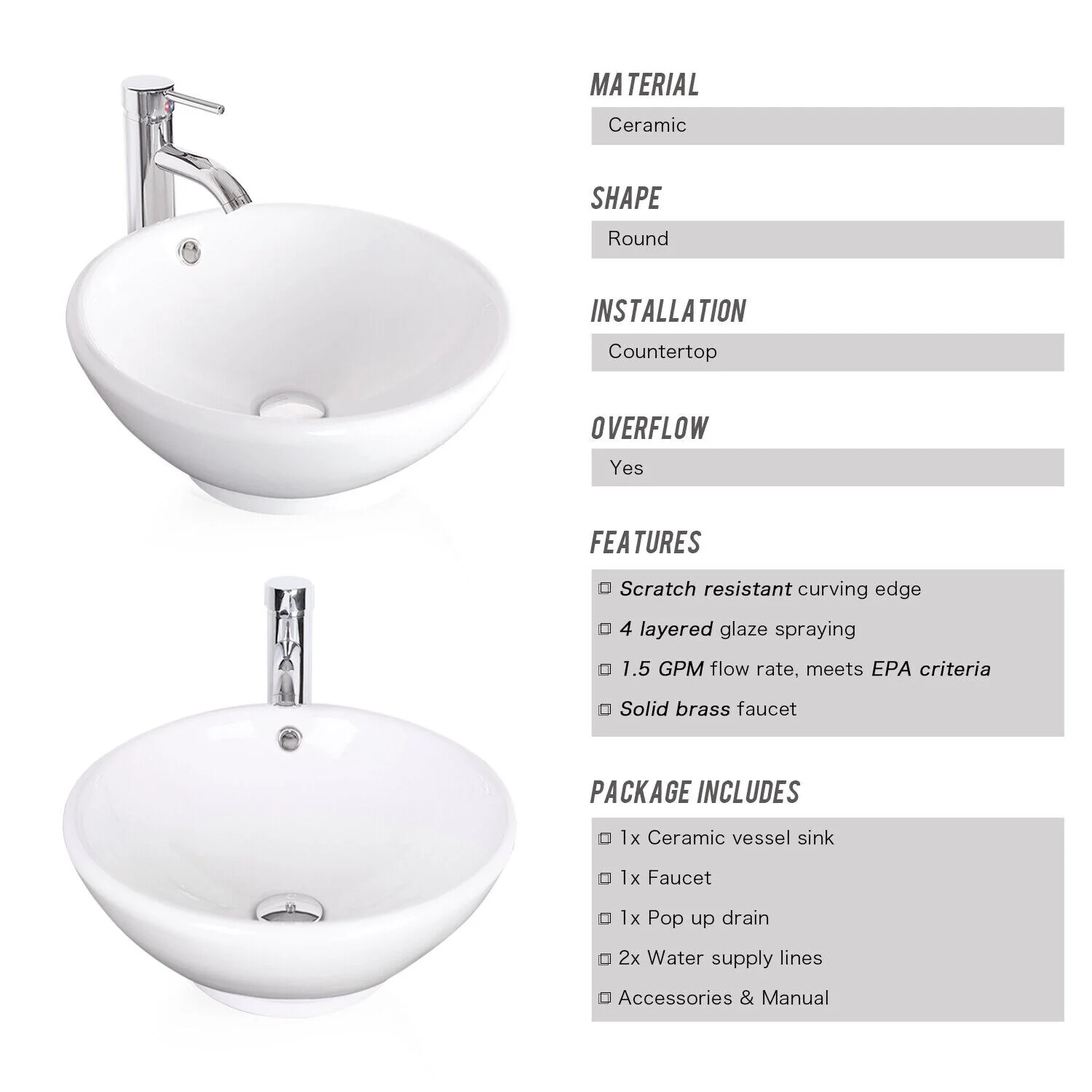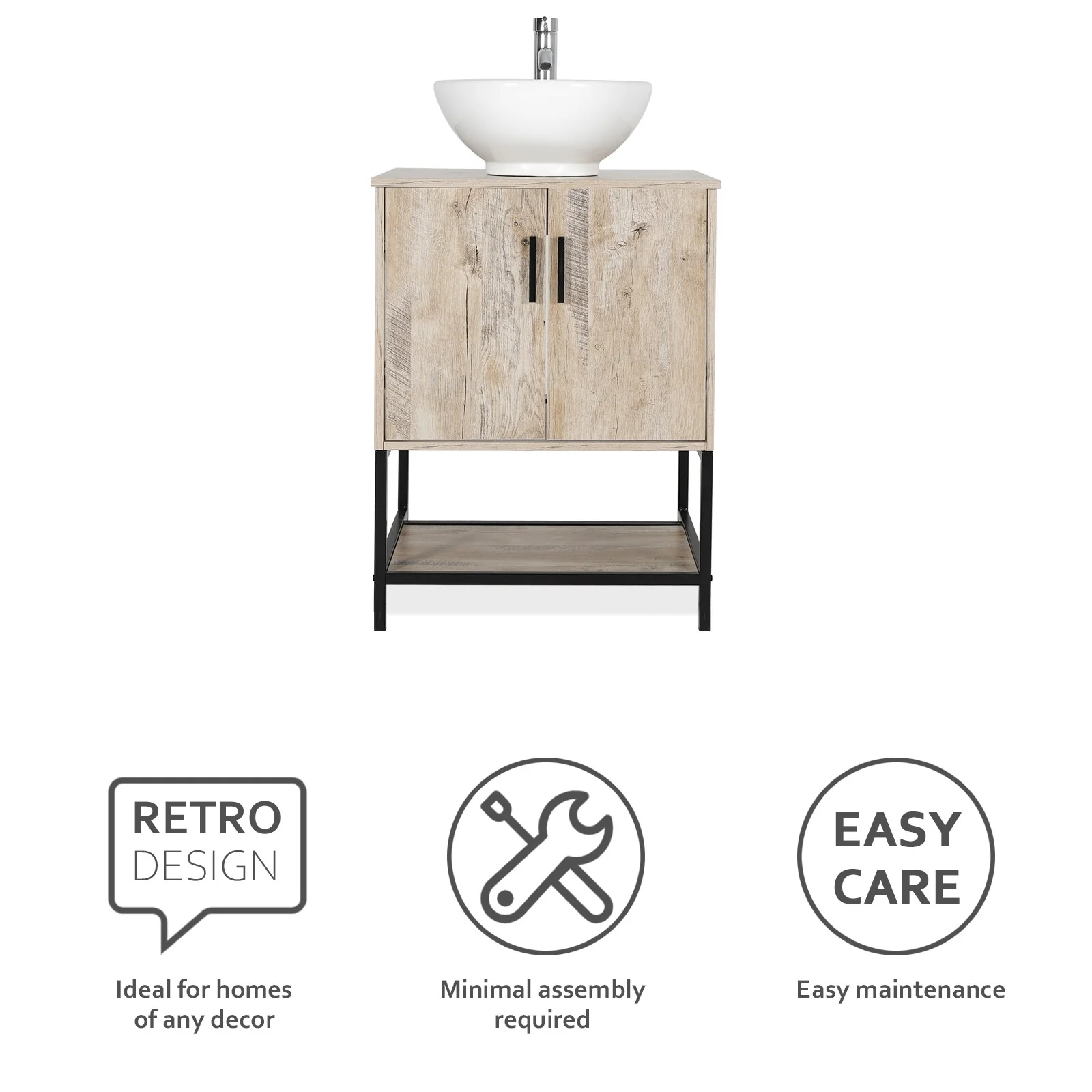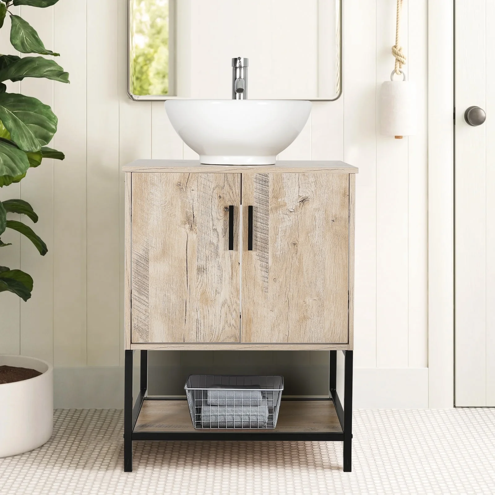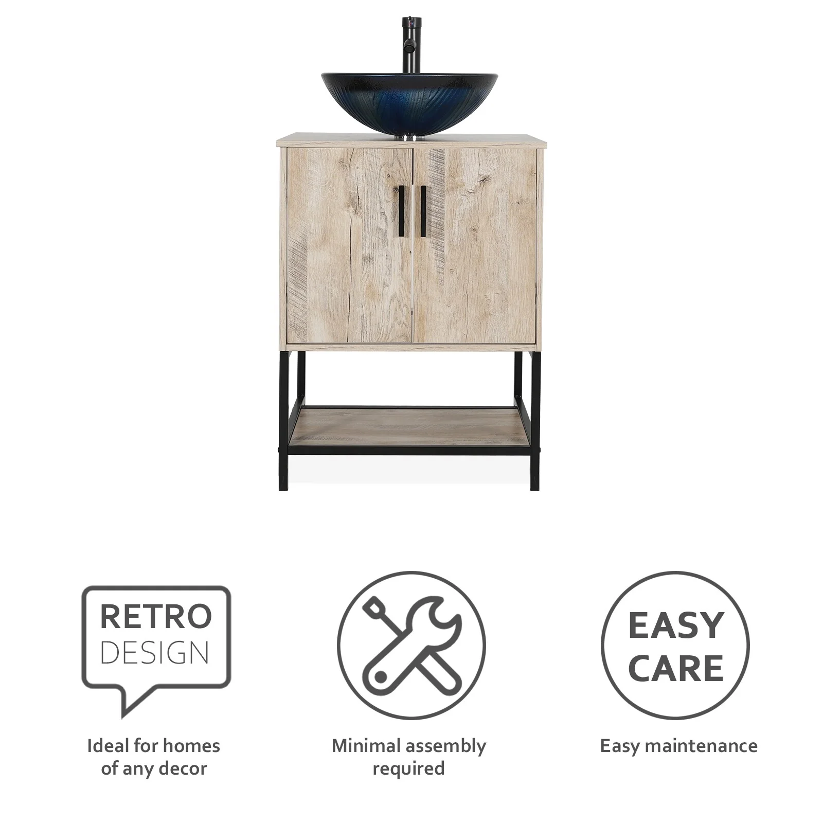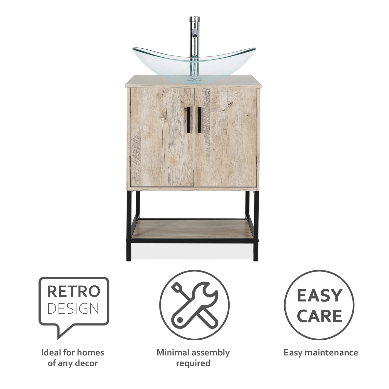 This eclife 24' Single Bathroom Vanity Set brings mid-century modern style to your bathroom or powder room. The top is easy to clean and wear-resistance, match with a high-quality tempered glass/ceramic bowl and faucet to keep it bright for long-lasting beauty. Two stunning rectangle metal handles are easy to open ample storage cabinet. A black durable square tube frame link base and cabinet, and a square tube crossbar stabilizing structure are added at the same time. Not only providing enough storage door cabinets, but also bringing an open storage space makes it more convenient and flexible; leaving 5'H from the ground makes the vanity-free from the influence of the wet environment in the bathroom, and easy to clean the floor of the bottom space. The countertop and vanity are pre-hole, It is easy to put together.