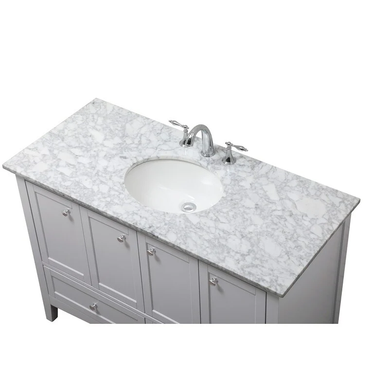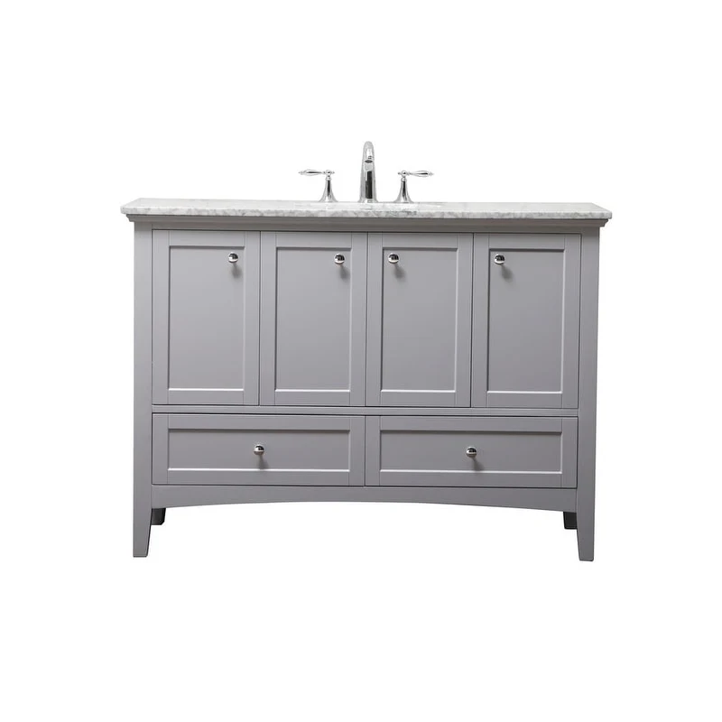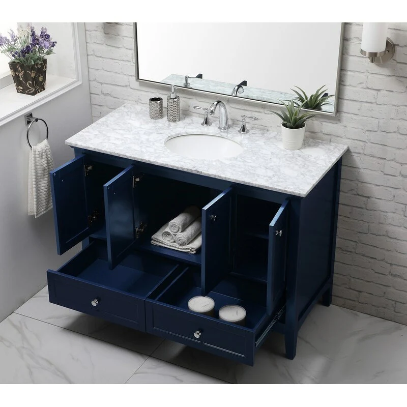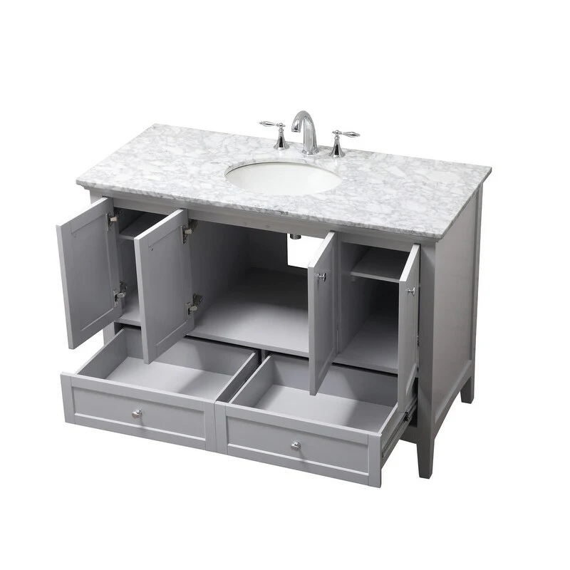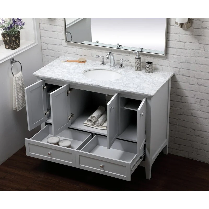 If you have space, why not indulge in this bathroom vanity set? The handy soft-close doors open to reveal one wide middle shelf, and two smaller side shelves. It provides more storage space for your belongings, ensuring that you'll have all your toiletries in one spot. It also means an abundance of counter space. It will make even your electric toothbrush holder look right at home on this vanity. A cute oval undermount sink completes the look and also allows for easy cleaning of the countertop.
