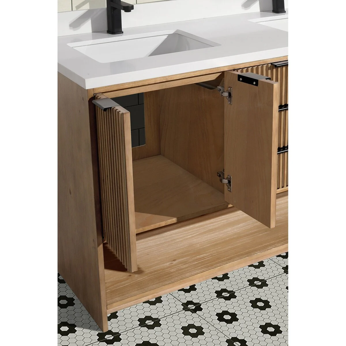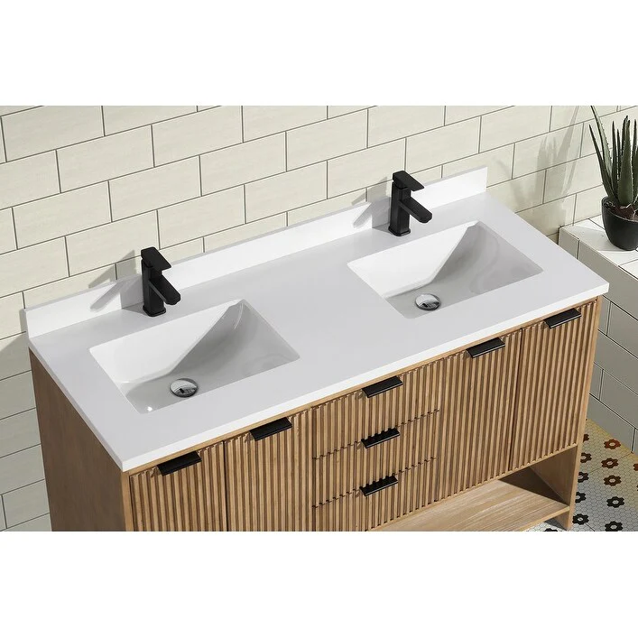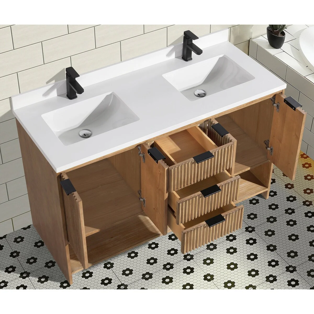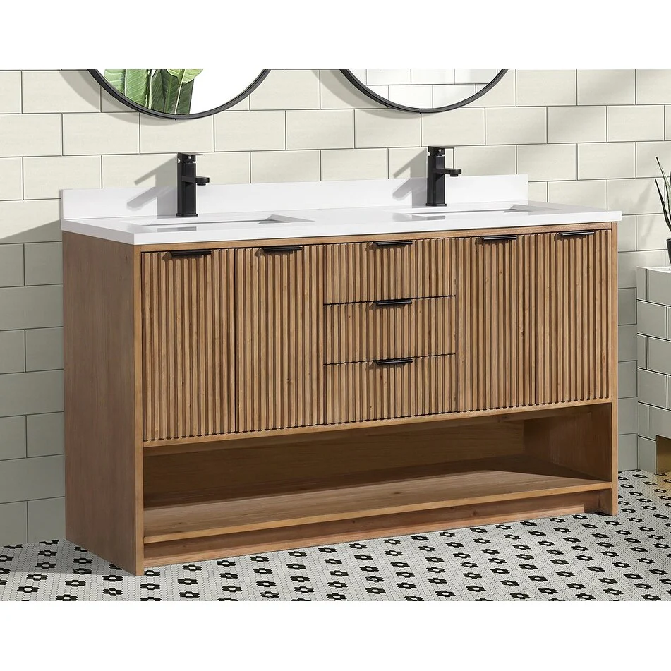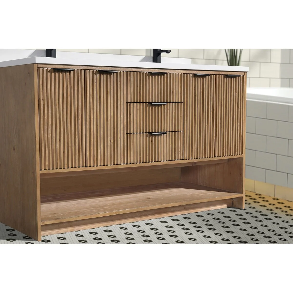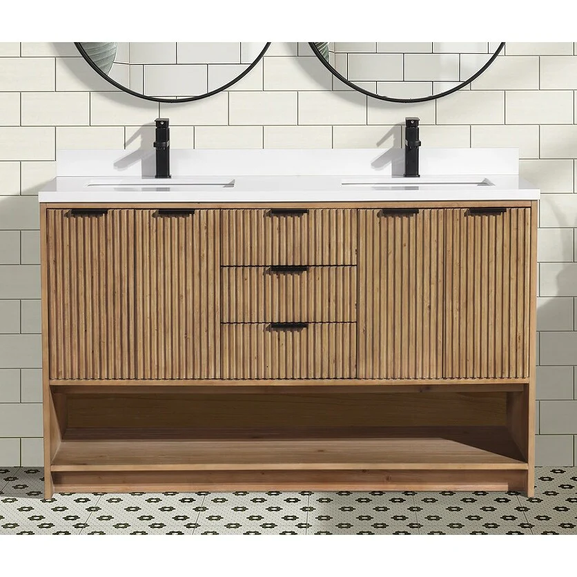 Transform your bathroom with the 55 inch San Diego double sink vanity, which will serve as the focal point of your remodel. The vanity is expertly crafted from solid wood to ensure durability for years to come. The wood is finished with raised grain to create a distressed and reclaimed appearance. The three solid wood dovetail drawers feature full extension glides, providing ample storage space for your daily toiletries. The mid century modern style is completed with a sturdy quartz countertop that complements the design of the vanity.