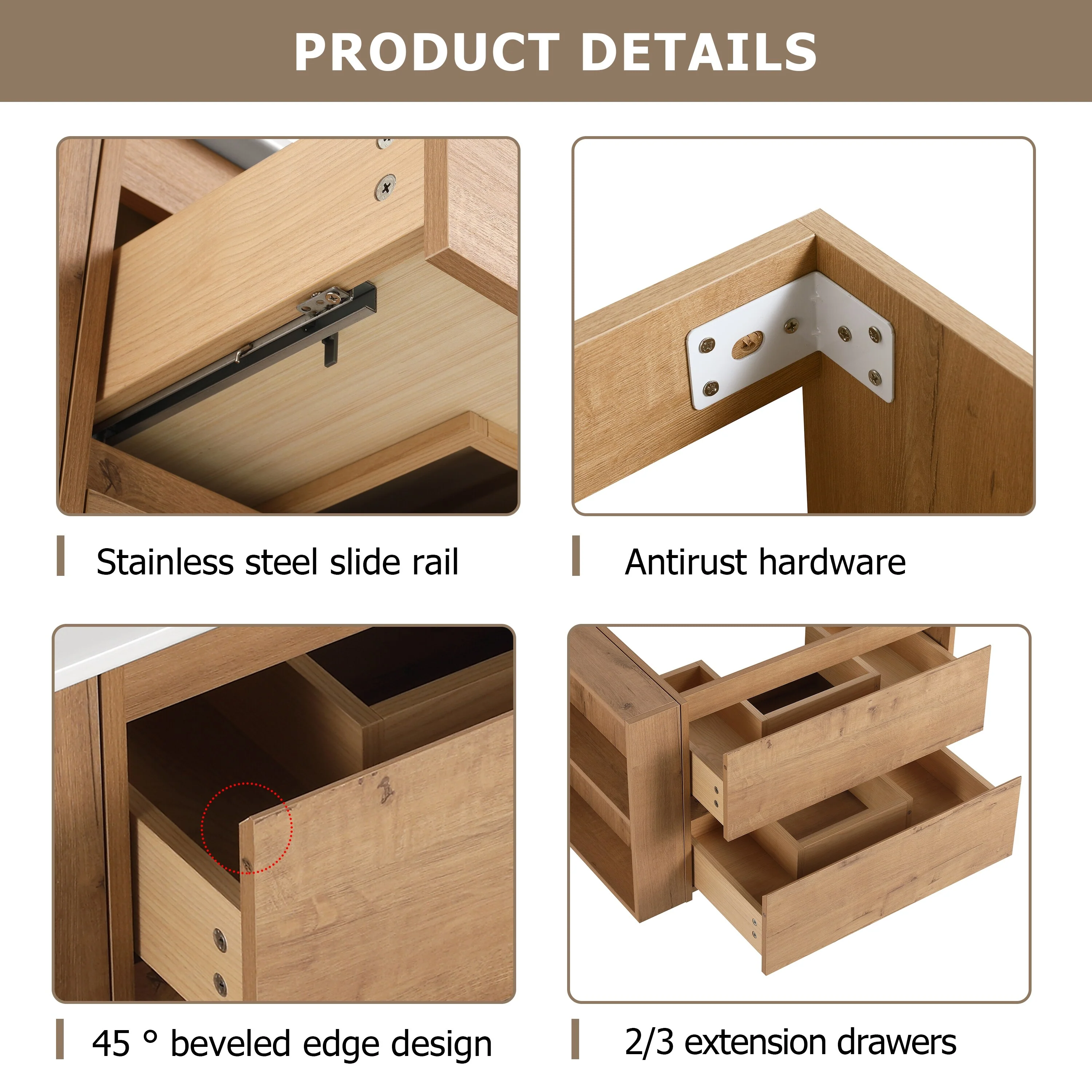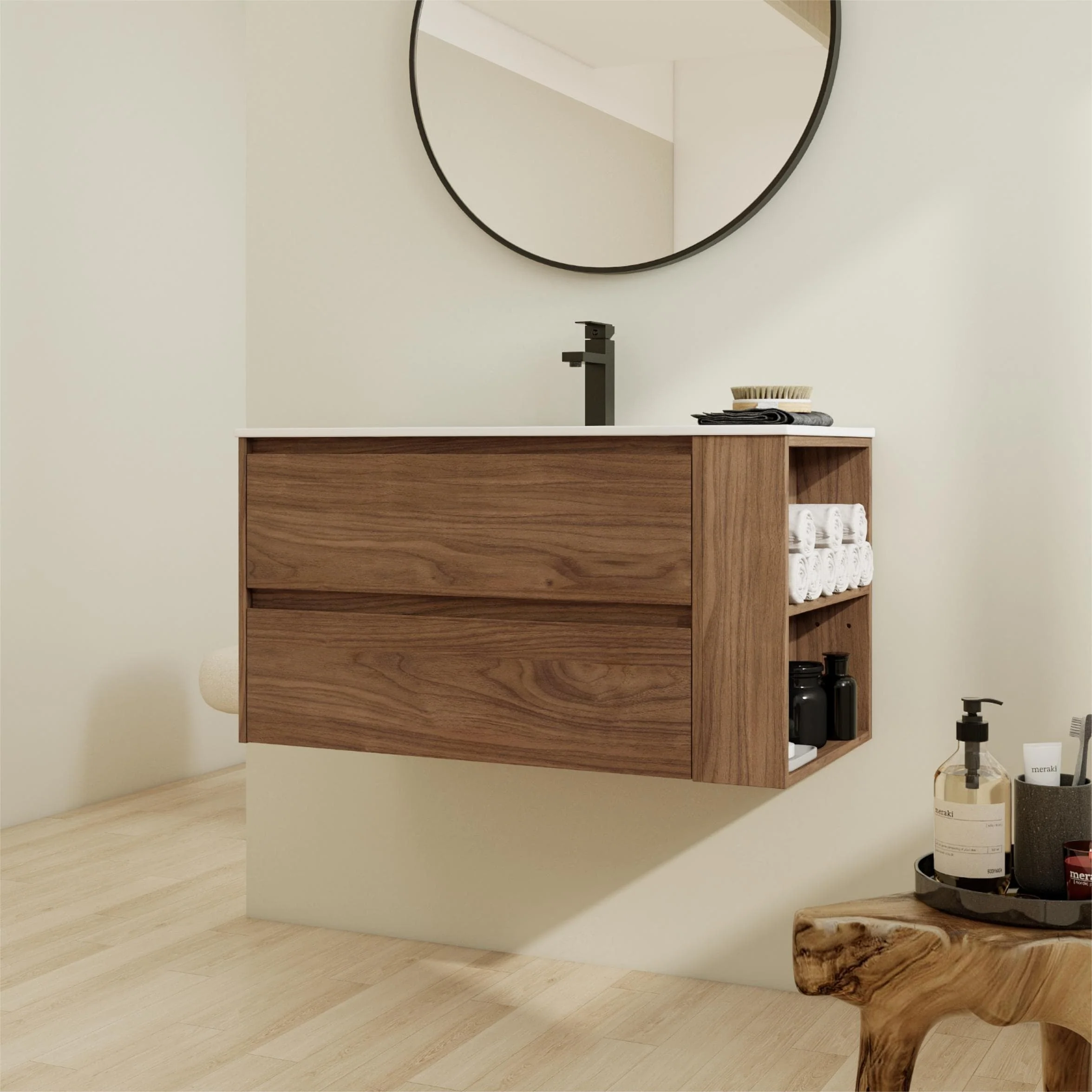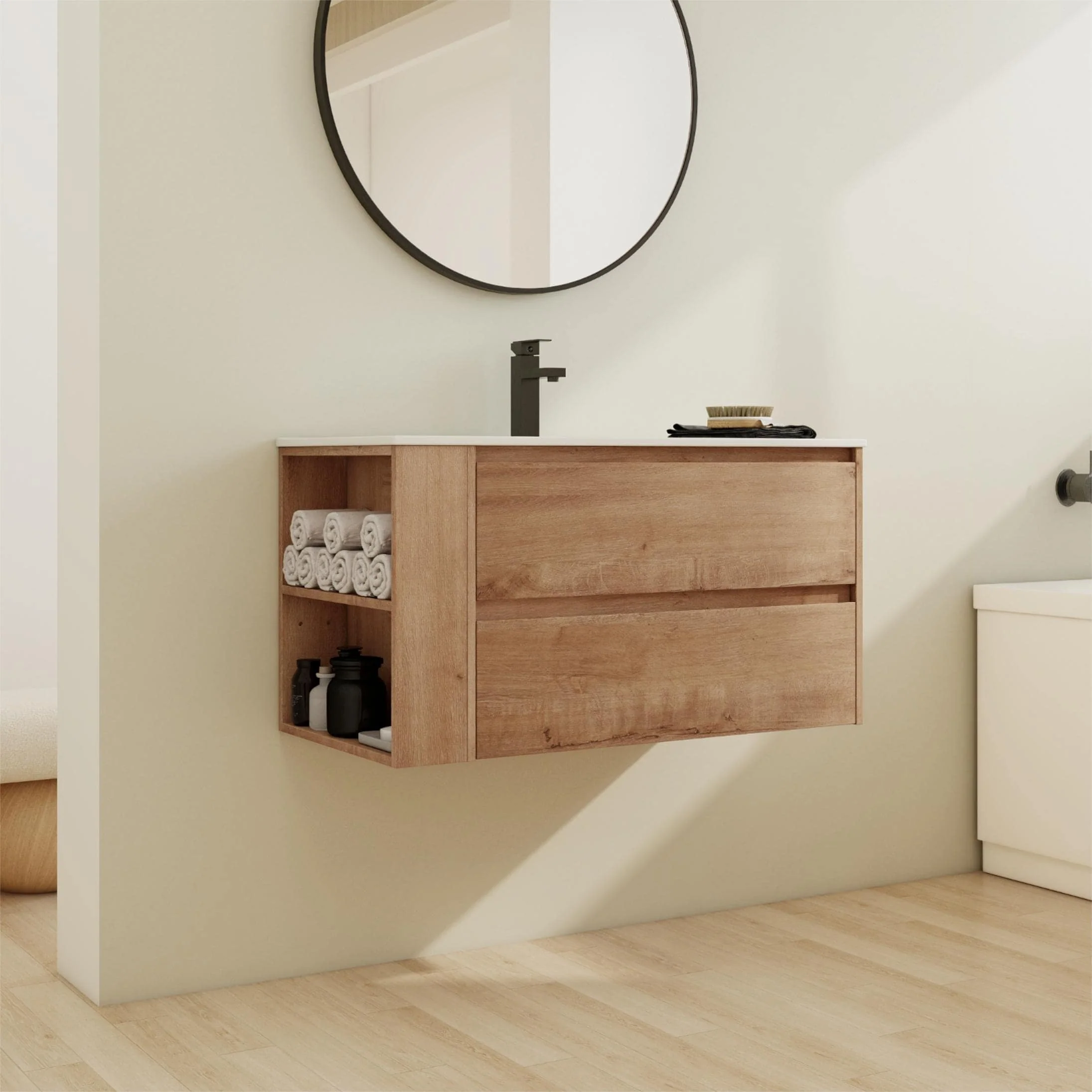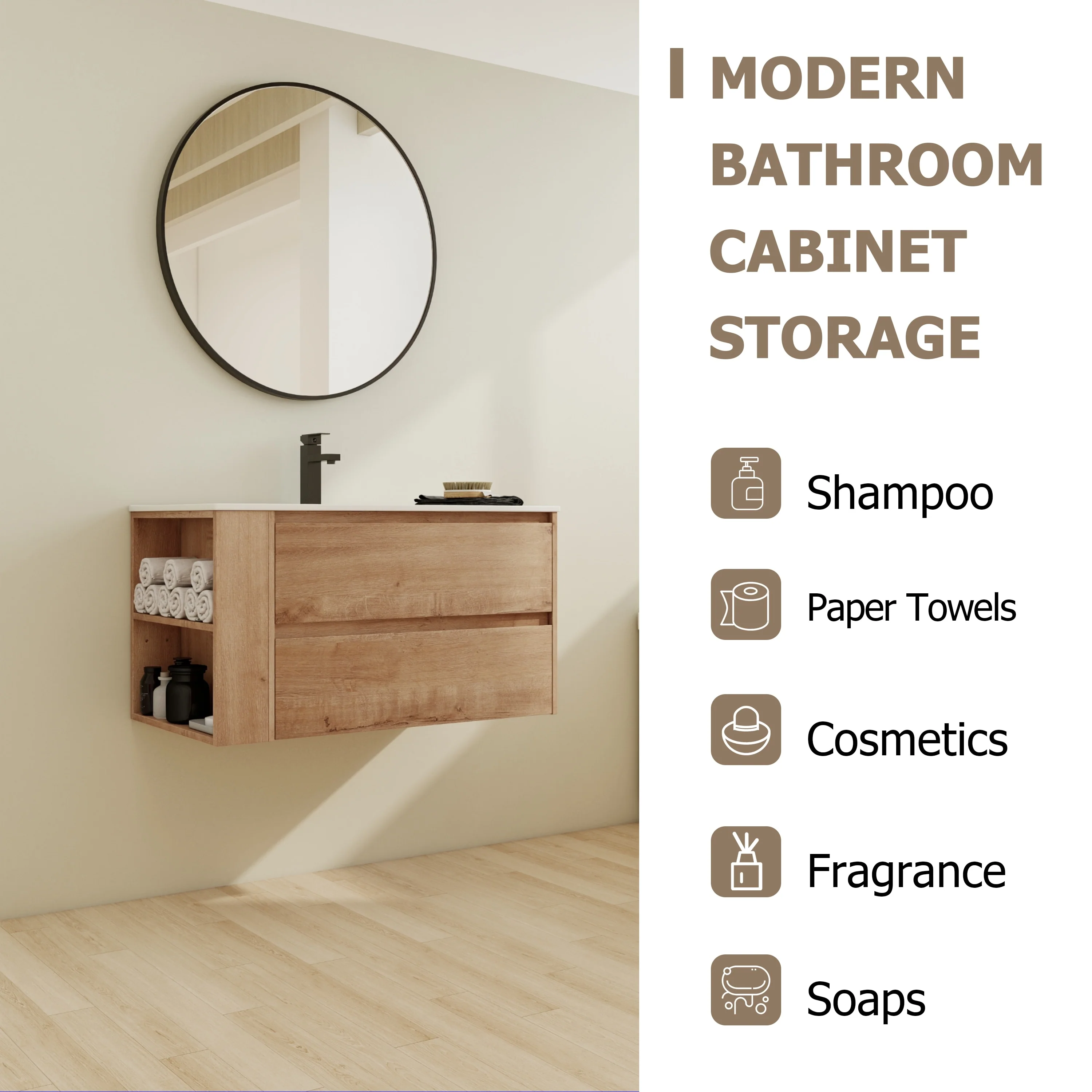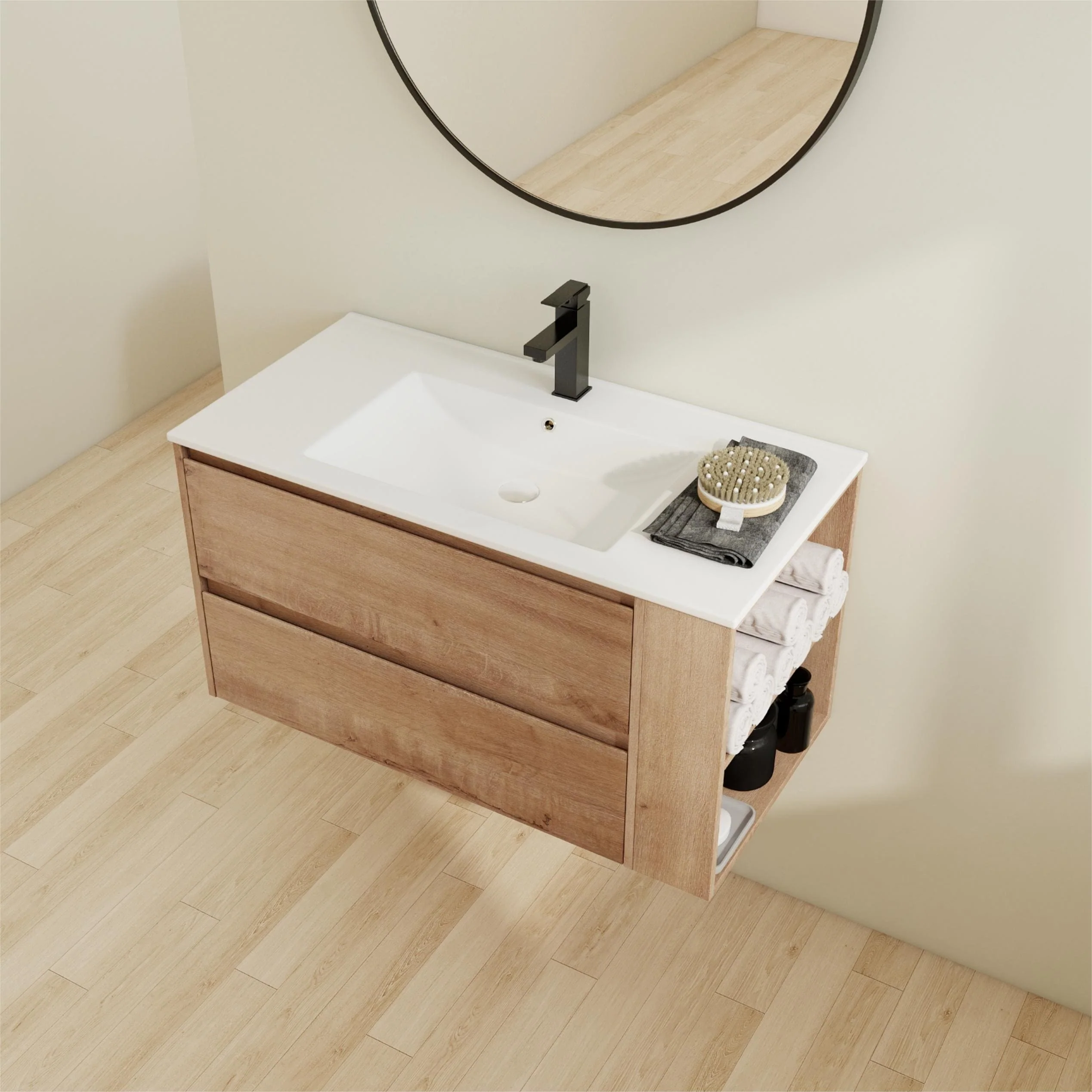 This modern and ergonomic vanity comes with soft-close drawers, providing ample storage space for all your bathroom essentials. The side adjustable shelves allow for free customization of space.
