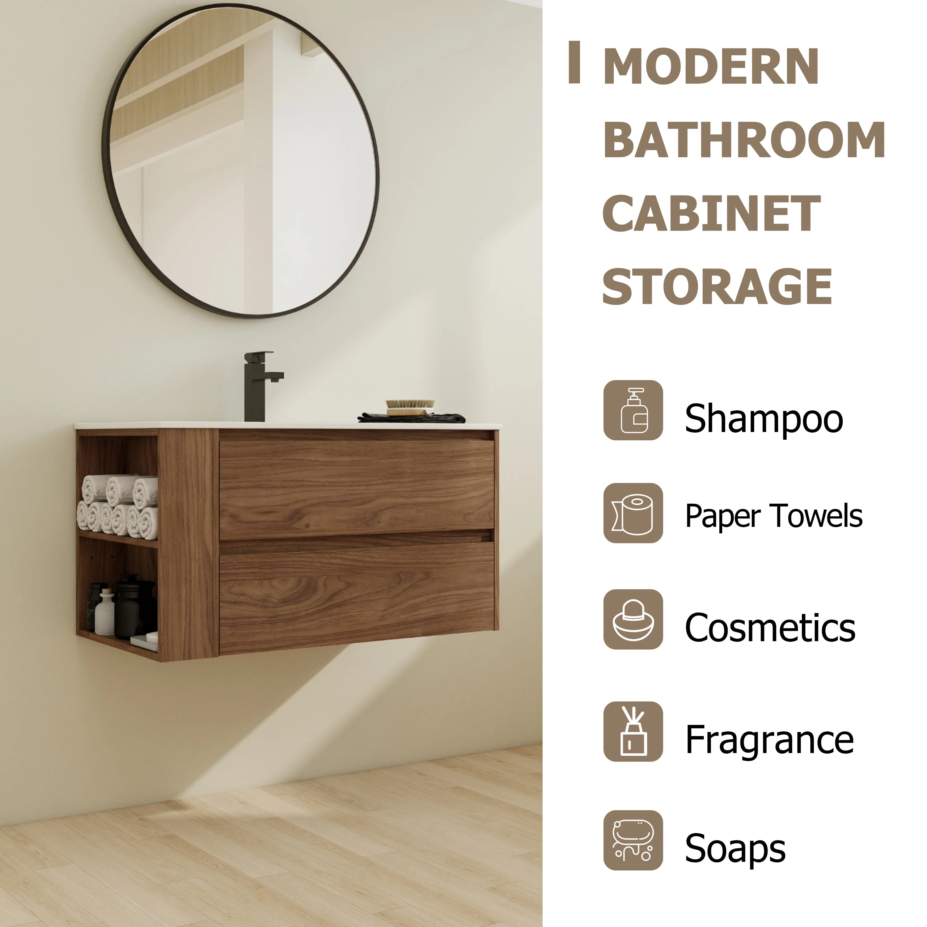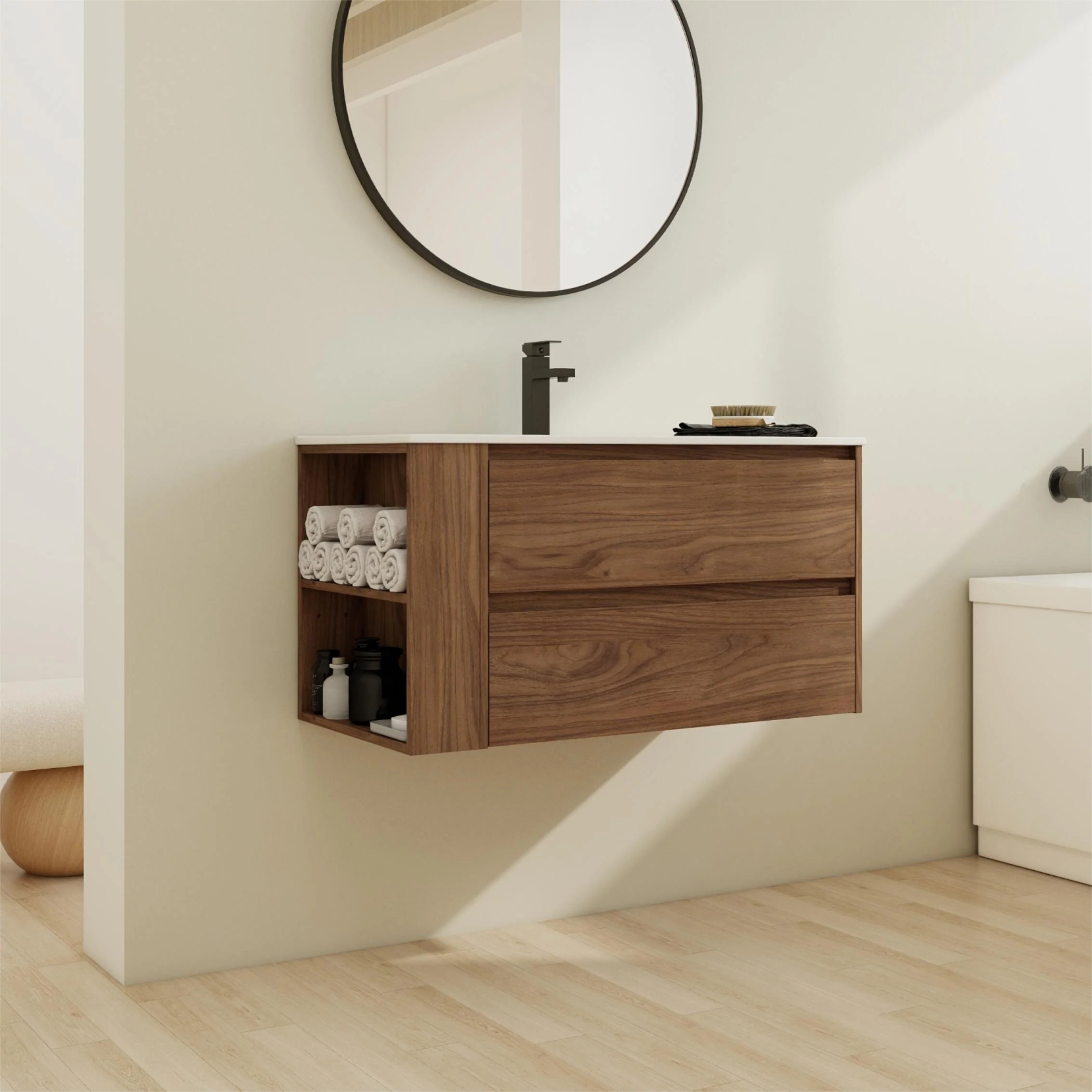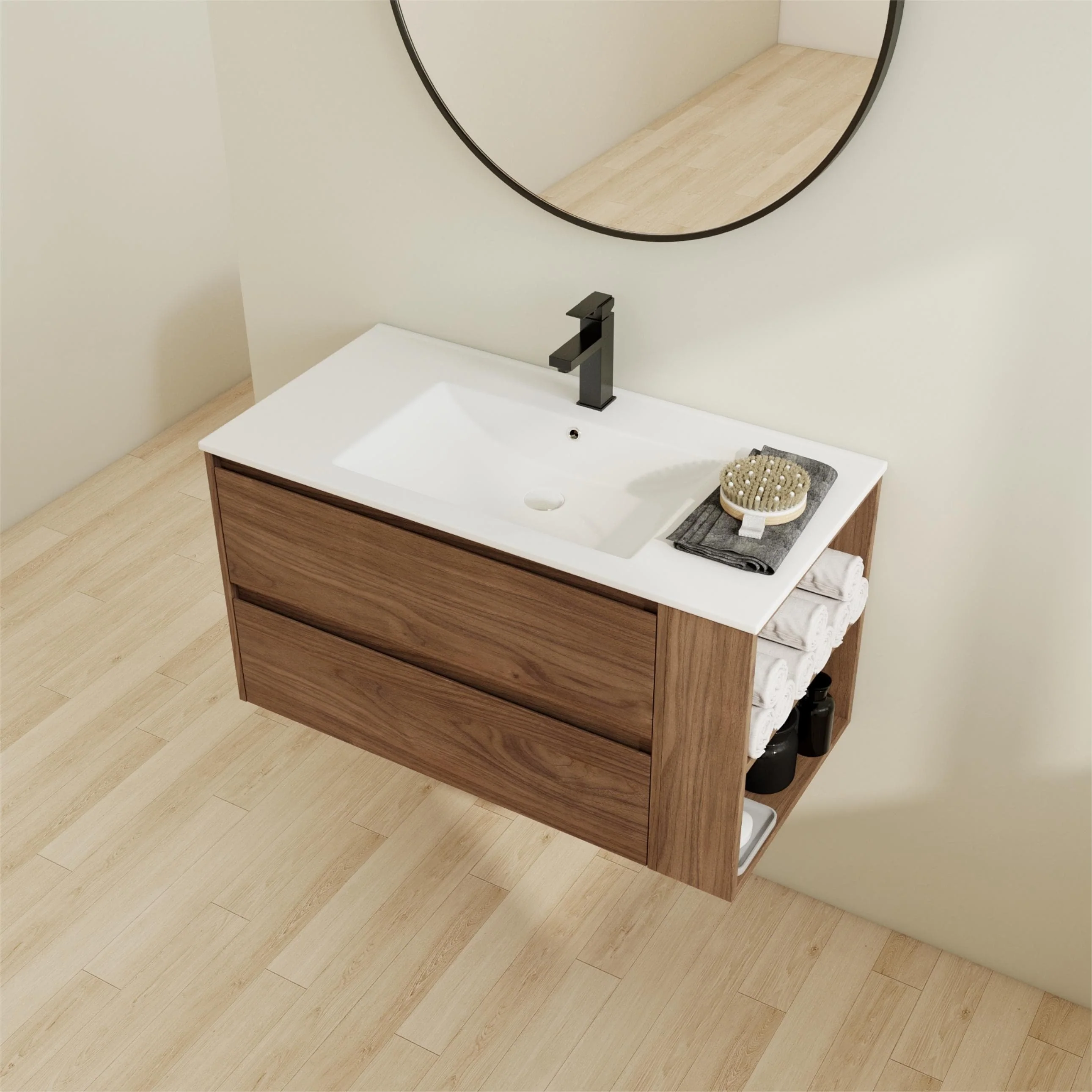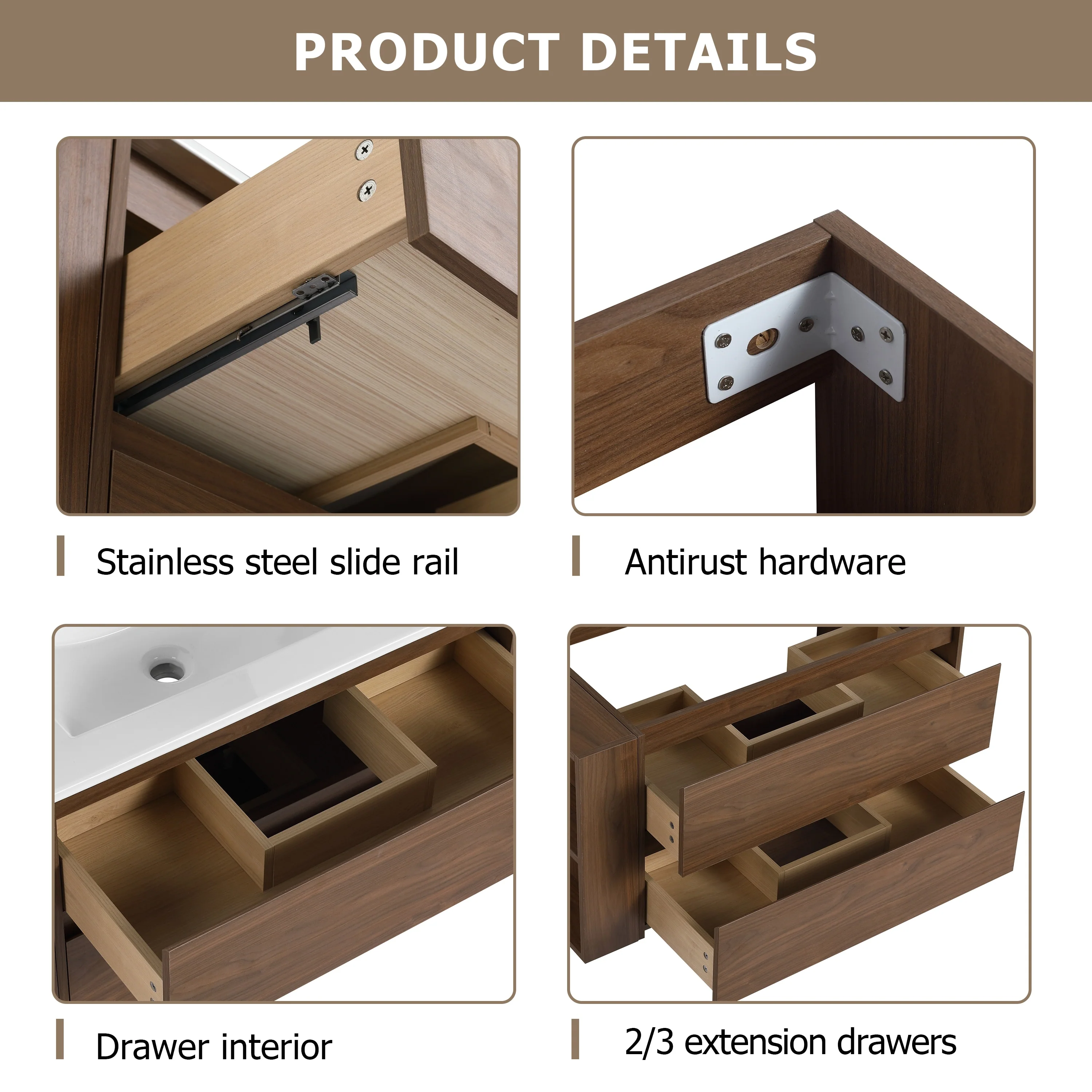 This modern and ergonomic vanity comes with soft-close drawers, providing ample storage space for all your bathroom essentials. The side adjustable shelves allow for free customization of space.