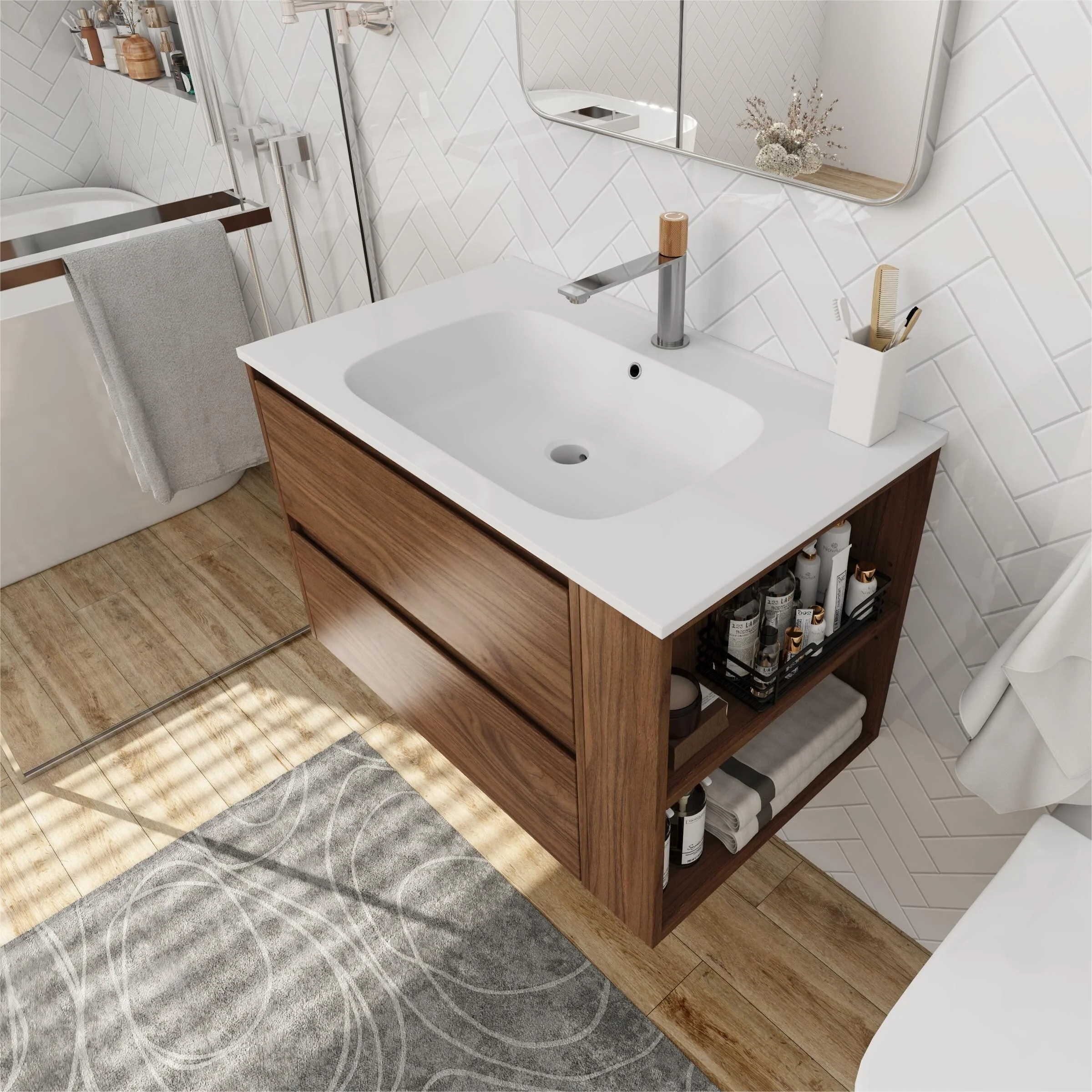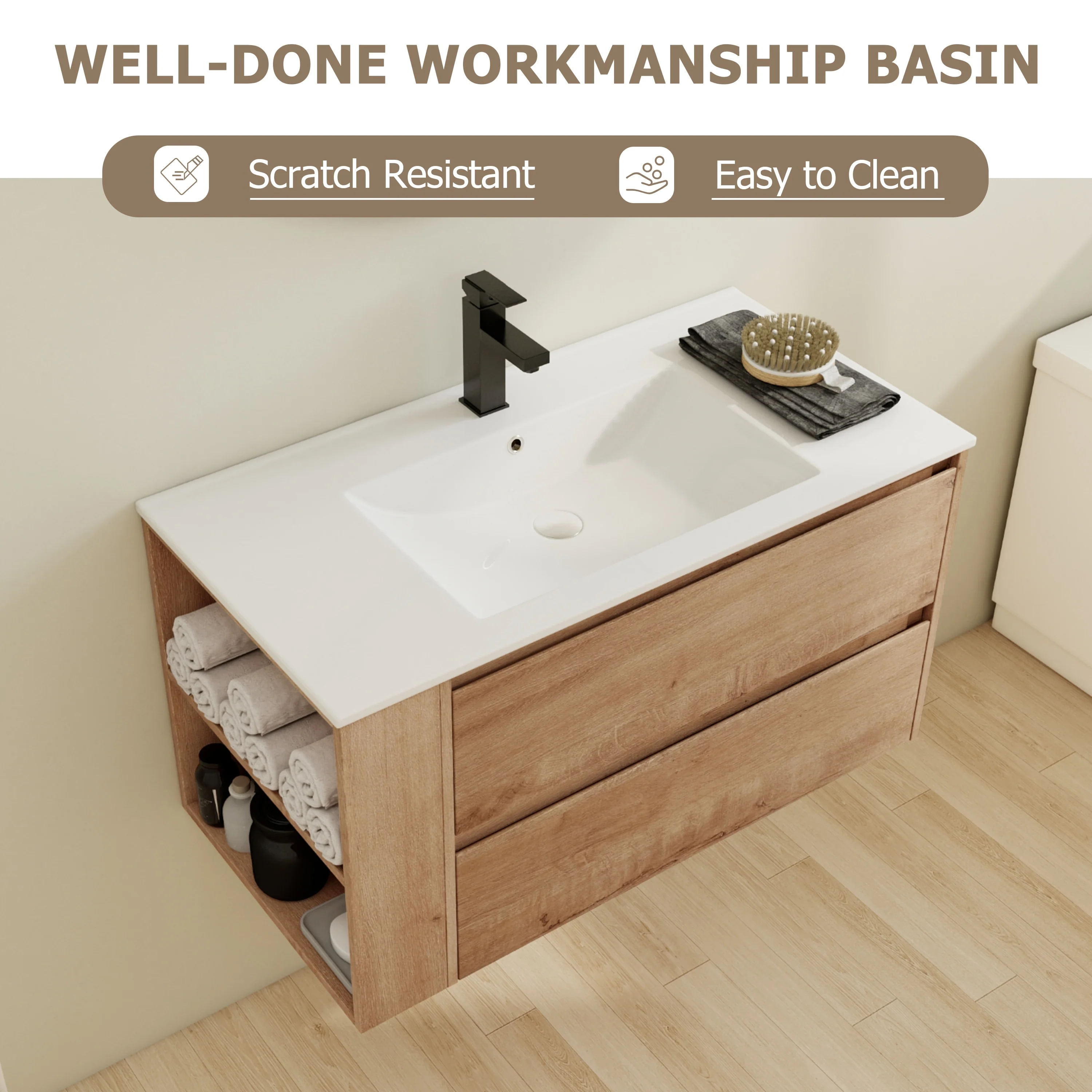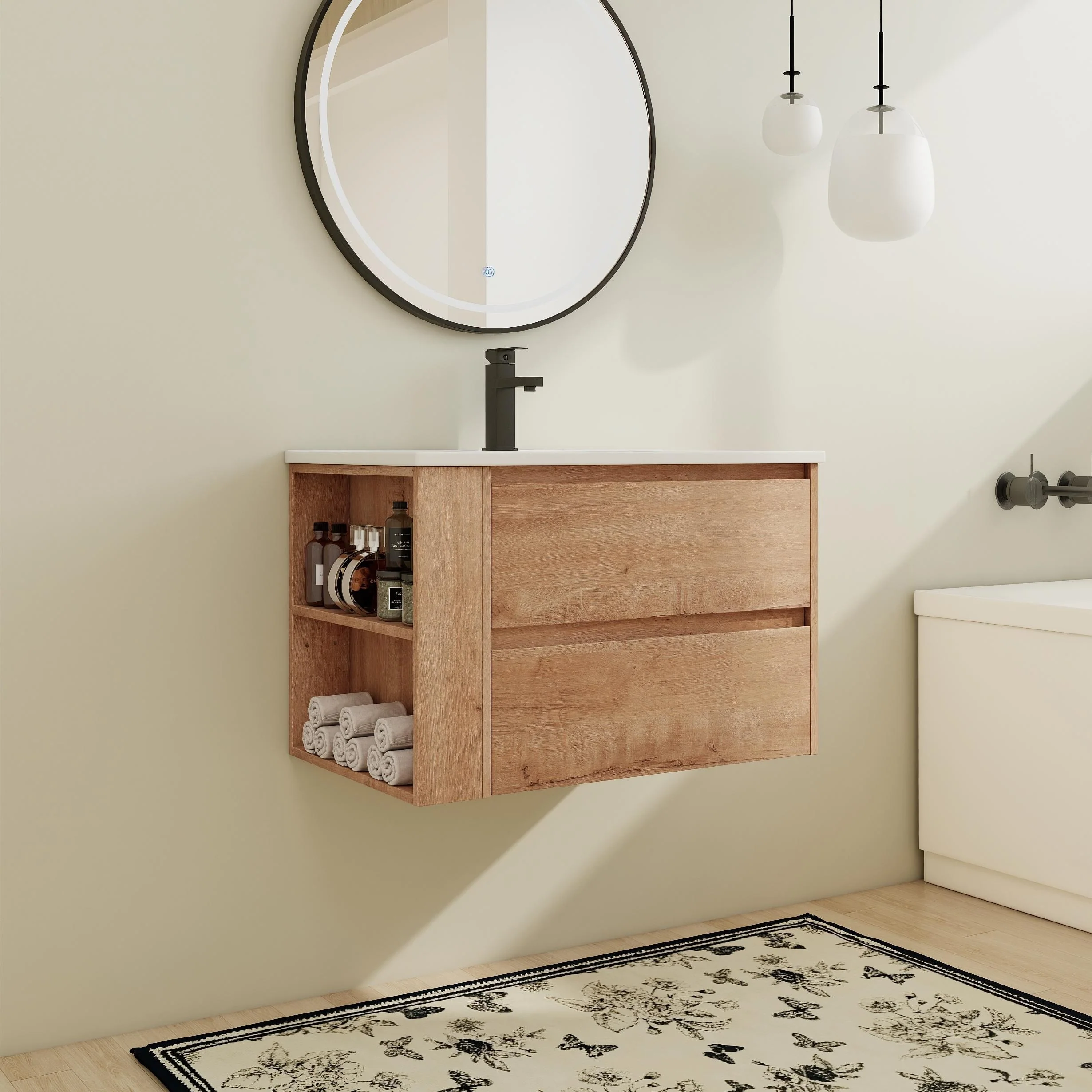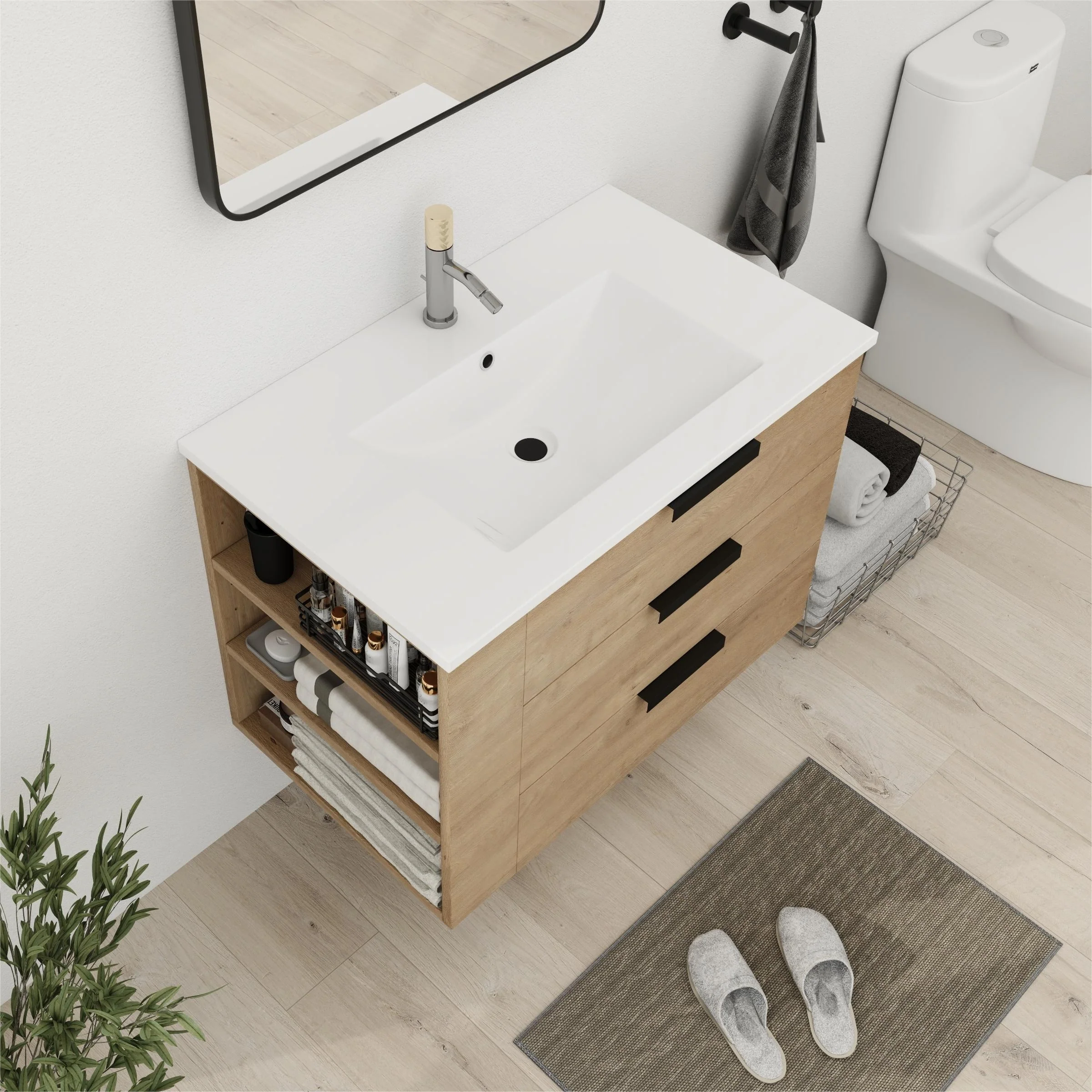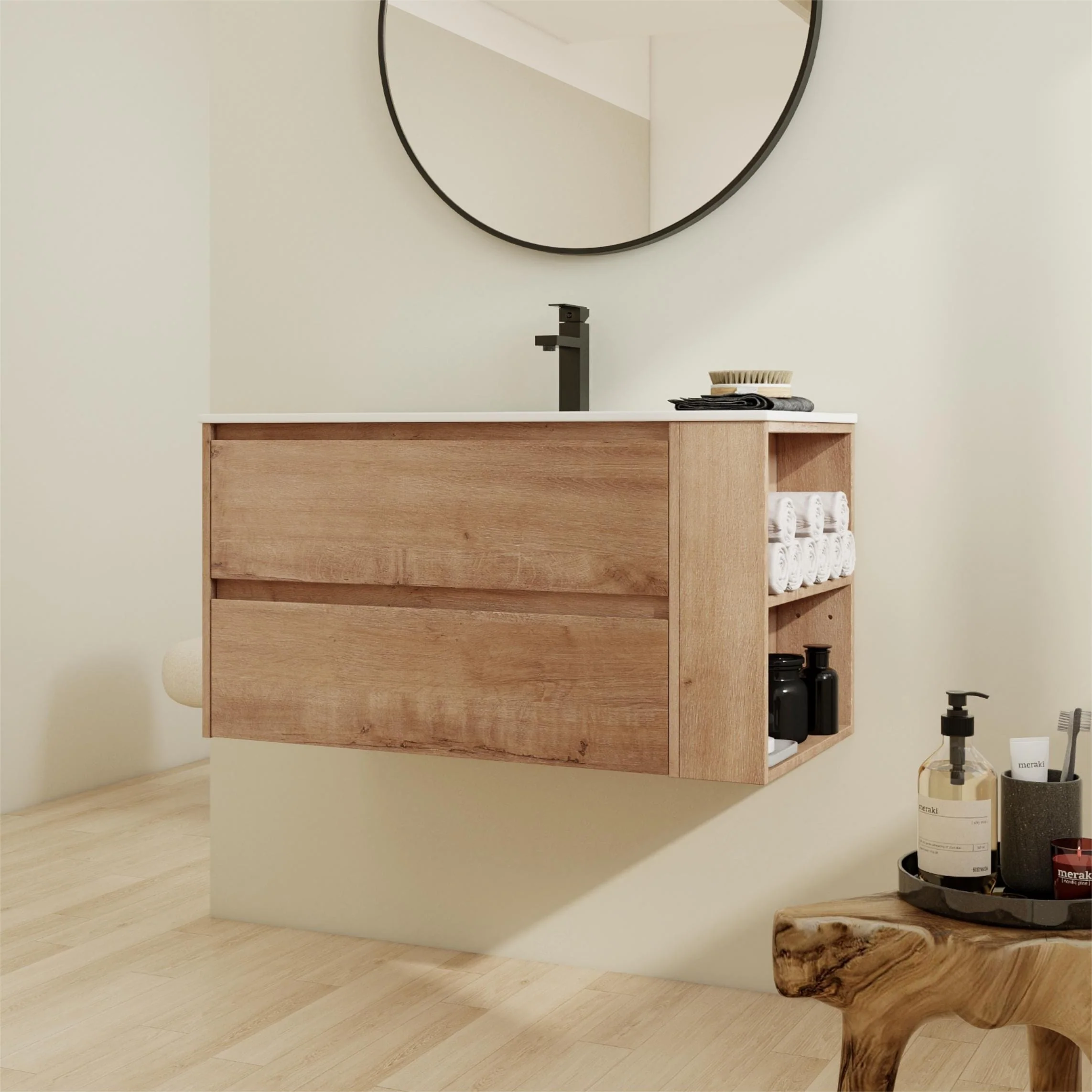 This modern and ergonomic vanity comes with soft-close drawers, providing ample storage space for all your bathroom essentials. The side adjustable shelves allow for free customization of space.