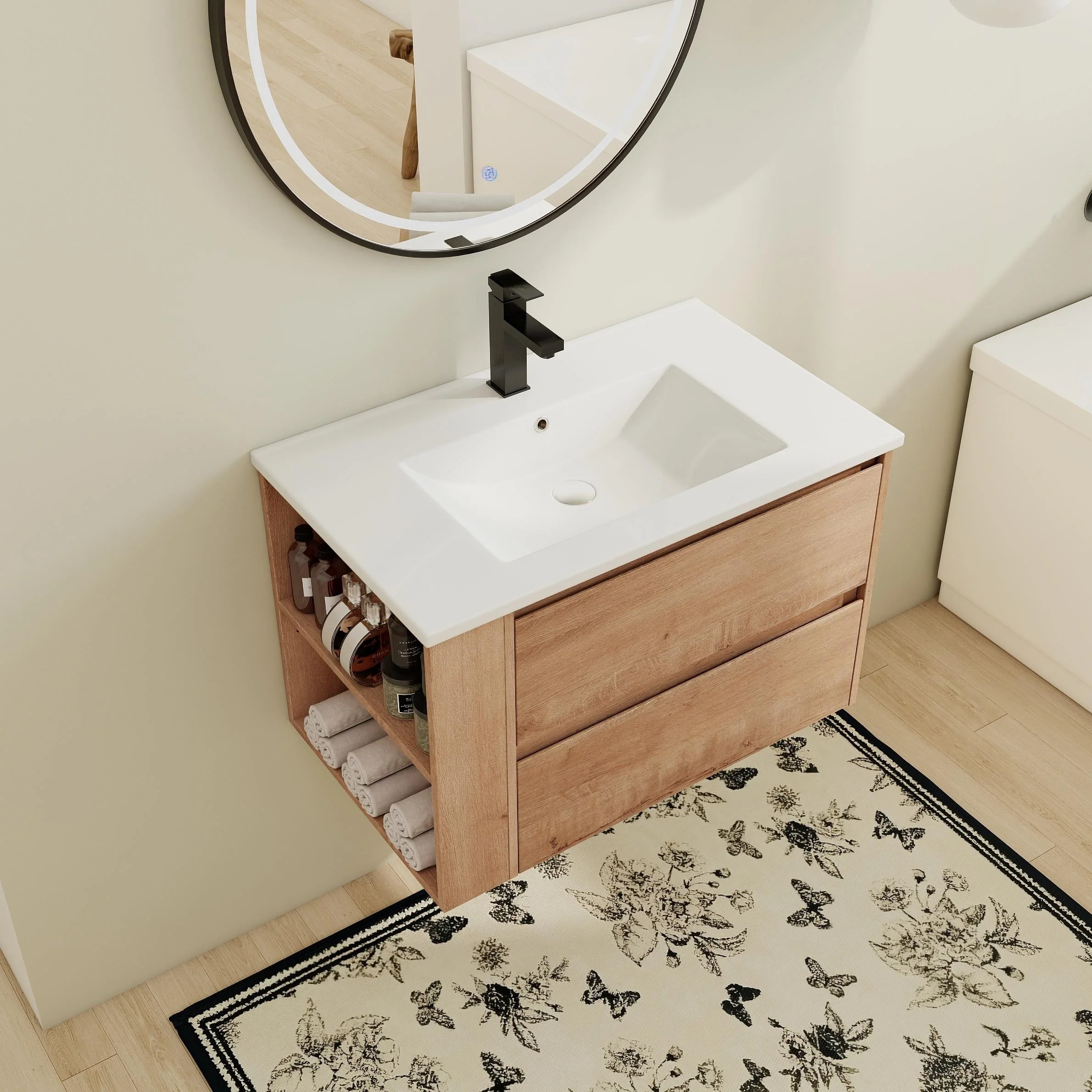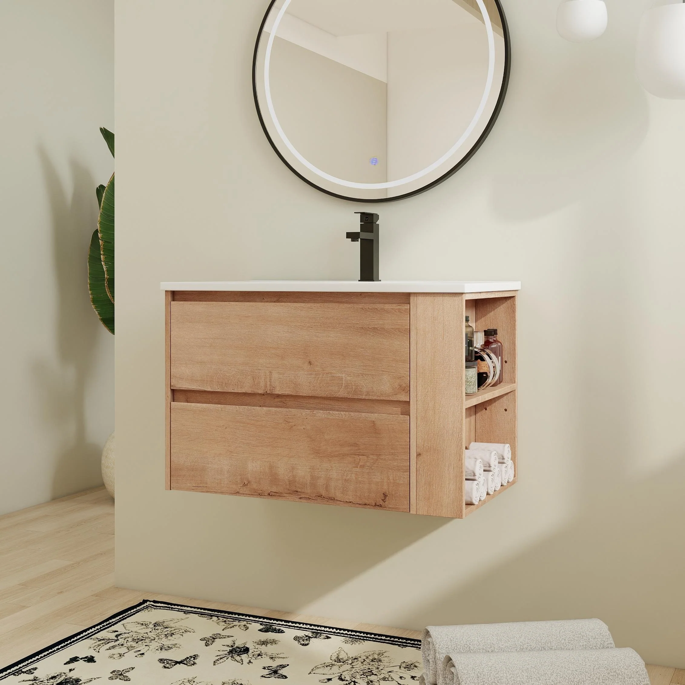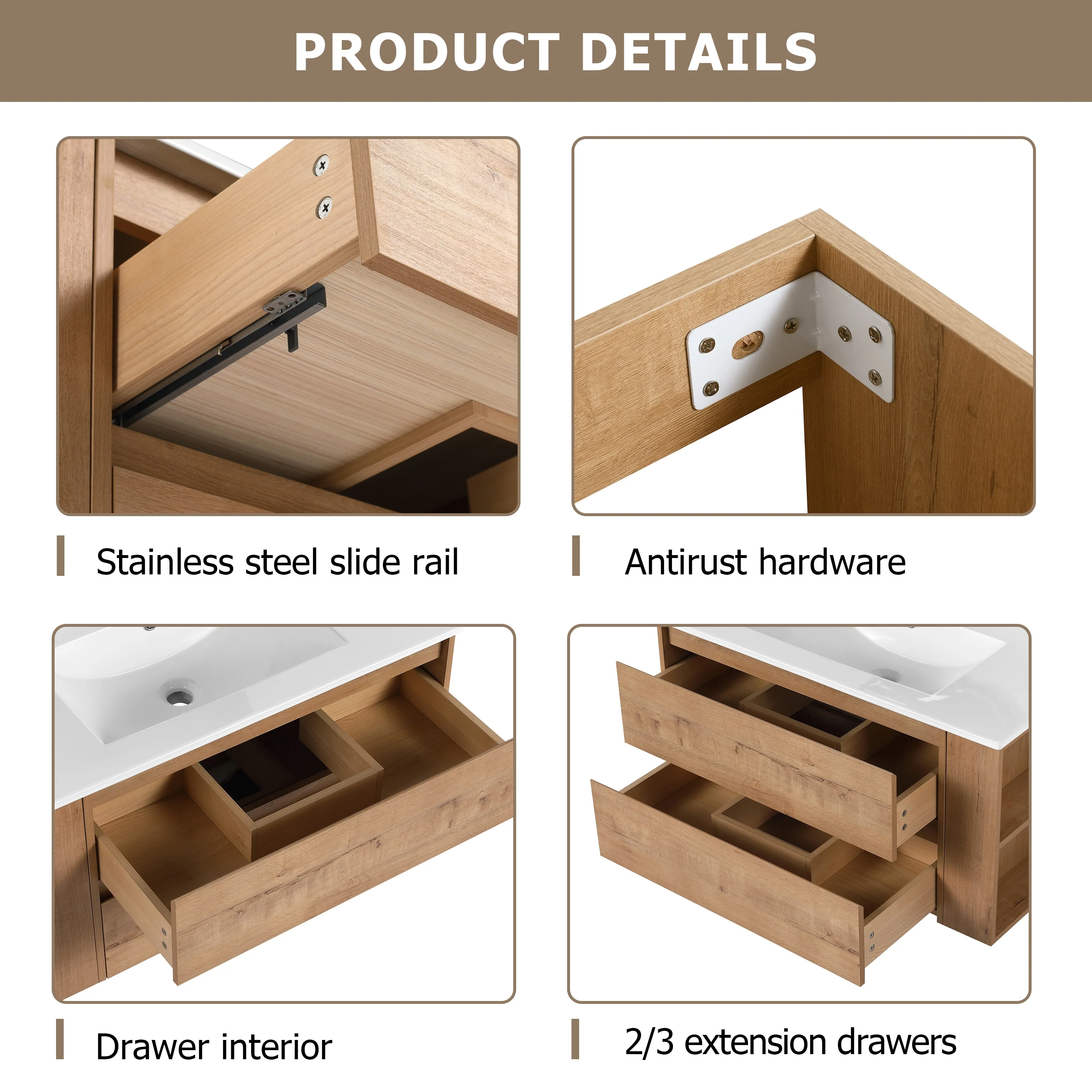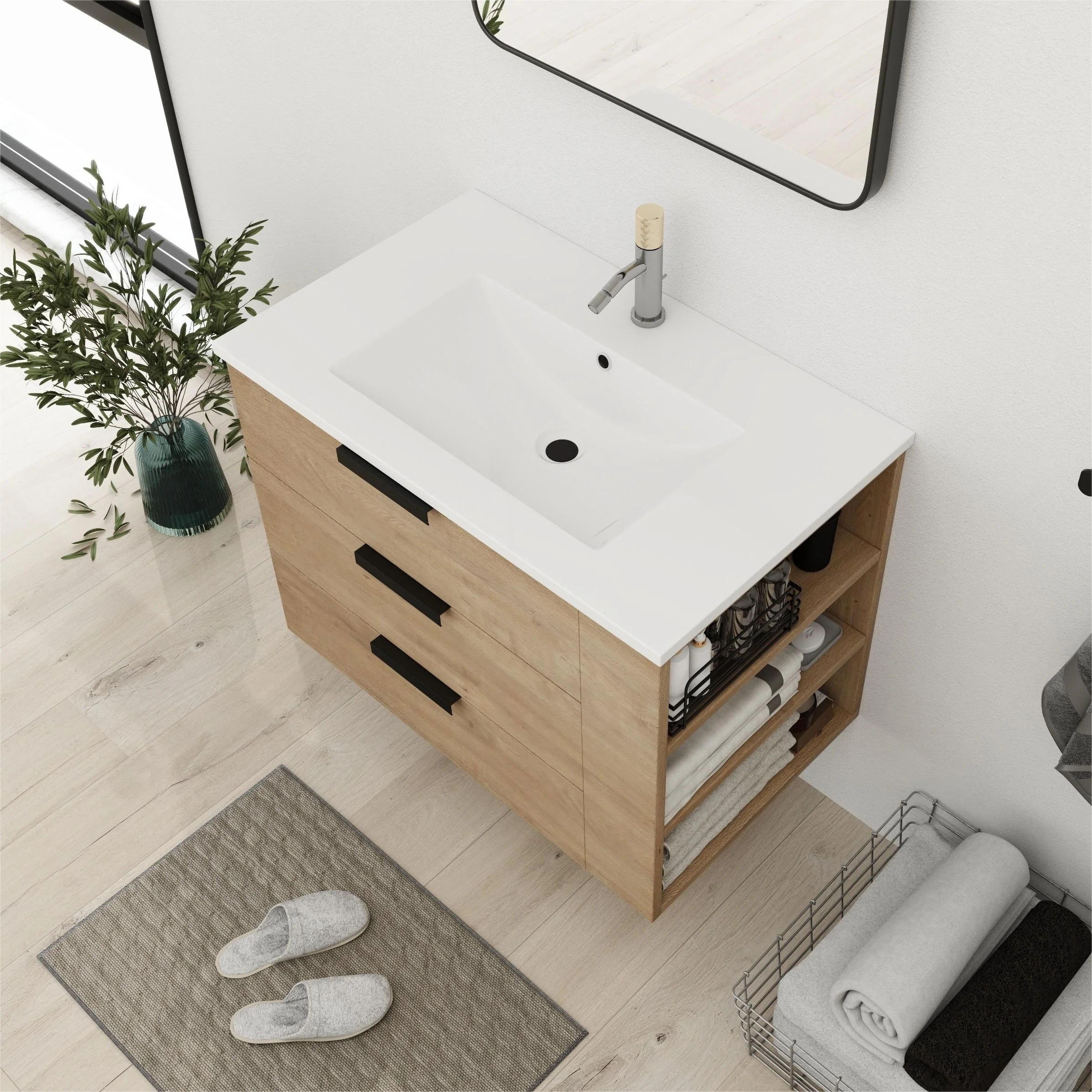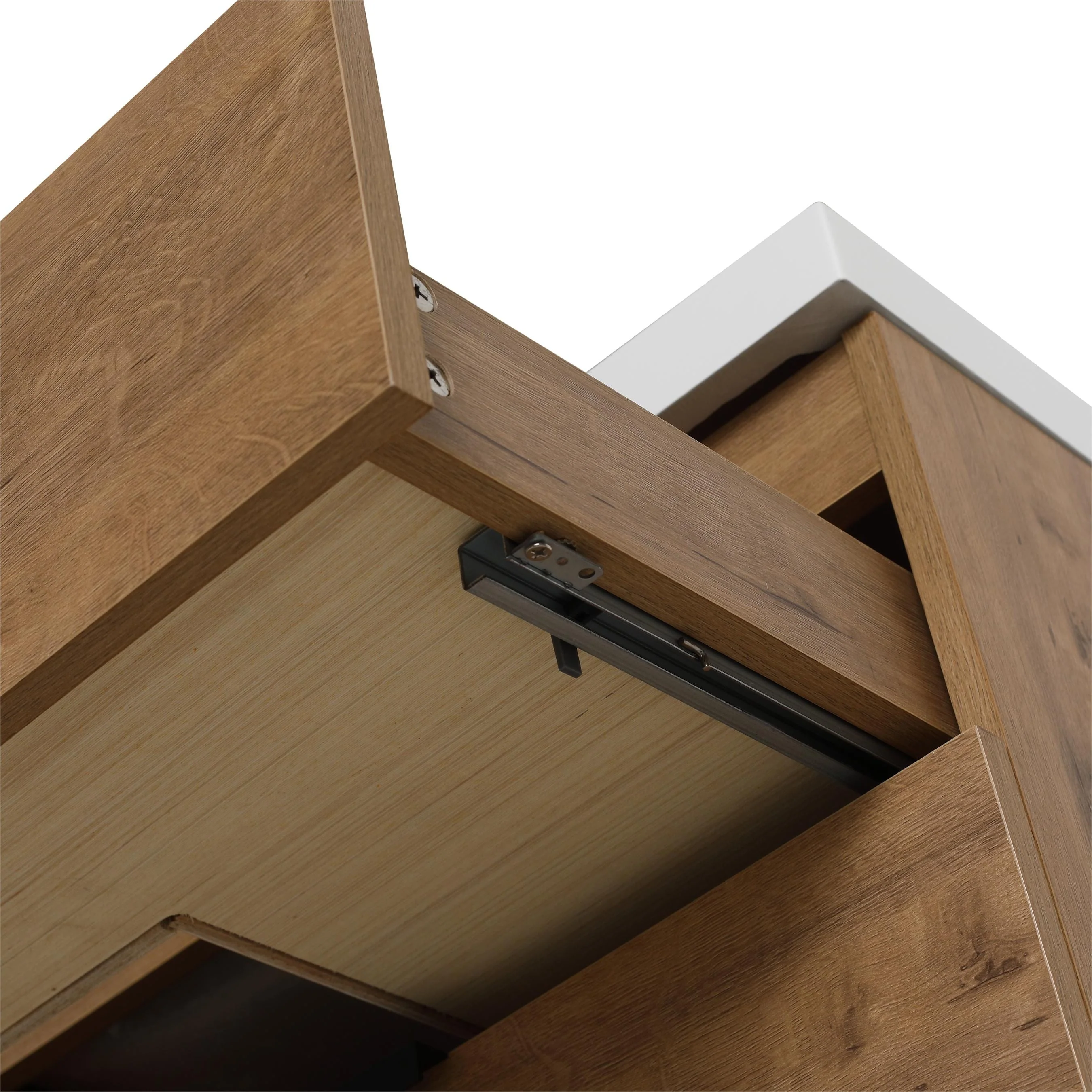 This modern and ergonomic vanity comes with soft-close drawers, providing ample storage space for all your bathroom essentials. The side adjustable shelves allow for free customization of space.