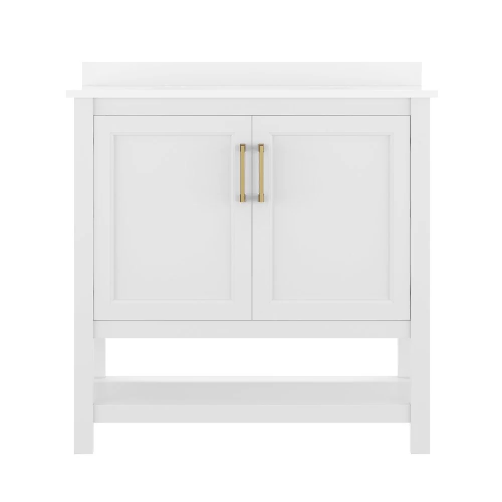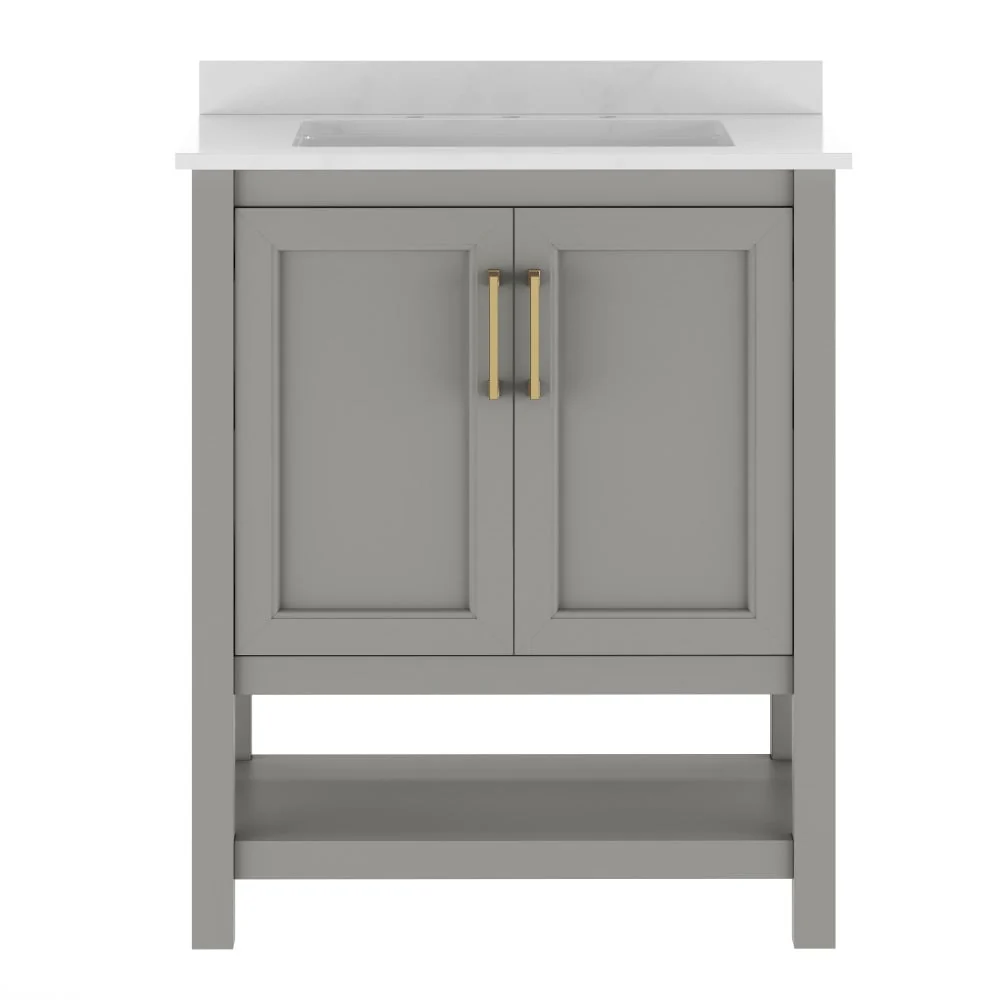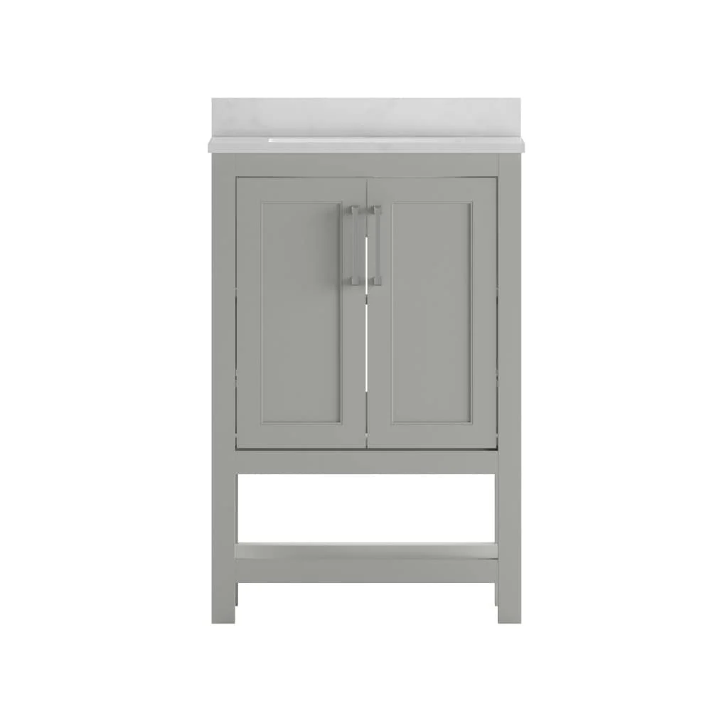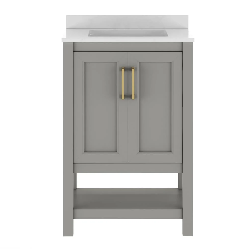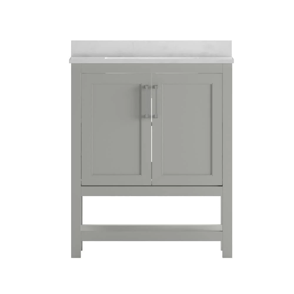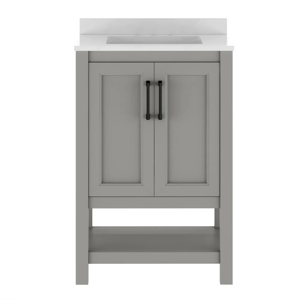 Next to the kitchen, a bathroom upgrade can be the most expensive remodel you will do so if you need a new look, but a total overhaul is not in the budget, this bathroom vanity with sink is the perfect high impact solution. Featuring a stunning Carrara marble finished counter top with an on-trend ceramic undermount sink atop a wooden storage cabinet, available in multiple finishes and boasting gorgeous metal handles, this vanity and sink combo will instantly refresh your powder room. The included backsplash may be installed or if you like the minimalist look, you can choose to leave it off. Beautiful style is just the tip of the iceberg for this upmarket vanity set. Soft close doors open to reveal ample interior storage with an adjustable height shelf then close whisper quiet. A lower open storage shelf is perfect for linens or decor to showcase your personal style. The engineered wood cabinet will stand up to moisture and humidity, holds up to 400 lbs. static weight, and arrives with adjustable floor glides for a level surface. Best of all, your new vanity ships in one box with the cabinet and sink already assembled and pre-drilled faucet holes with 4'-8' spacing. The handles are preassembled inside the cabinet to keep them pristine so just remove them an reinstall them on the outside of the doors and you are ready to go. Wipe with a damp cloth to maintain that just out of the box appearance.