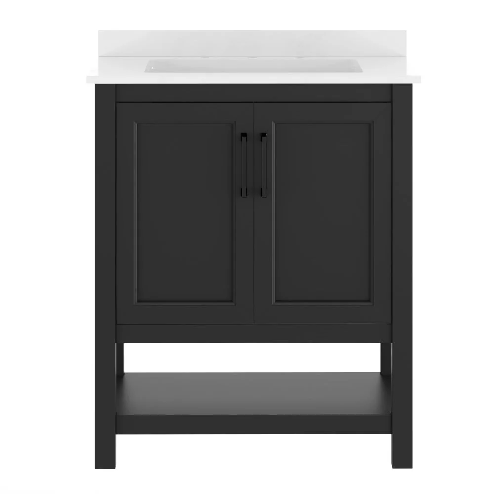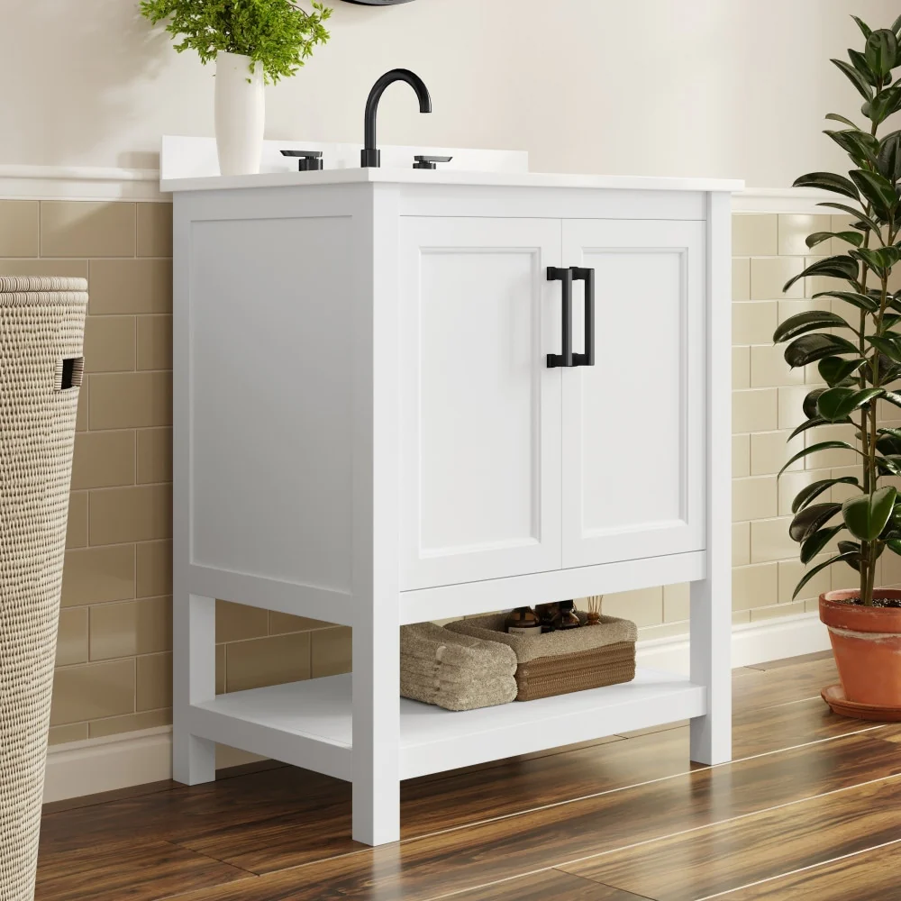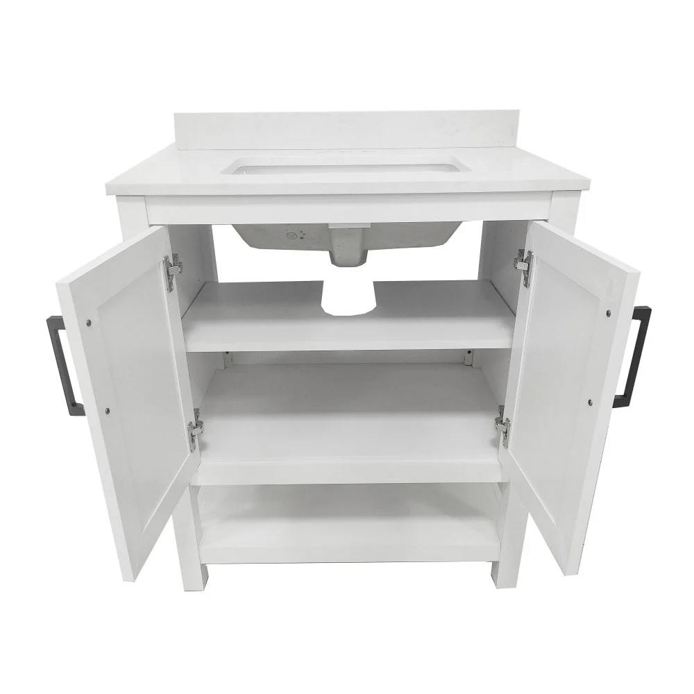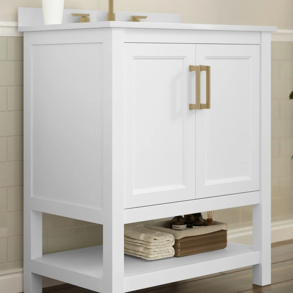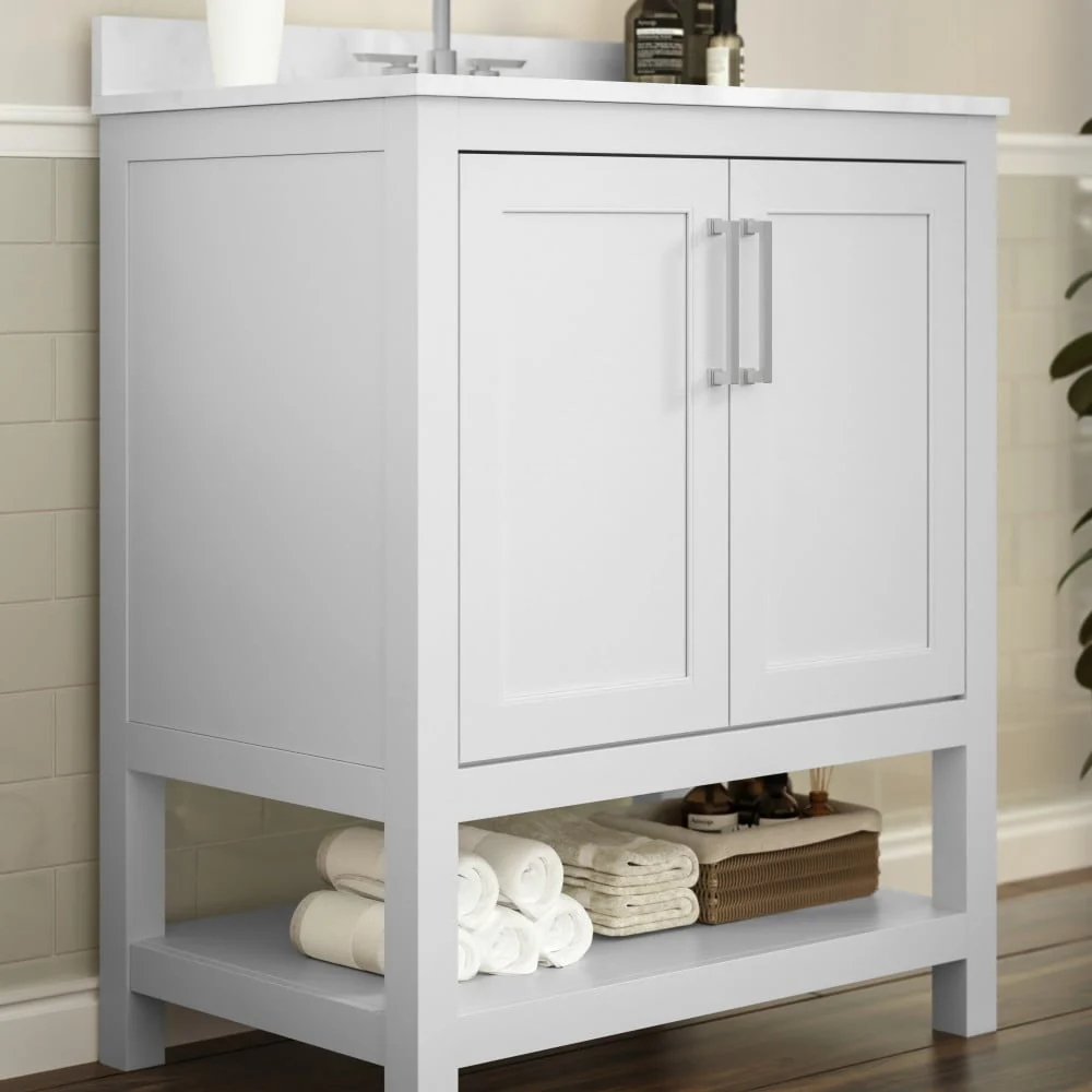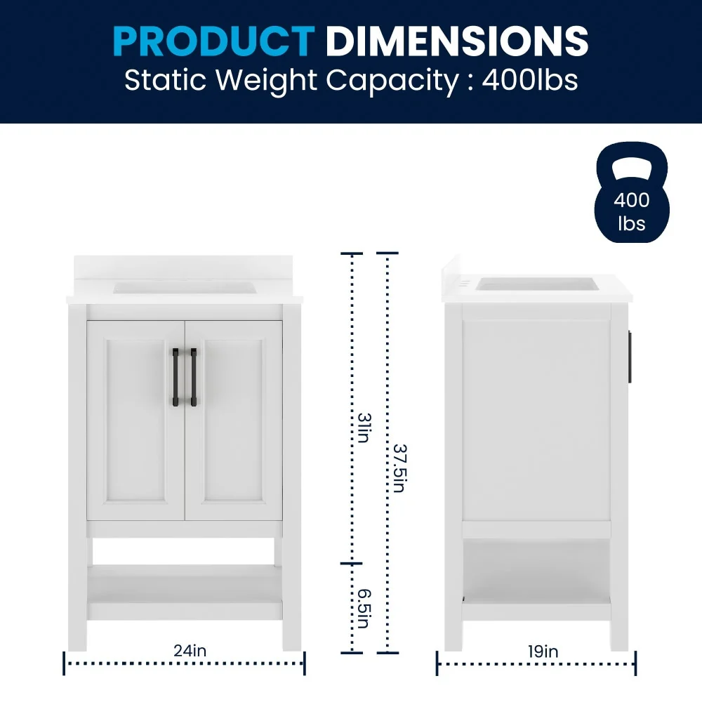 Next to the kitchen, a bathroom upgrade can be the most expensive remodel you will do so if you need a new look, but a total overhaul is not in the budget, this bathroom vanity with sink is the perfect high impact solution. Featuring a stunning Carrara marble finished counter top with an on-trend ceramic undermount sink atop a wooden storage cabinet, available in multiple finishes and boasting gorgeous metal handles, this vanity and sink combo will instantly refresh your powder room. The included backsplash may be installed or if you like the minimalist look, you can choose to leave it off. Beautiful style is just the tip of the iceberg for this upmarket vanity set. Soft close doors open to reveal ample interior storage with an adjustable height shelf then close whisper quiet. A lower open storage shelf is perfect for linens or decor to showcase your personal style. The engineered wood cabinet will stand up to moisture and humidity, holds up to 400 lbs. static weight, and arrives with adjustable floor glides for a level surface. Best of all, your new vanity ships in one box with the cabinet and sink already assembled and pre-drilled faucet holes with 4'-8' spacing. The handles are preassembled inside the cabinet to keep them pristine so just remove them an reinstall them on the outside of the doors and you are ready to go. Wipe with a damp cloth to maintain that just out of the box appearance.