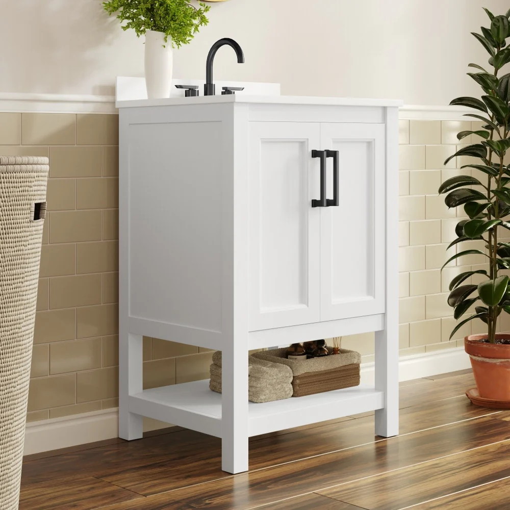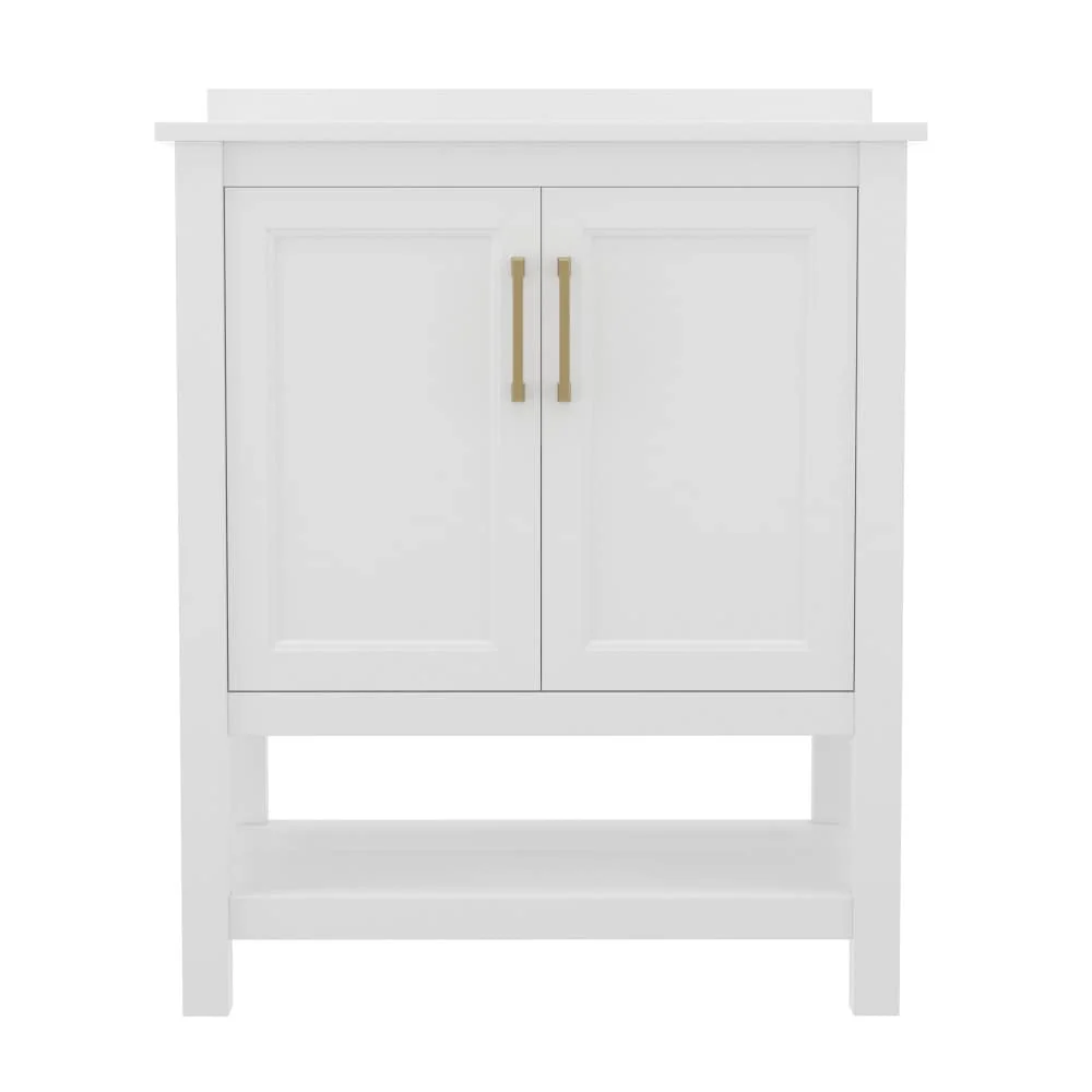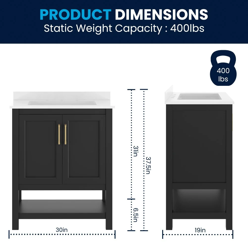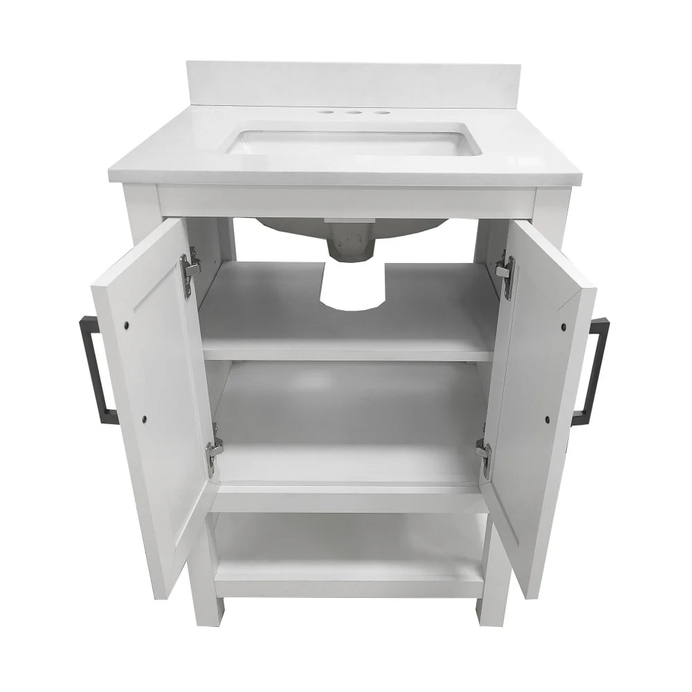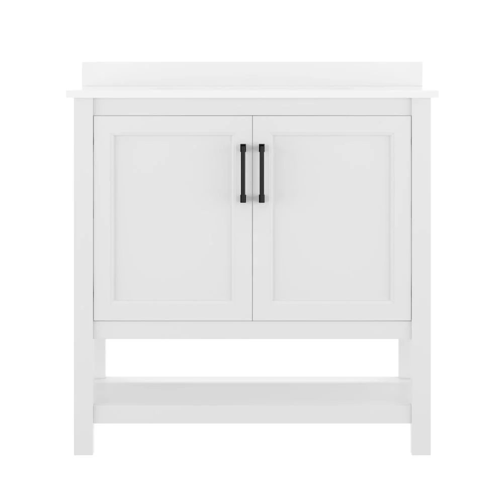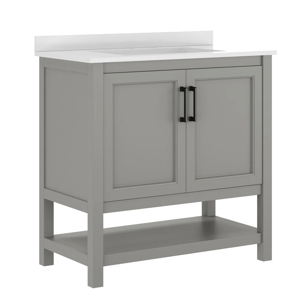 Next to the kitchen, a bathroom upgrade can be the most expensive remodel you will do so if you need a new look, but a total overhaul is not in the budget, this bathroom vanity with sink is the perfect high impact solution. Featuring a stunning Carrara marble finished counter top with an on-trend ceramic undermount sink atop a wooden storage cabinet, available in multiple finishes and boasting gorgeous metal handles, this vanity and sink combo will instantly refresh your powder room. The included backsplash may be installed or if you like the minimalist look, you can choose to leave it off. Beautiful style is just the tip of the iceberg for this upmarket vanity set. Soft close doors open to reveal ample interior storage with an adjustable height shelf then close whisper quiet. A lower open storage shelf is perfect for linens or decor to showcase your personal style. The engineered wood cabinet will stand up to moisture and humidity, holds up to 400 lbs. static weight, and arrives with adjustable floor glides for a level surface. Best of all, your new vanity ships in one box with the cabinet and sink already assembled and pre-drilled faucet holes with 4'-8' spacing. The handles are preassembled inside the cabinet to keep them pristine so just remove them an reinstall them on the outside of the doors and you are ready to go. Wipe with a damp cloth to maintain that just out of the box appearance.