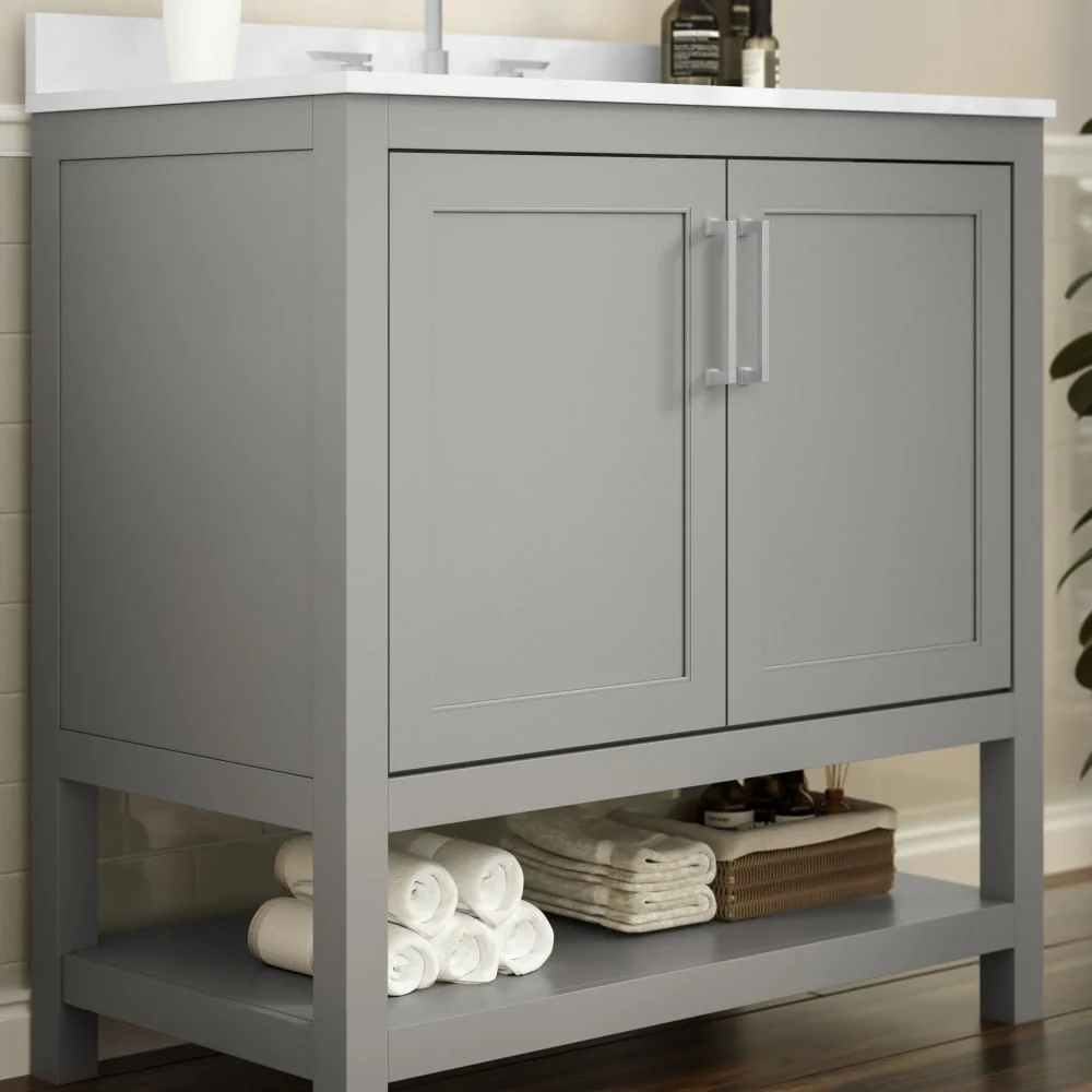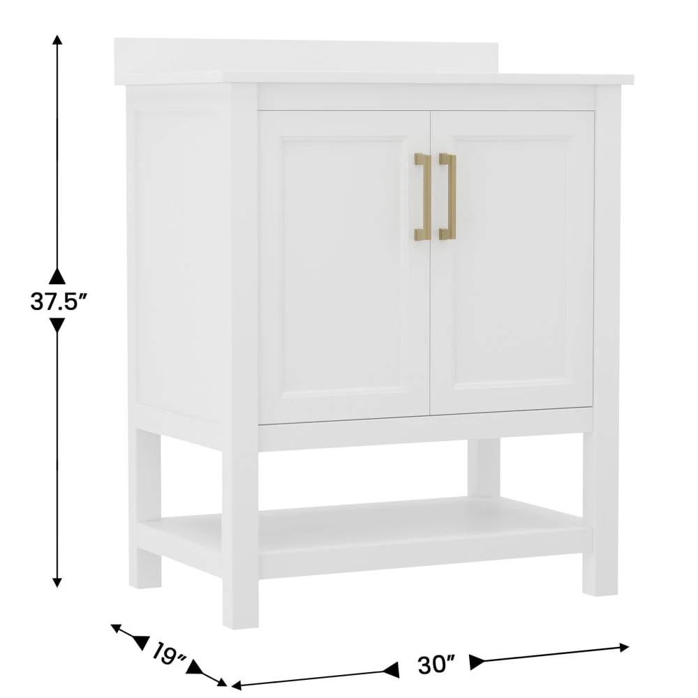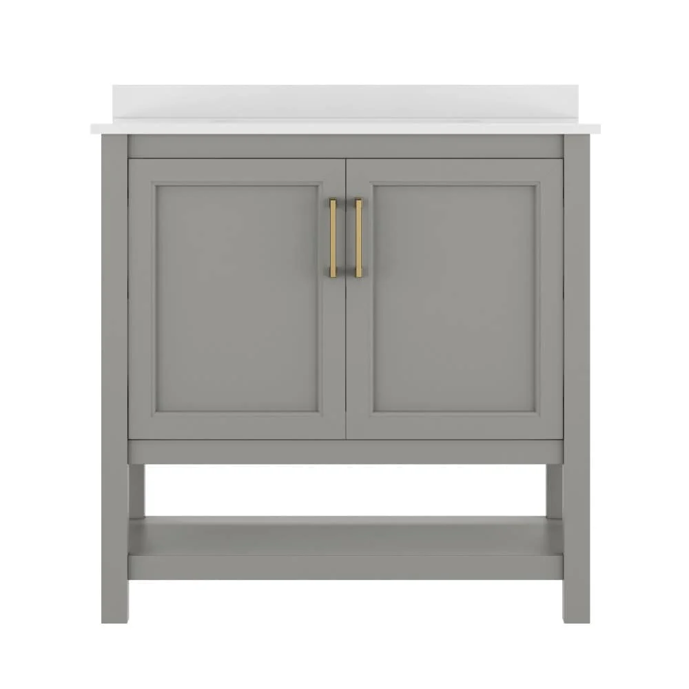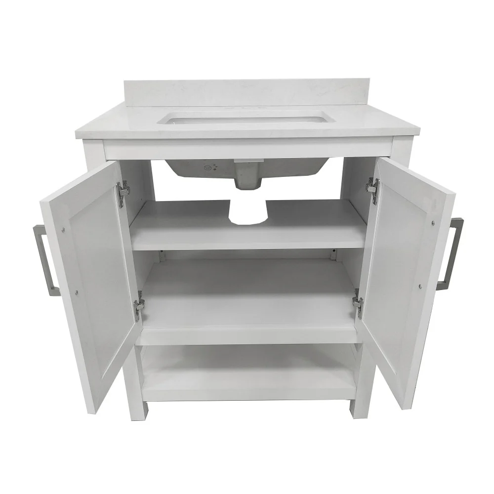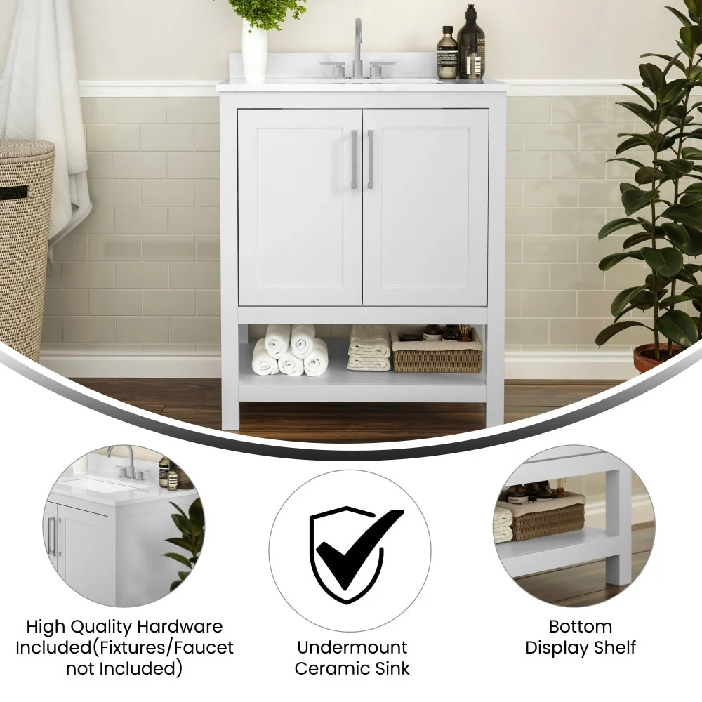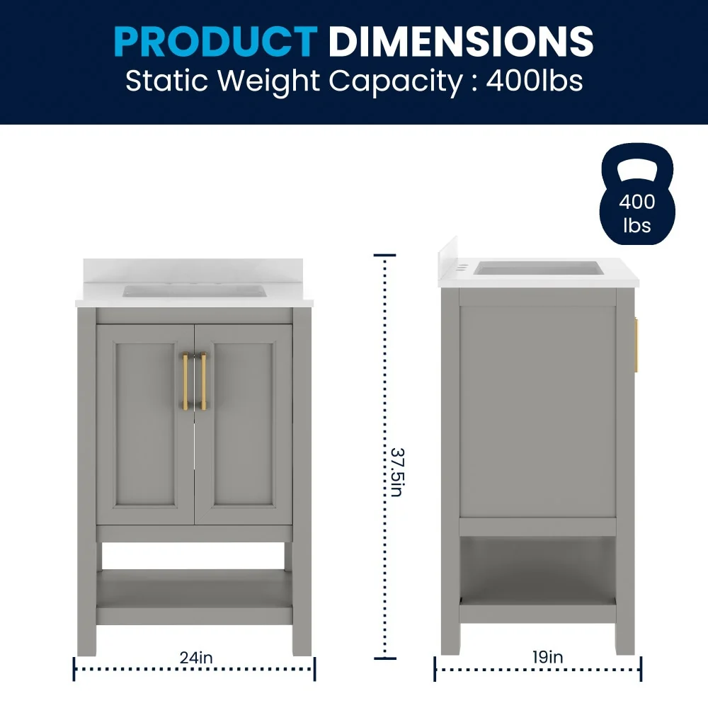 Next to the kitchen, a bathroom upgrade can be the most expensive remodel you will do so if you need a new look, but a total overhaul is not in the budget, this bathroom vanity with sink is the perfect high impact solution. Featuring a stunning Carrara marble finished counter top with an on-trend ceramic undermount sink atop a wooden storage cabinet, available in multiple finishes and boasting gorgeous metal handles, this vanity and sink combo will instantly refresh your powder room. The included backsplash may be installed or if you like the minimalist look, you can choose to leave it off. Beautiful style is just the tip of the iceberg for this upmarket vanity set. Soft close doors open to reveal ample interior storage with an adjustable height shelf then close whisper quiet. A lower open storage shelf is perfect for linens or decor to showcase your personal style. The engineered wood cabinet will stand up to moisture and humidity, holds up to 400 lbs. static weight, and arrives with adjustable floor glides for a level surface. Best of all, your new vanity ships in one box with the cabinet and sink already assembled and pre-drilled faucet holes with 4'-8' spacing. The handles are preassembled inside the cabinet to keep them pristine so just remove them an reinstall them on the outside of the doors and you are ready to go. Wipe with a damp cloth to maintain that just out of the box appearance.