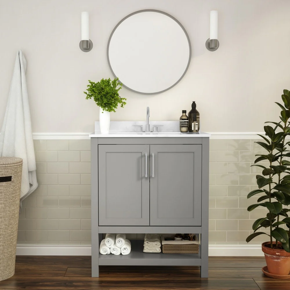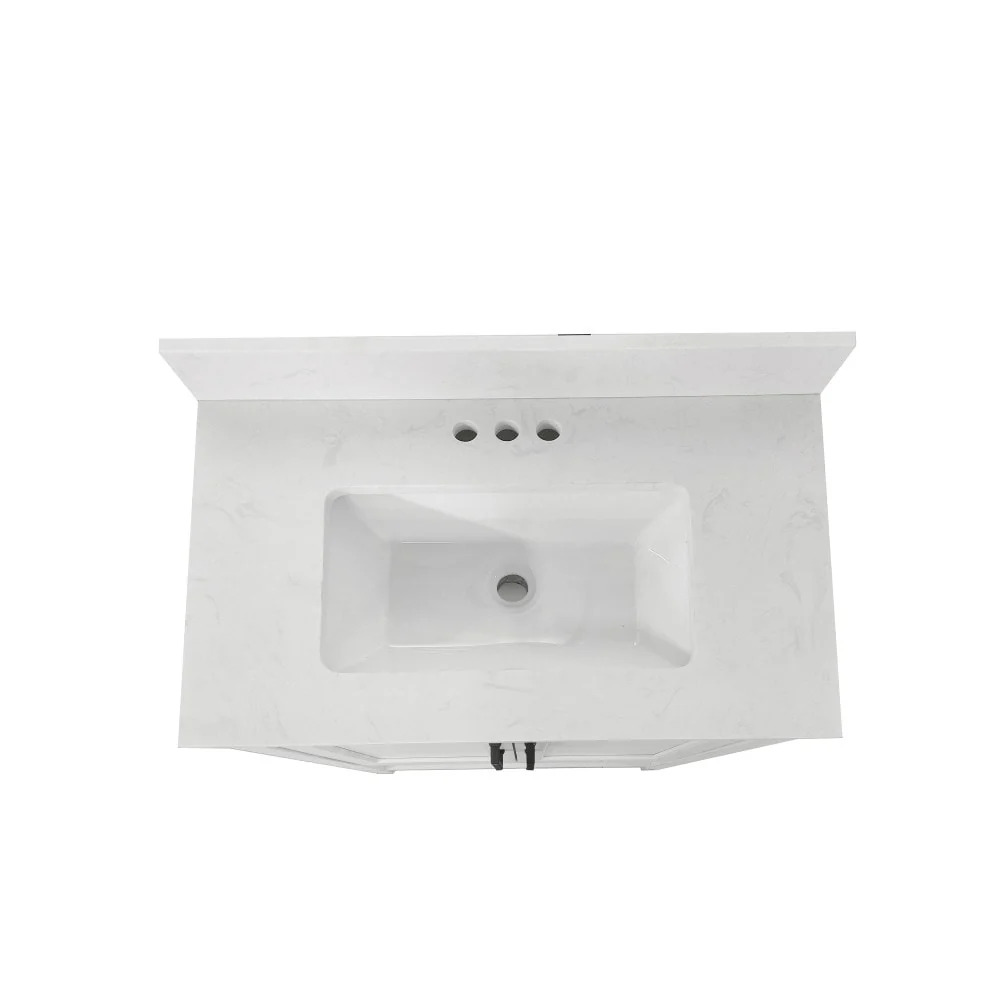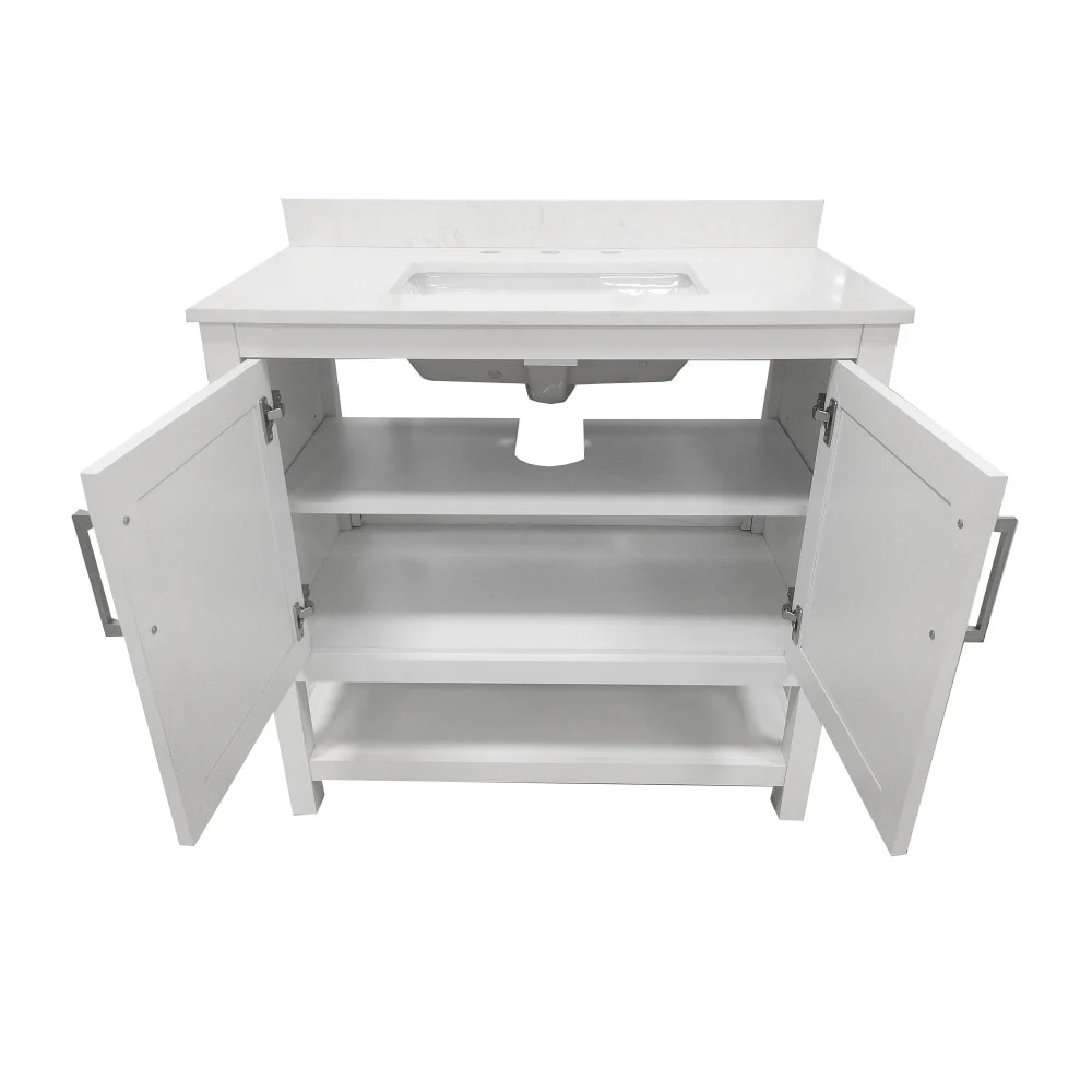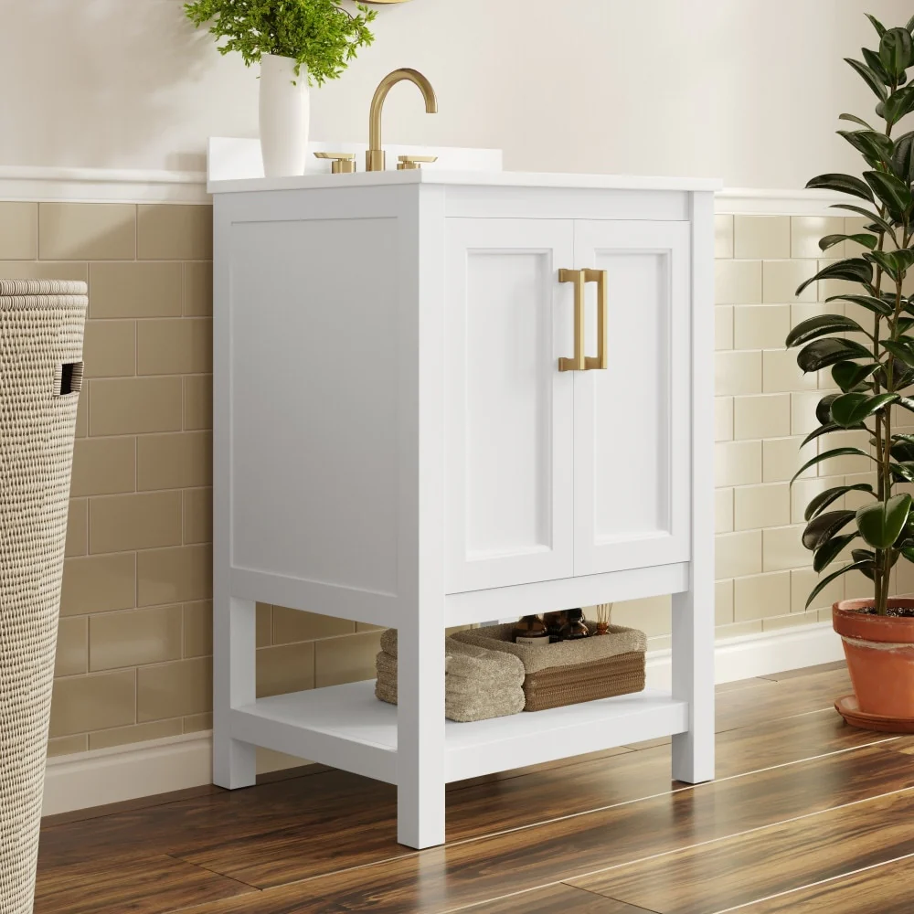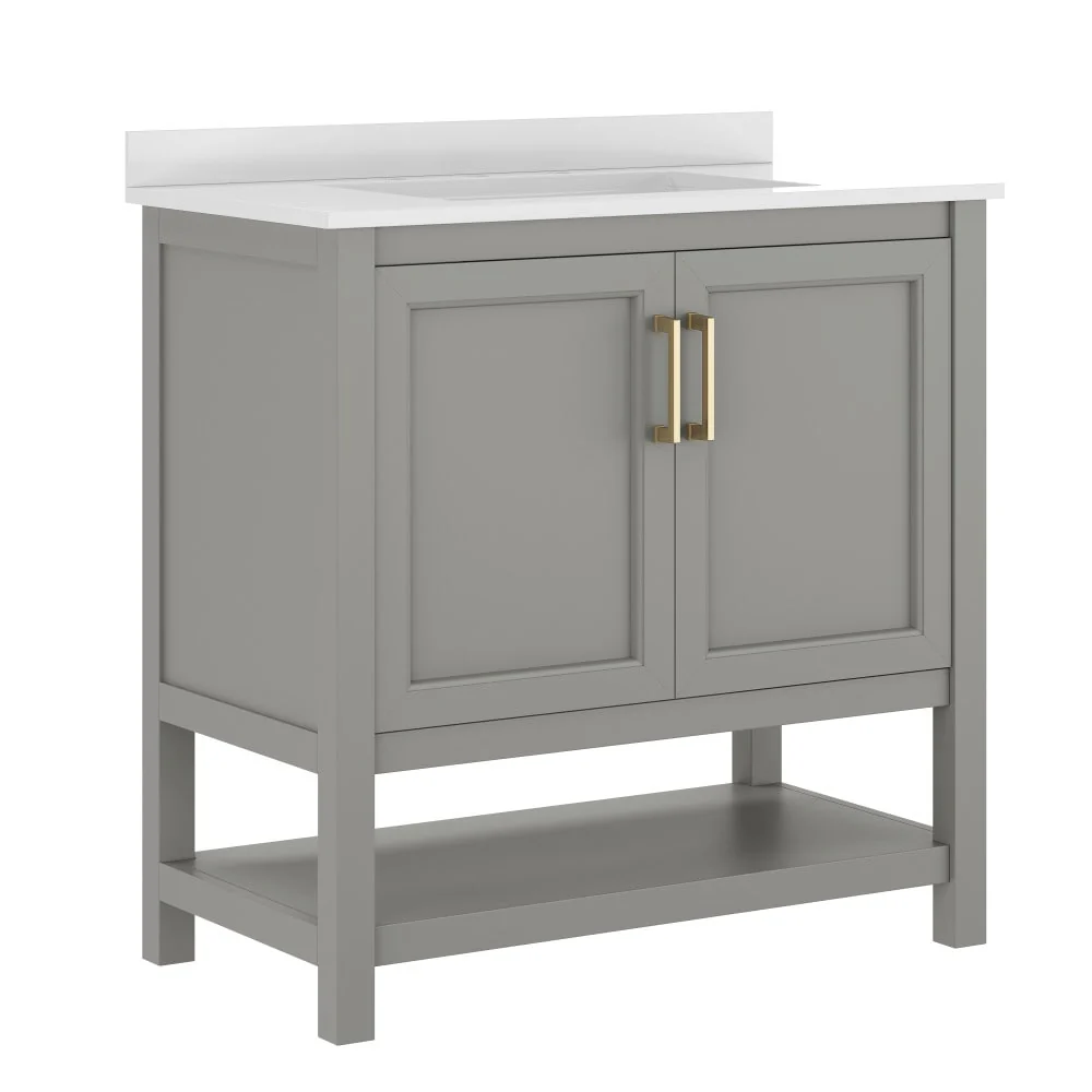Next to the kitchen, a bathroom upgrade can be the most expensive remodel you will do so if you need a new look, but a total overhaul is not in the budget, this bathroom vanity with sink is the perfect high impact solution. Featuring a stunning Carrara marble finished counter top with an on-trend ceramic undermount sink atop a wooden storage cabinet, available in multiple finishes and boasting gorgeous metal handles, this vanity and sink combo will instantly refresh your powder room. The included backsplash may be installed or if you like the minimalist look, you can choose to leave it off. Beautiful style is just the tip of the iceberg for this upmarket vanity set. Soft close doors open to reveal ample interior storage with an adjustable height shelf then close whisper quiet. A lower open storage shelf is perfect for linens or decor to showcase your personal style. The engineered wood cabinet will stand up to moisture and humidity, holds up to 400 lbs. static weight, and arrives with adjustable floor glides for a level surface. Best of all, your new vanity ships in one box with the cabinet and sink already assembled and pre-drilled faucet holes with 4'-8' spacing. The handles are preassembled inside the cabinet to keep them pristine so just remove them an reinstall them on the outside of the doors and you are ready to go. Wipe with a damp cloth to maintain that just out of the box appearance.
