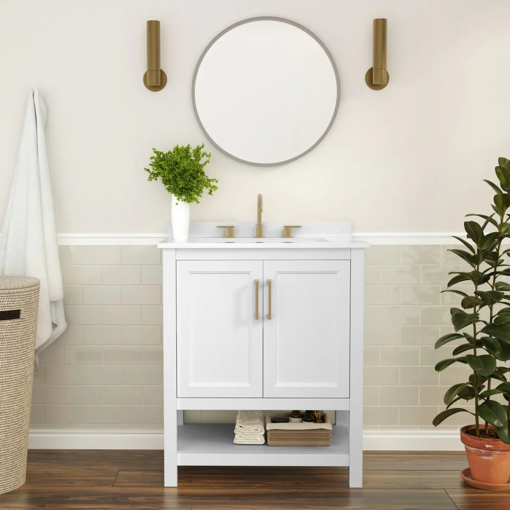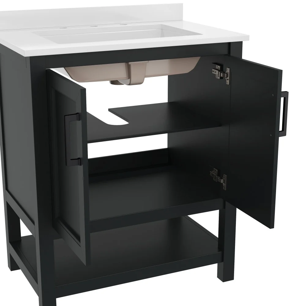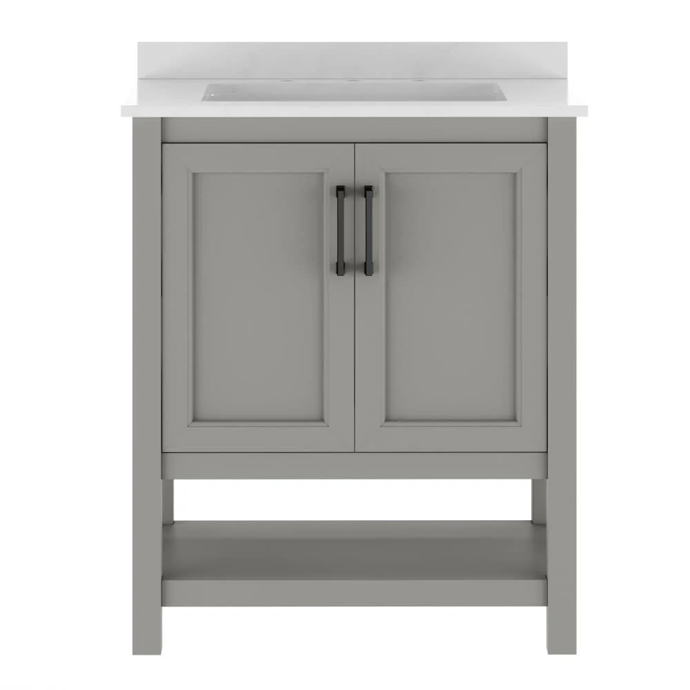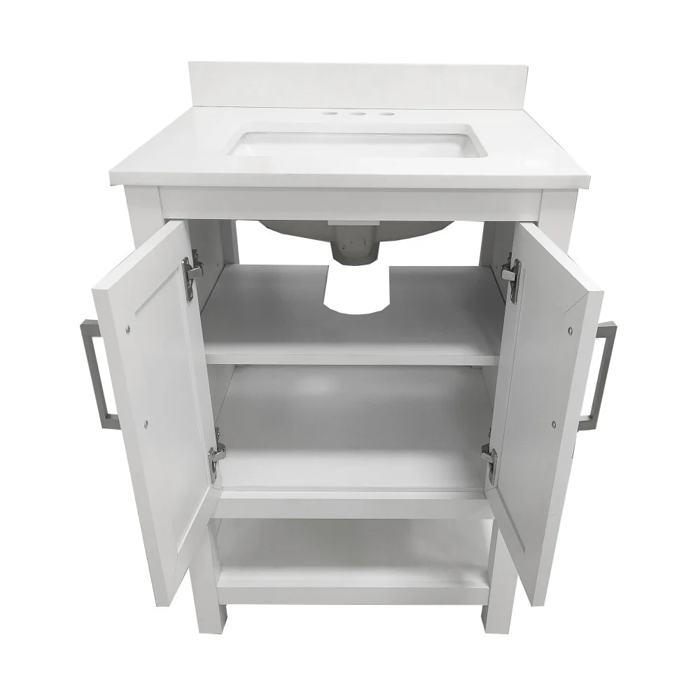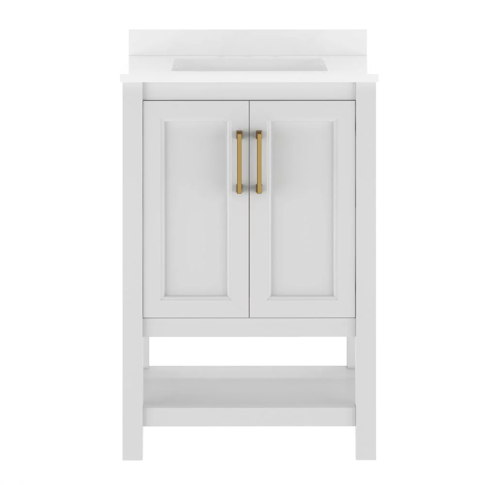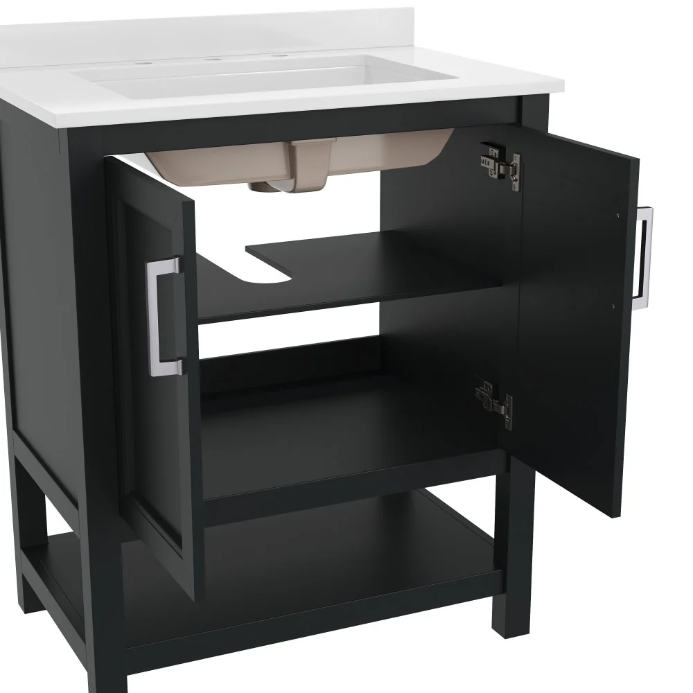 Next to the kitchen, a bathroom upgrade can be the most expensive remodel you will do so if you need a new look, but a total overhaul is not in the budget, this bathroom vanity with sink is the perfect high impact solution. Featuring a stunning Carrara marble finished counter top with an on-trend ceramic undermount sink atop a wooden storage cabinet, available in multiple finishes and boasting gorgeous metal handles, this vanity and sink combo will instantly refresh your powder room. The included backsplash may be installed or if you like the minimalist look, you can choose to leave it off. Beautiful style is just the tip of the iceberg for this upmarket vanity set. Soft close doors open to reveal ample interior storage with an adjustable height shelf then close whisper quiet. A lower open storage shelf is perfect for linens or decor to showcase your personal style. The engineered wood cabinet will stand up to moisture and humidity, holds up to 400 lbs. static weight, and arrives with adjustable floor glides for a level surface. Best of all, your new vanity ships in one box with the cabinet and sink already assembled and pre-drilled faucet holes with 4'-8' spacing. The handles are preassembled inside the cabinet to keep them pristine so just remove them an reinstall them on the outside of the doors and you are ready to go. Wipe with a damp cloth to maintain that just out of the box appearance.
