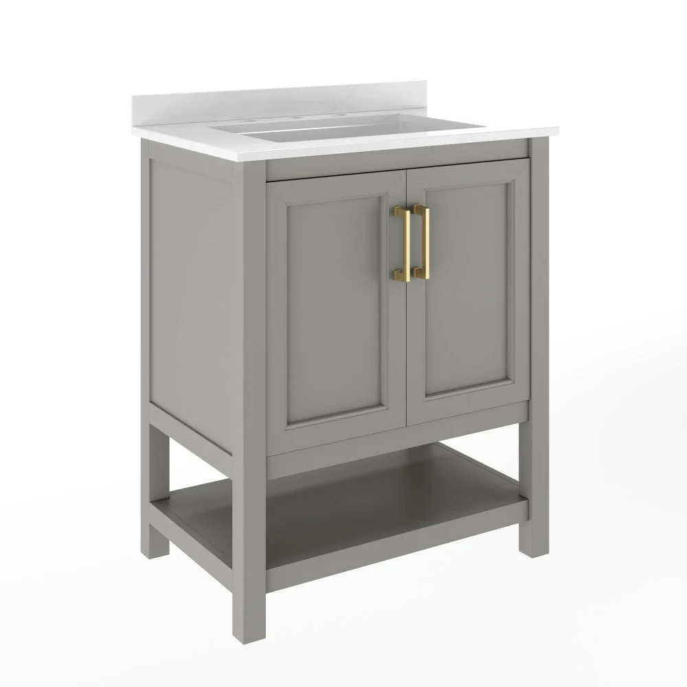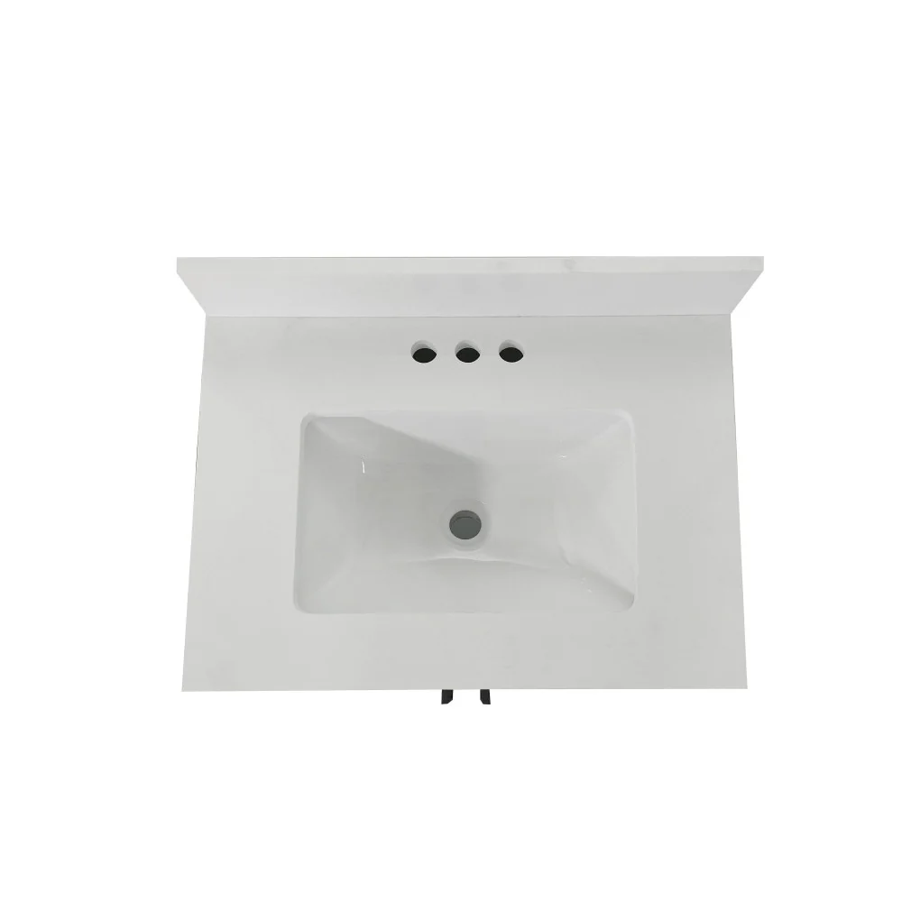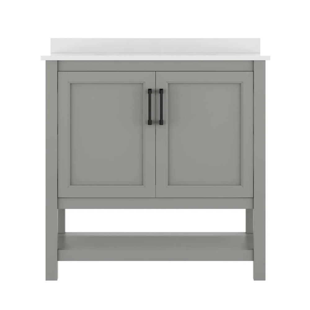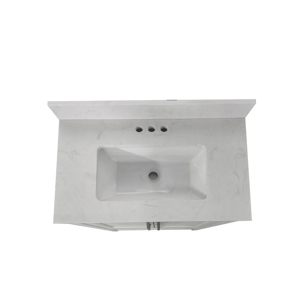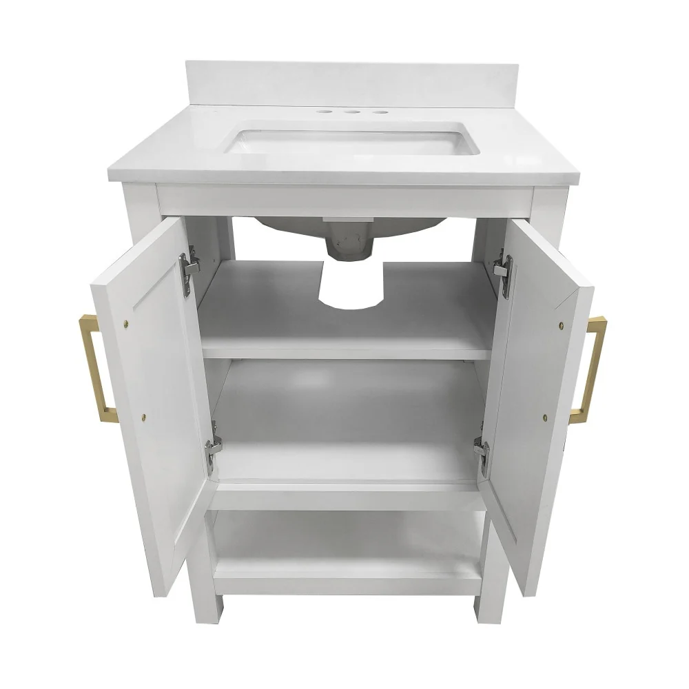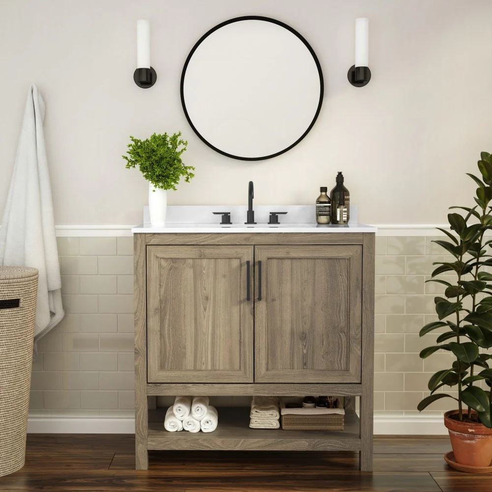 Next to the kitchen, a bathroom upgrade can be the most expensive remodel you will do so if you need a new look, but a total overhaul is not in the budget, this bathroom vanity with sink is the perfect high impact solution. Featuring a stunning Carrara marble finished counter top with an on-trend ceramic undermount sink atop a wooden storage cabinet, available in multiple finishes and boasting gorgeous metal handles, this vanity and sink combo will instantly refresh your powder room. The included backsplash may be installed or if you like the minimalist look, you can choose to leave it off. Beautiful style is just the tip of the iceberg for this upmarket vanity set. Soft close doors open to reveal ample interior storage with an adjustable height shelf then close whisper quiet. A lower open storage shelf is perfect for linens or decor to showcase your personal style. The engineered wood cabinet will stand up to moisture and humidity, holds up to 400 lbs. static weight, and arrives with adjustable floor glides for a level surface. Best of all, your new vanity ships in one box with the cabinet and sink already assembled and pre-drilled faucet holes with 4'-8' spacing. The handles are preassembled inside the cabinet to keep them pristine so just remove them an reinstall them on the outside of the doors and you are ready to go. Wipe with a damp cloth to maintain that just out of the box appearance.