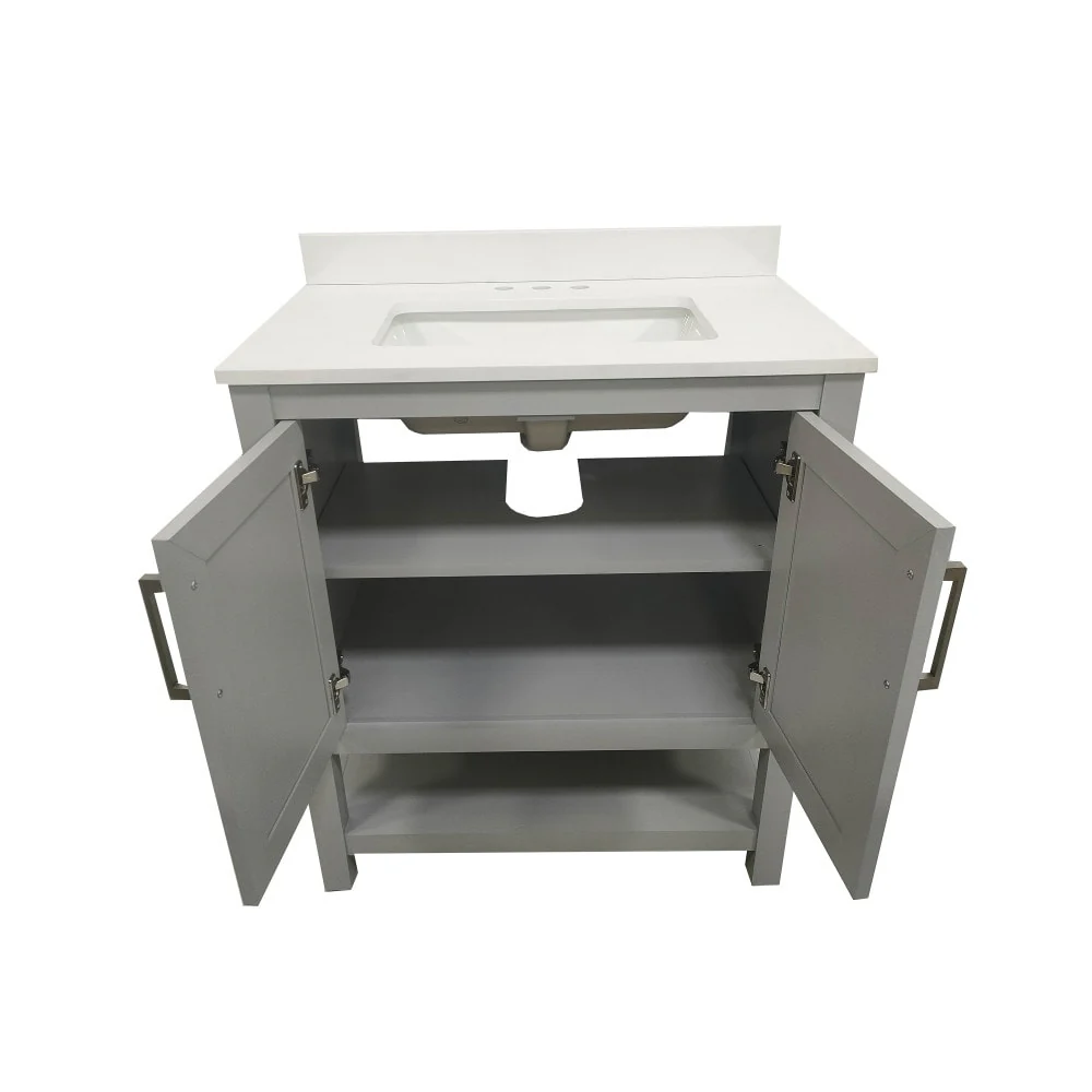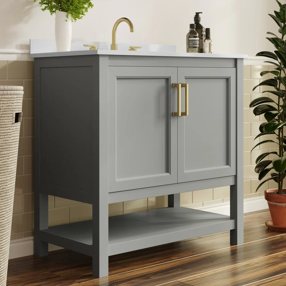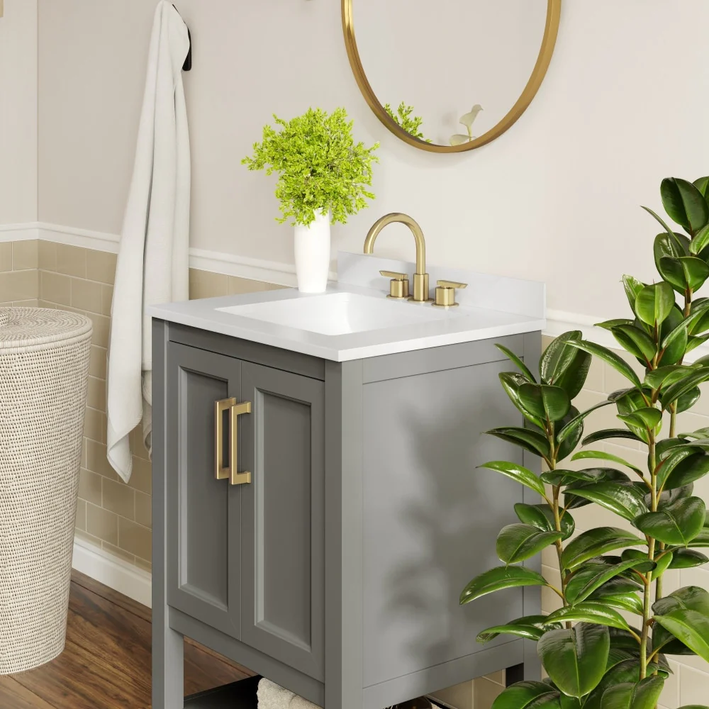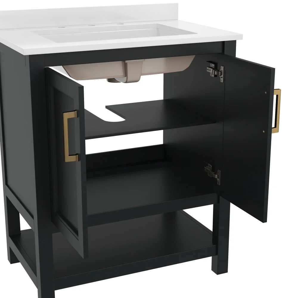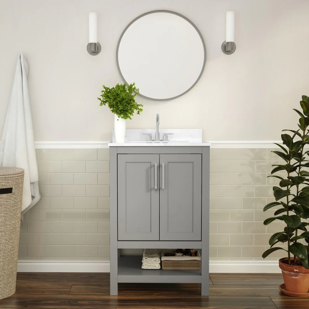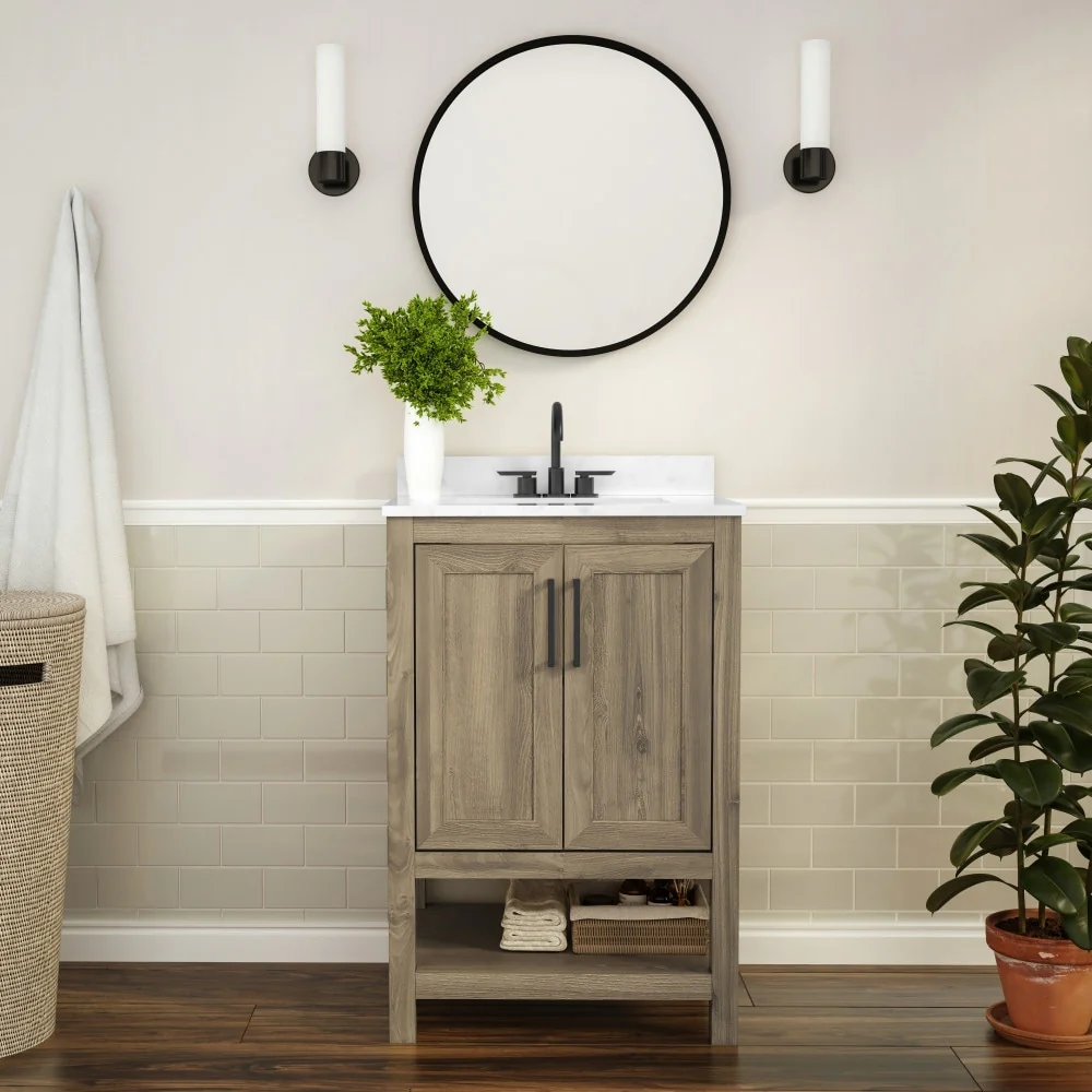Next to the kitchen, a bathroom upgrade can be the most expensive remodel you will do so if you need a new look, but a total overhaul is not in the budget, this bathroom vanity with sink is the perfect high impact solution. Featuring a stunning Carrara marble finished counter top with an on-trend ceramic undermount sink atop a wooden storage cabinet, available in multiple finishes and boasting gorgeous metal handles, this vanity and sink combo will instantly refresh your powder room. The included backsplash may be installed or if you like the minimalist look, you can choose to leave it off. Beautiful style is just the tip of the iceberg for this upmarket vanity set. Soft close doors open to reveal ample interior storage with an adjustable height shelf then close whisper quiet. A lower open storage shelf is perfect for linens or decor to showcase your personal style. The engineered wood cabinet will stand up to moisture and humidity, holds up to 400 lbs. static weight, and arrives with adjustable floor glides for a level surface. Best of all, your new vanity ships in one box with the cabinet and sink already assembled and pre-drilled faucet holes with 4'-8' spacing. The handles are preassembled inside the cabinet to keep them pristine so just remove them an reinstall them on the outside of the doors and you are ready to go. Wipe with a damp cloth to maintain that just out of the box appearance.