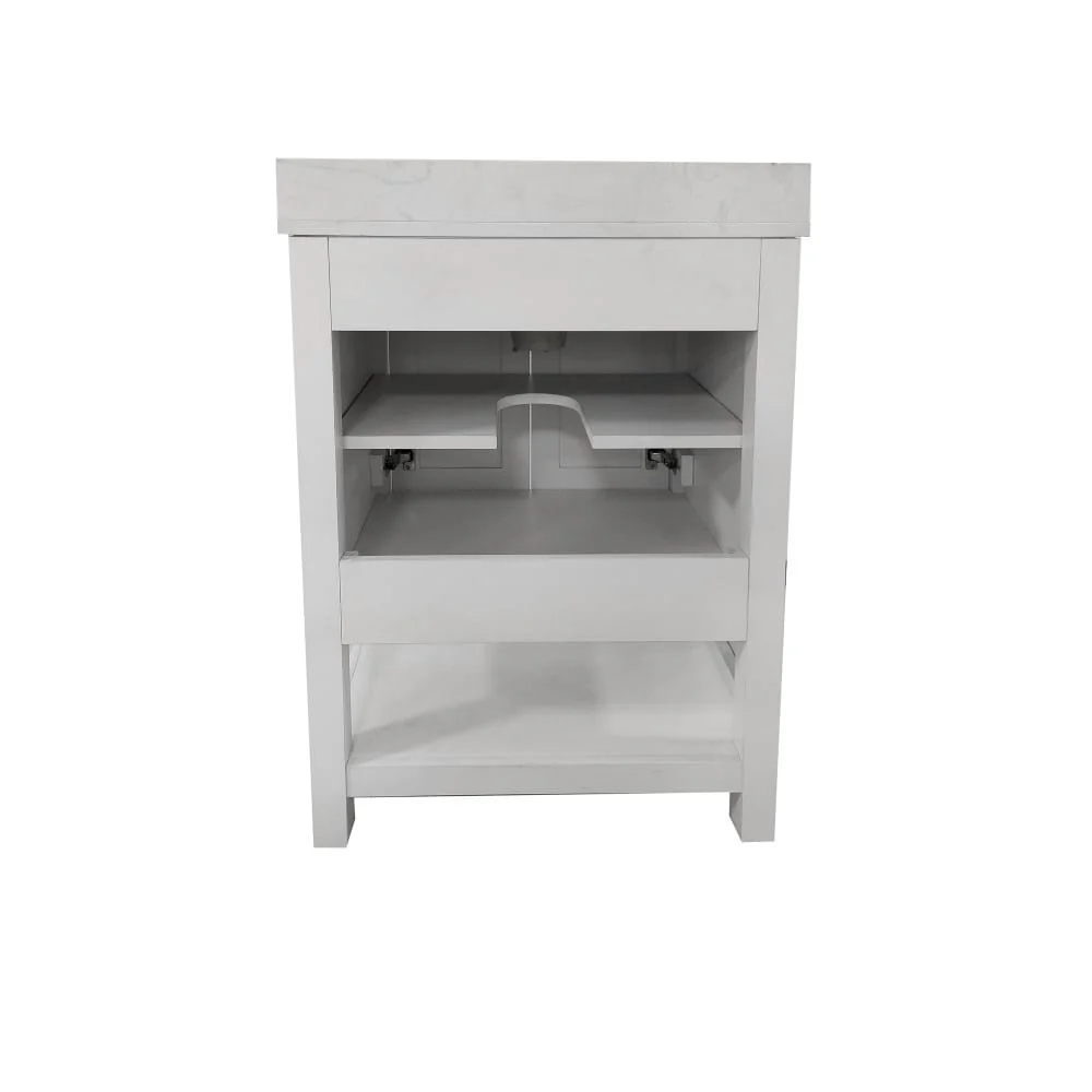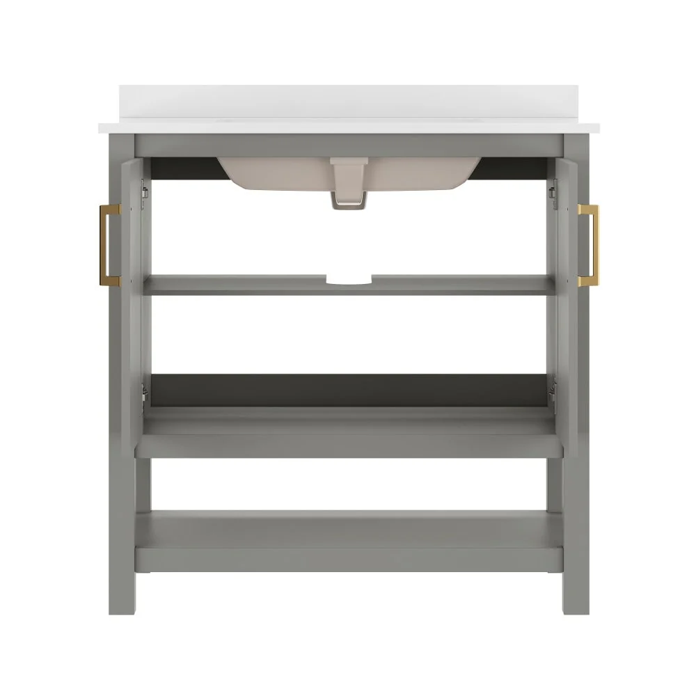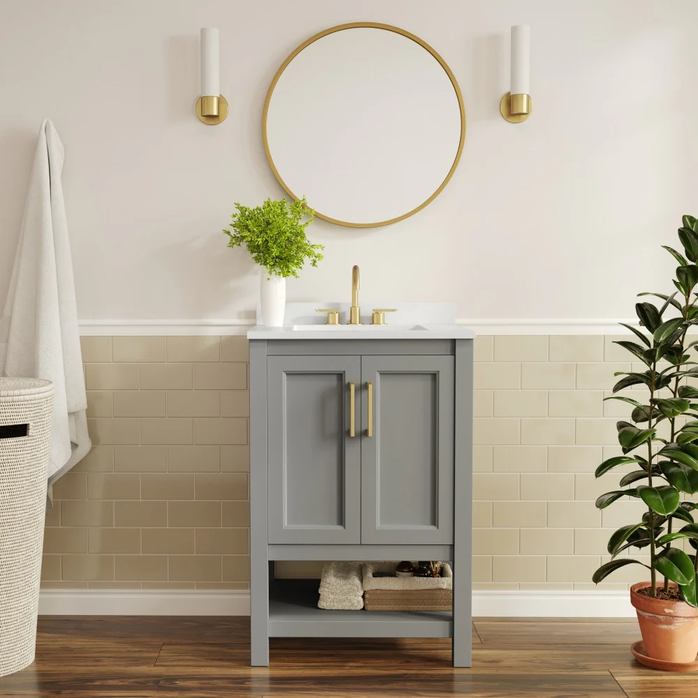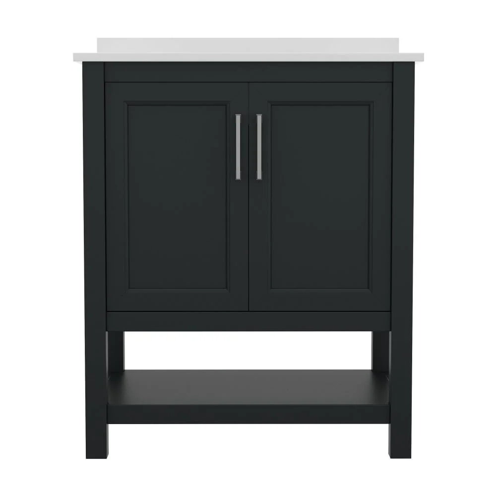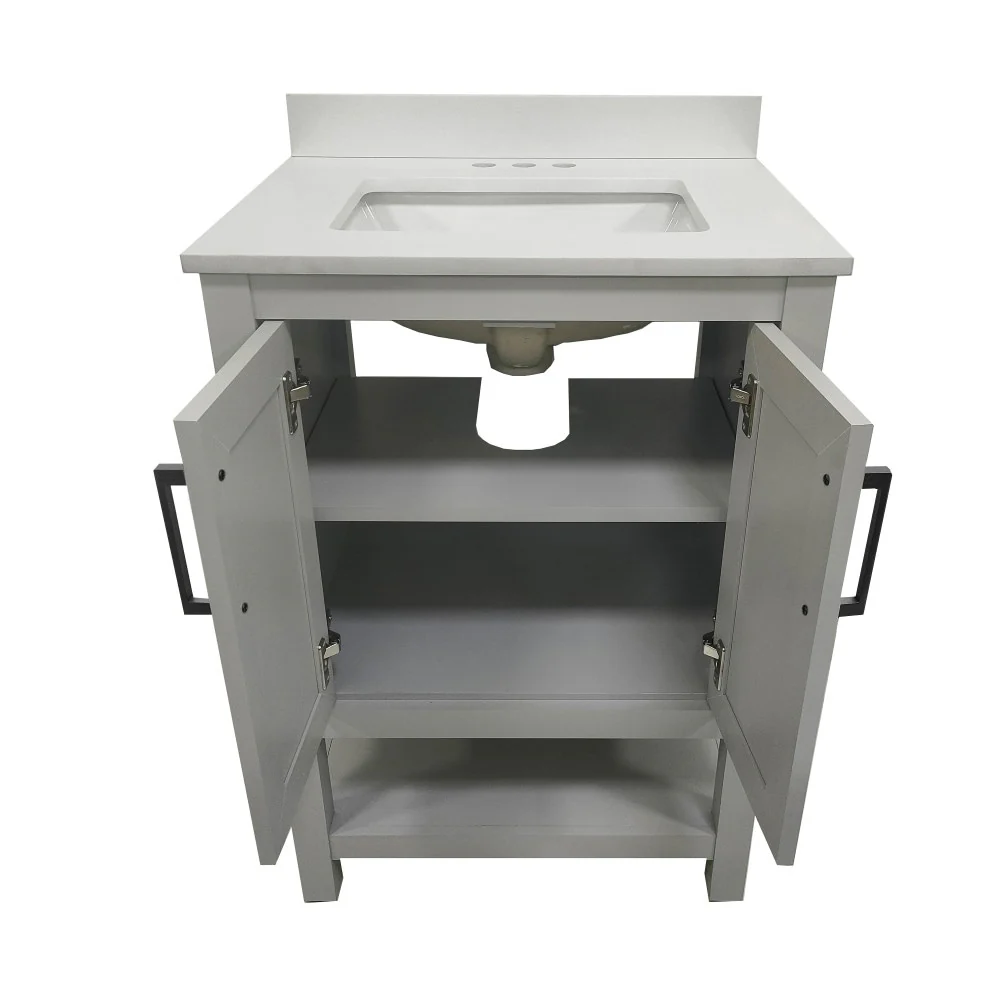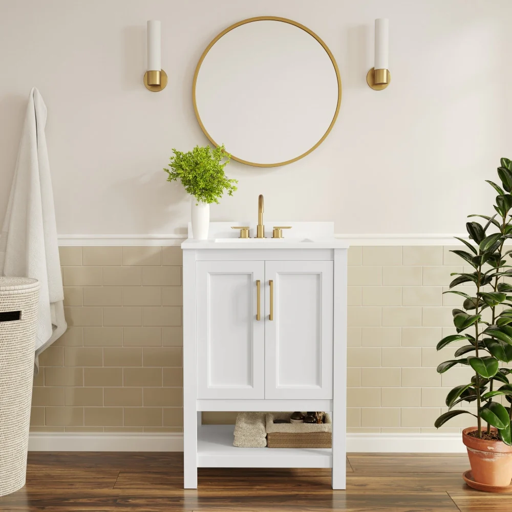 Next to the kitchen, a bathroom upgrade can be the most expensive remodel you will do so if you need a new look, but a total overhaul is not in the budget, this bathroom vanity with sink is the perfect high impact solution. Featuring a stunning Carrara marble finished counter top with an on-trend ceramic undermount sink atop a wooden storage cabinet, available in multiple finishes and boasting gorgeous metal handles, this vanity and sink combo will instantly refresh your powder room. The included backsplash may be installed or if you like the minimalist look, you can choose to leave it off. Beautiful style is just the tip of the iceberg for this upmarket vanity set. Soft close doors open to reveal ample interior storage with an adjustable height shelf then close whisper quiet. A lower open storage shelf is perfect for linens or decor to showcase your personal style. The engineered wood cabinet will stand up to moisture and humidity, holds up to 400 lbs. static weight, and arrives with adjustable floor glides for a level surface. Best of all, your new vanity ships in one box with the cabinet and sink already assembled and pre-drilled faucet holes with 4'-8' spacing. The handles are preassembled inside the cabinet to keep them pristine so just remove them an reinstall them on the outside of the doors and you are ready to go. Wipe with a damp cloth to maintain that just out of the box appearance.