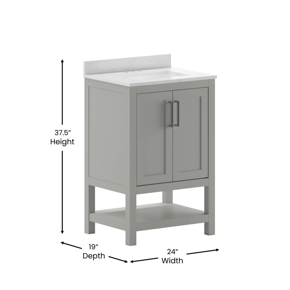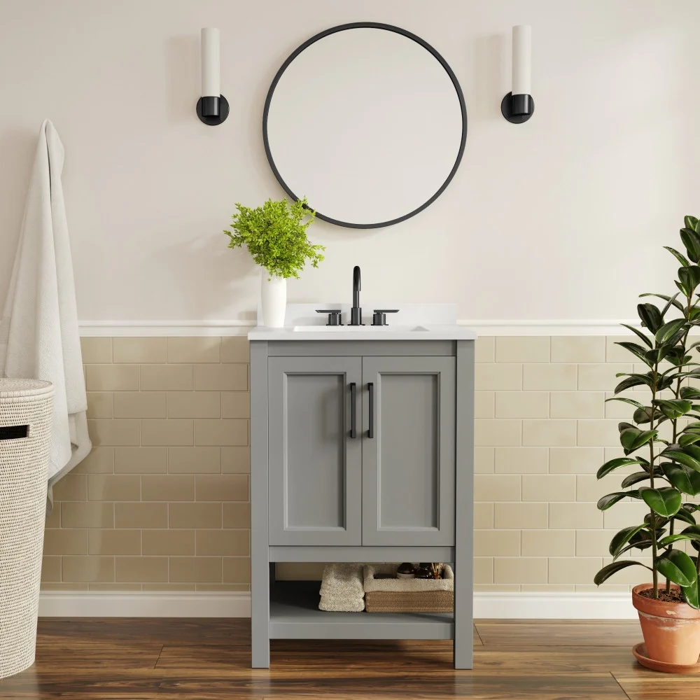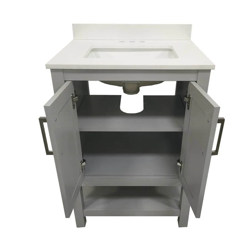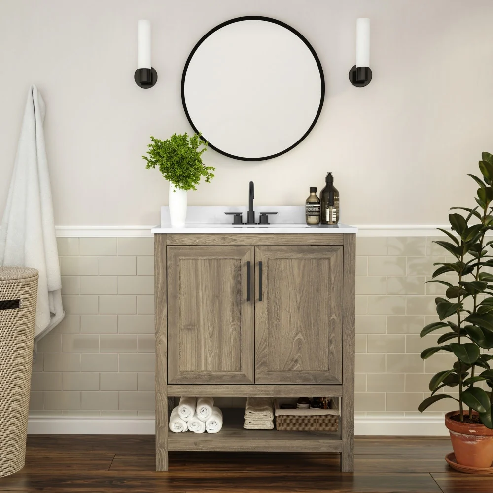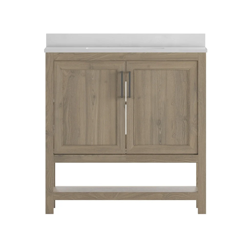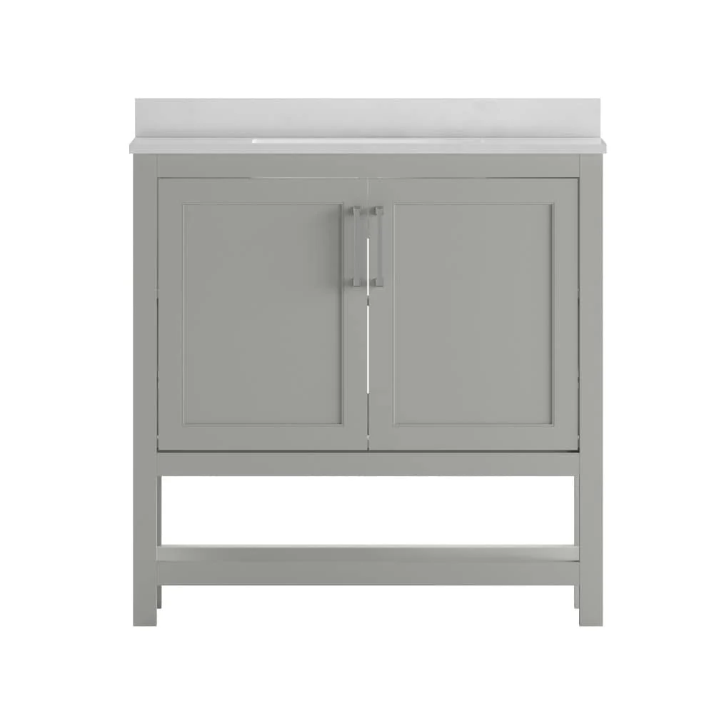 Next to the kitchen, a bathroom upgrade can be the most expensive remodel you will do so if you need a new look, but a total overhaul is not in the budget, this bathroom vanity with sink is the perfect high impact solution. Featuring a stunning Carrara marble finished counter top with an on-trend ceramic undermount sink atop a wooden storage cabinet, available in multiple finishes and boasting gorgeous metal handles, this vanity and sink combo will instantly refresh your powder room. The included backsplash may be installed or if you like the minimalist look, you can choose to leave it off. Beautiful style is just the tip of the iceberg for this upmarket vanity set. Soft close doors open to reveal ample interior storage with an adjustable height shelf then close whisper quiet. A lower open storage shelf is perfect for linens or decor to showcase your personal style. The engineered wood cabinet will stand up to moisture and humidity, holds up to 400 lbs. static weight, and arrives with adjustable floor glides for a level surface. Best of all, your new vanity ships in one box with the cabinet and sink already assembled and pre-drilled faucet holes with 4'-8' spacing. The handles are preassembled inside the cabinet to keep them pristine so just remove them an reinstall them on the outside of the doors and you are ready to go. Wipe with a damp cloth to maintain that just out of the box appearance.
