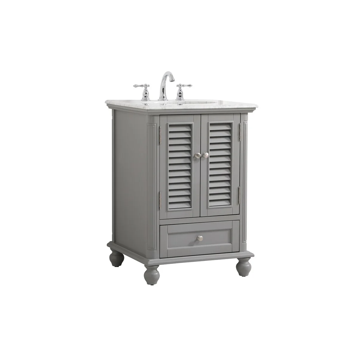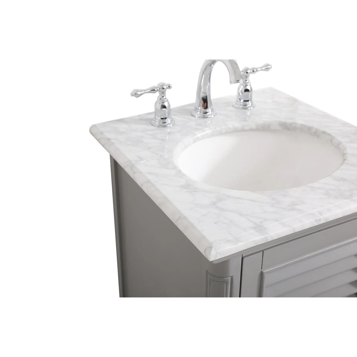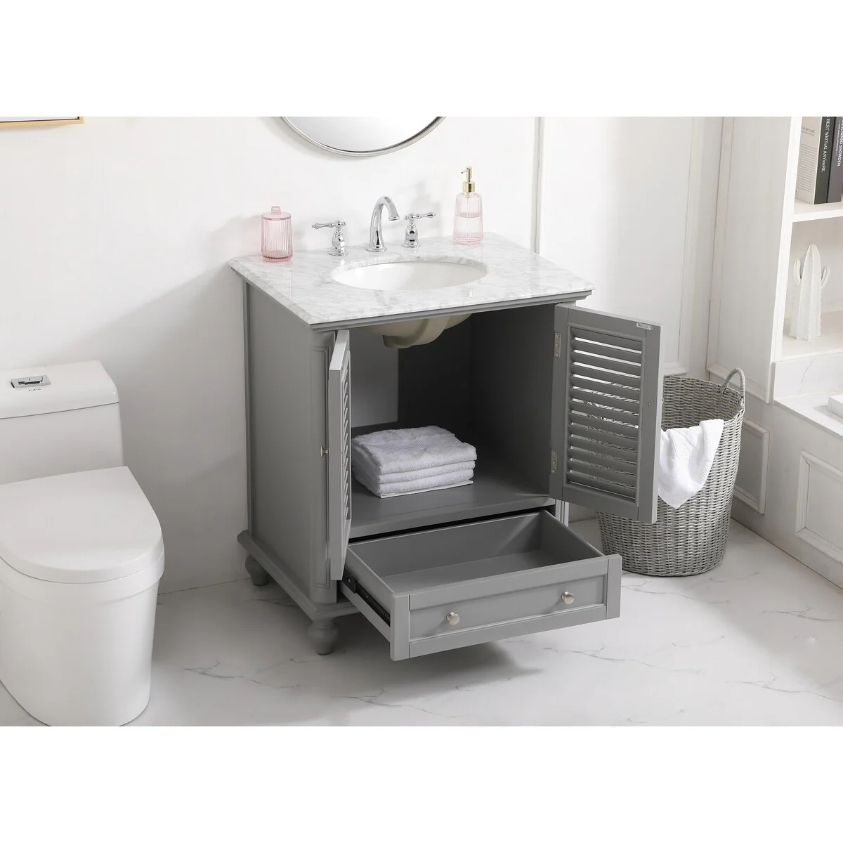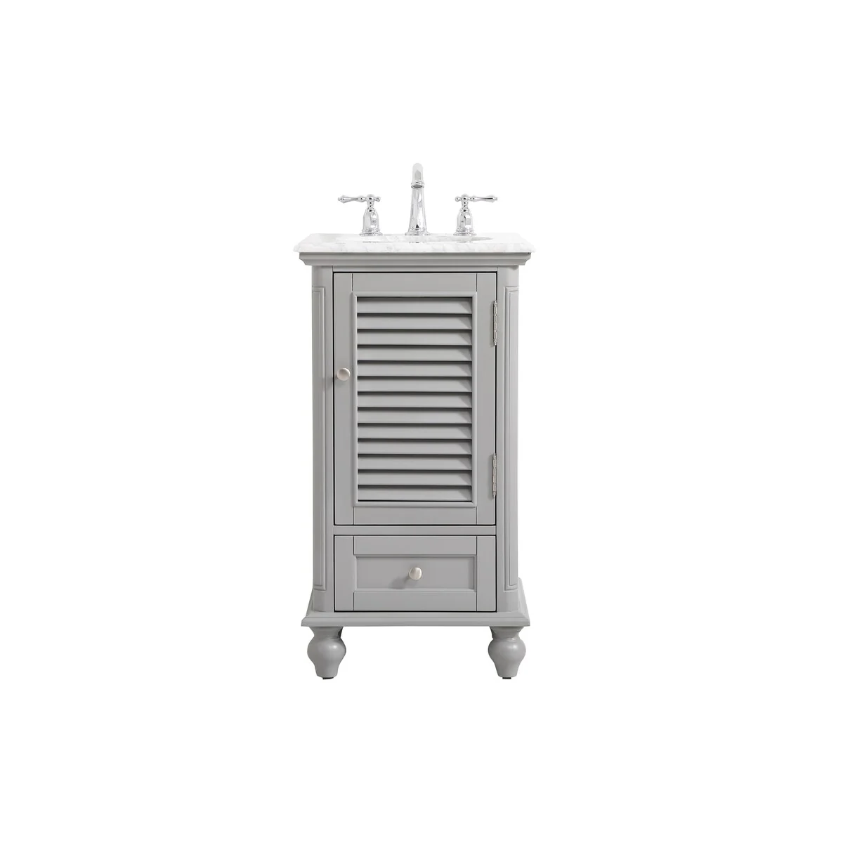 A small space doesn't mean you have to settle for less. This compact vanity will add lovely sophistication and complement any small bathroom or powder room, while utilizing its charm and function to provide you with ample storage spaces. Brushed nickel knobs gently adorn the shuttered cabinet door and drawer at the base, allowing for you to store away your bathroom essentials. The Carrara white marble countertop, porcelain undermount sink, dignified subtle engravings on the side edges, and rounded legs all come together to create contemporary beauty. Work with your space, and design a beautiful room, no matter the size.