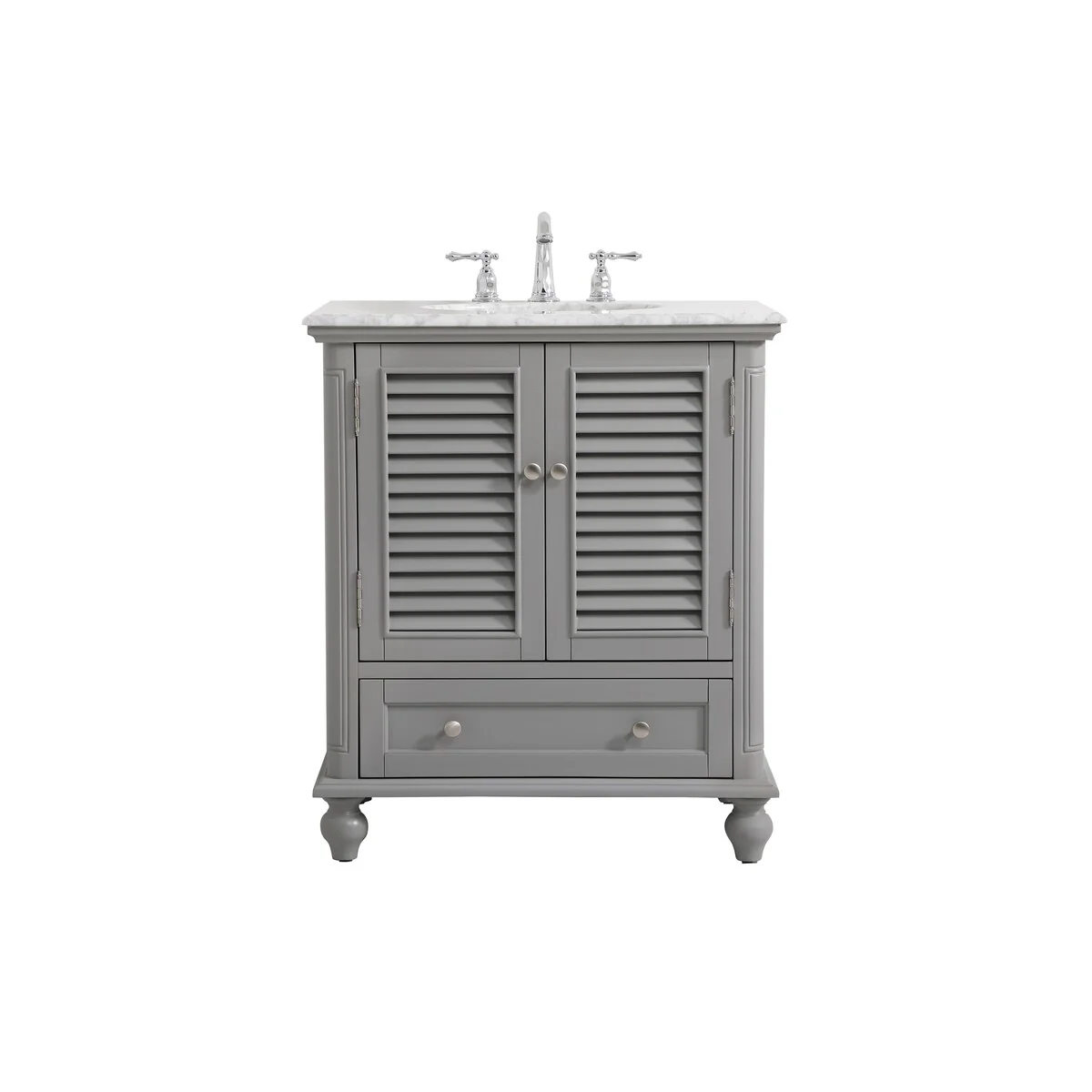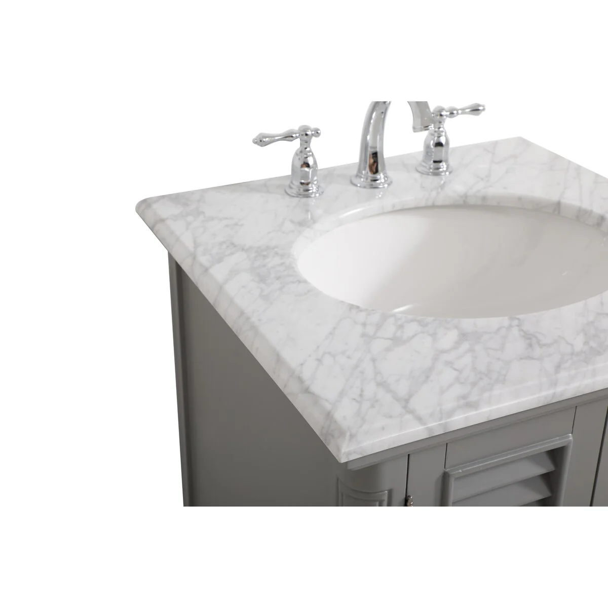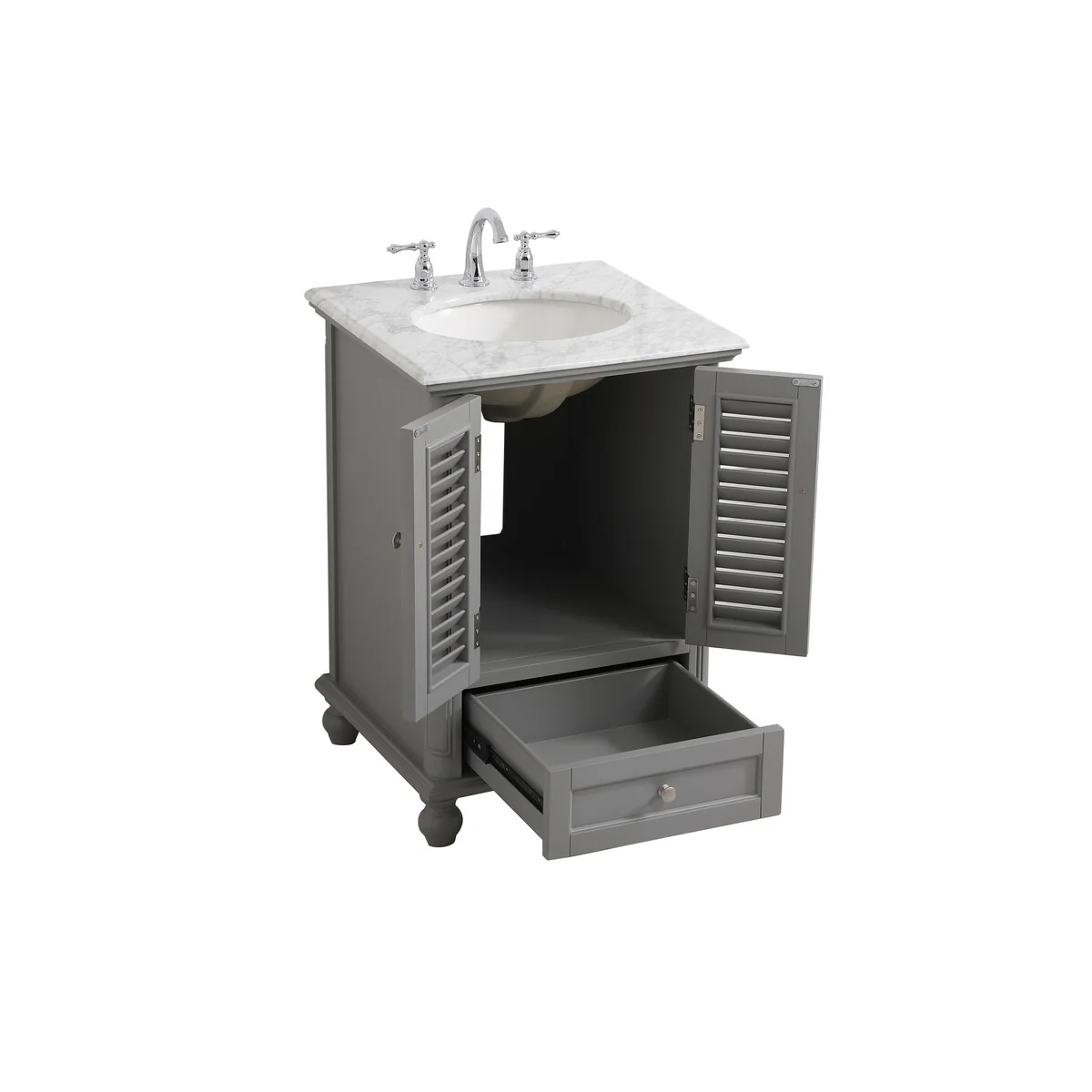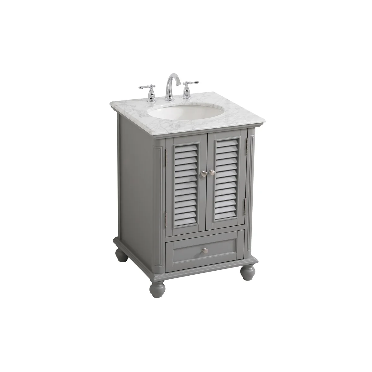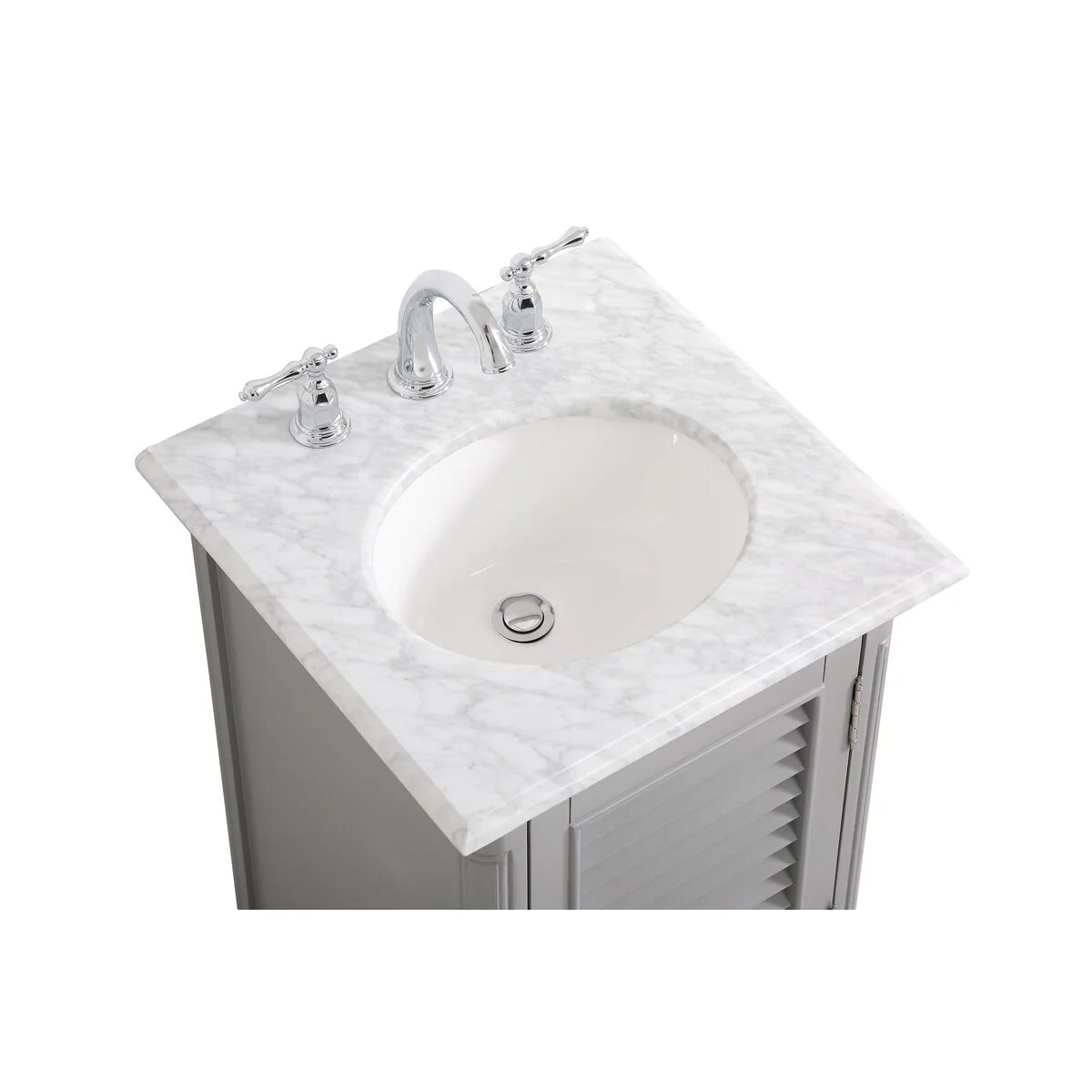 A small space doesn't mean you have to settle for less. This compact vanity will add lovely sophistication and complement any small bathroom or powder room, while utilizing its charm and function to provide you with ample storage spaces. Brushed nickel knobs gently adorn the shuttered cabinet door and drawer at the base, allowing for you to store away your bathroom essentials. The Carrara white marble countertop, porcelain undermount sink, dignified subtle engravings on the side edges, and rounded legs all come together to create contemporary beauty. Work with your space, and design a beautiful room, no matter the size.