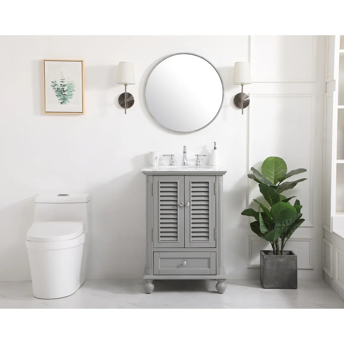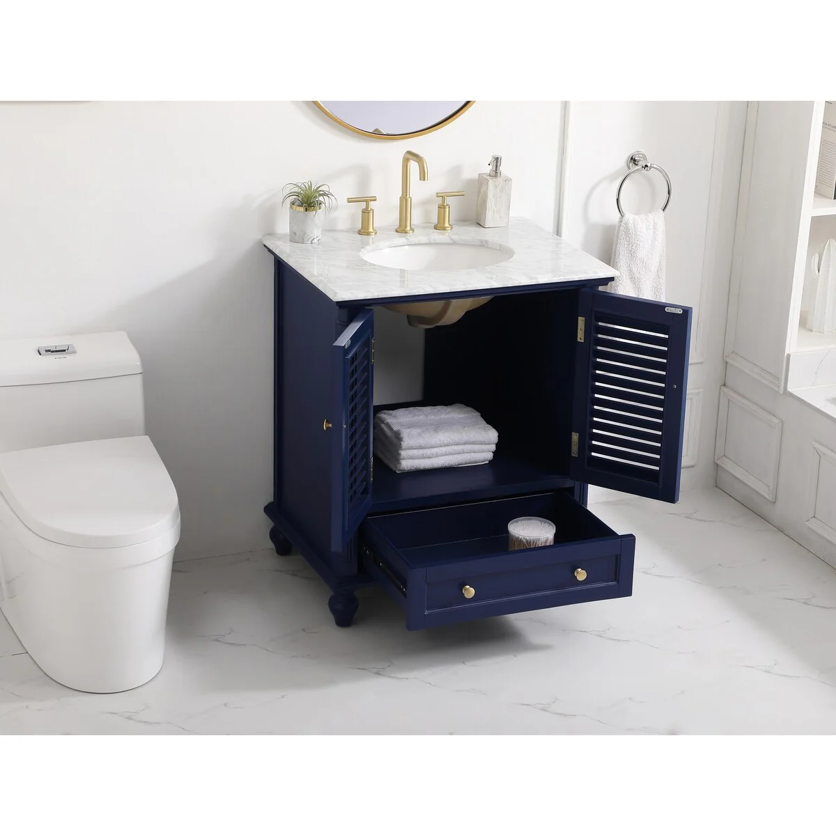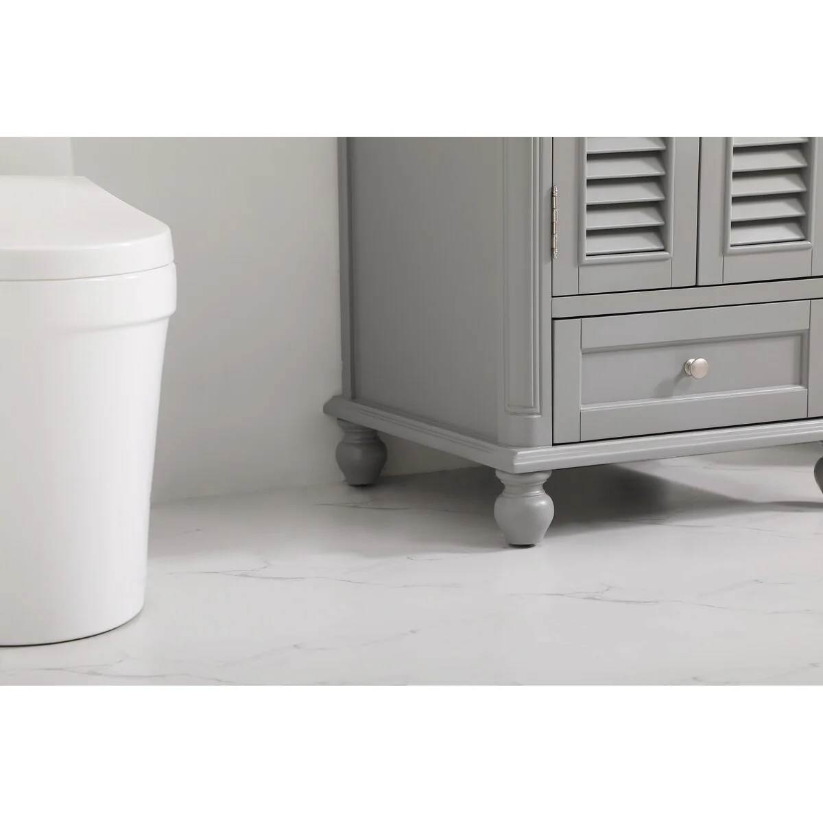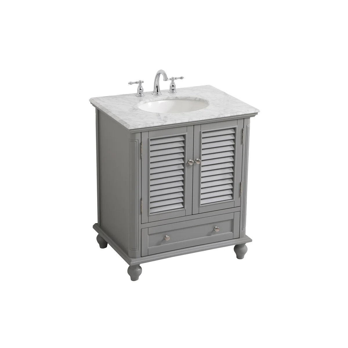 A small space doesn't mean you have to settle for less. This compact vanity will add lovely sophistication and complement any small bathroom or powder room, while utilizing its charm and function to provide you with ample storage spaces. Brushed nickel knobs gently adorn the shuttered cabinet door and drawer at the base, allowing for you to store away your bathroom essentials. The Carrara white marble countertop, porcelain undermount sink, dignified subtle engravings on the side edges, and rounded legs all come together to create contemporary beauty. Work with your space, and design a beautiful room, no matter the size.