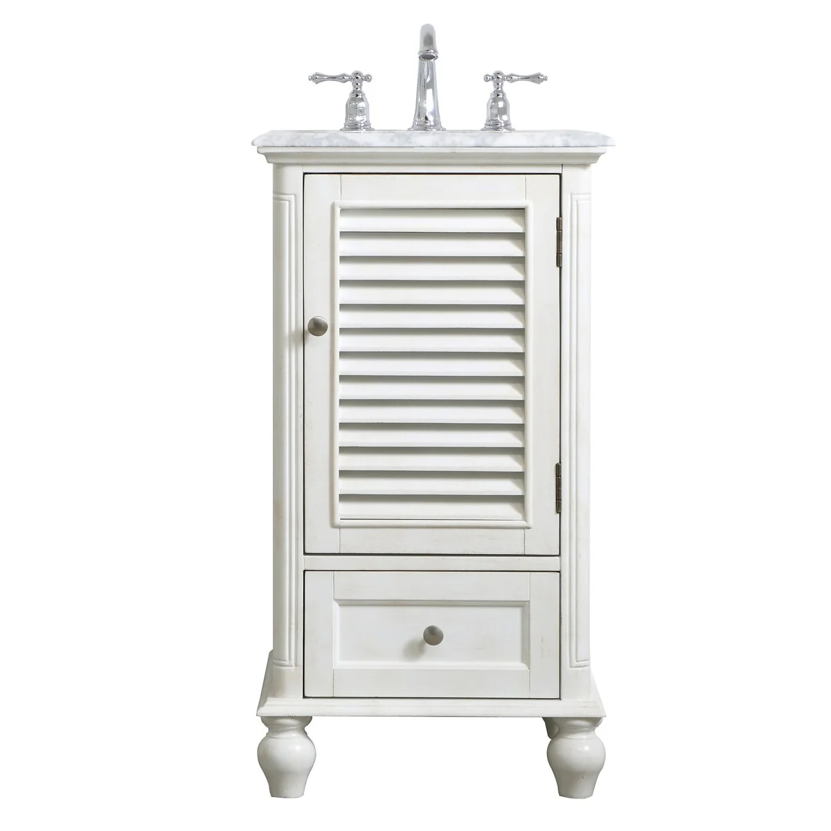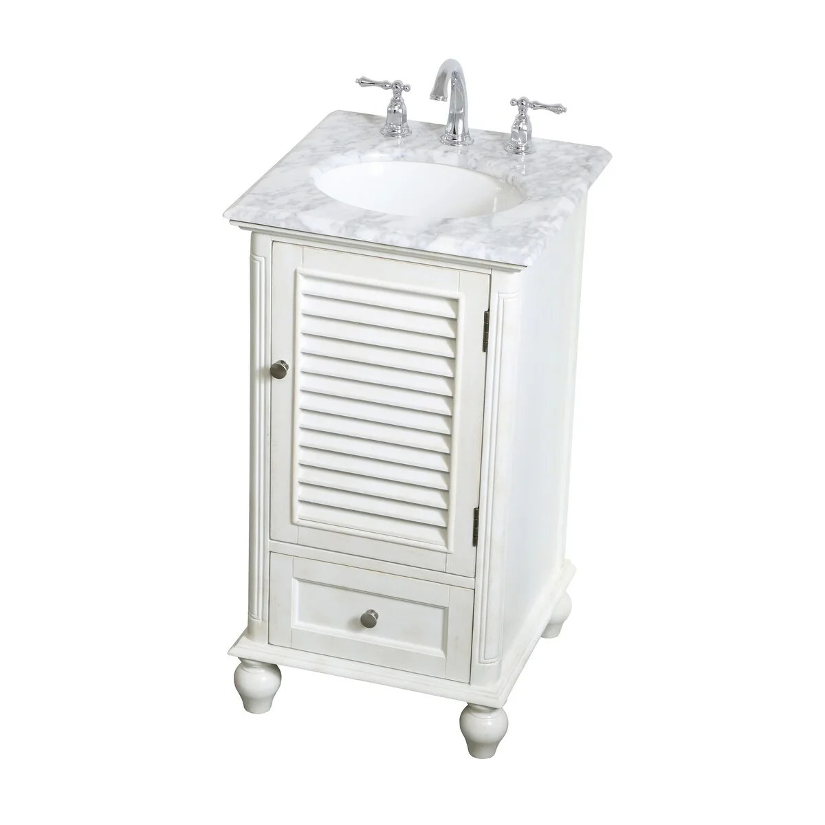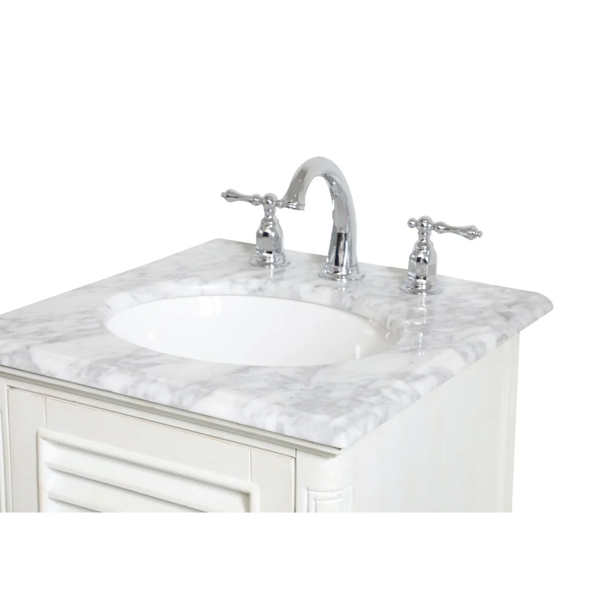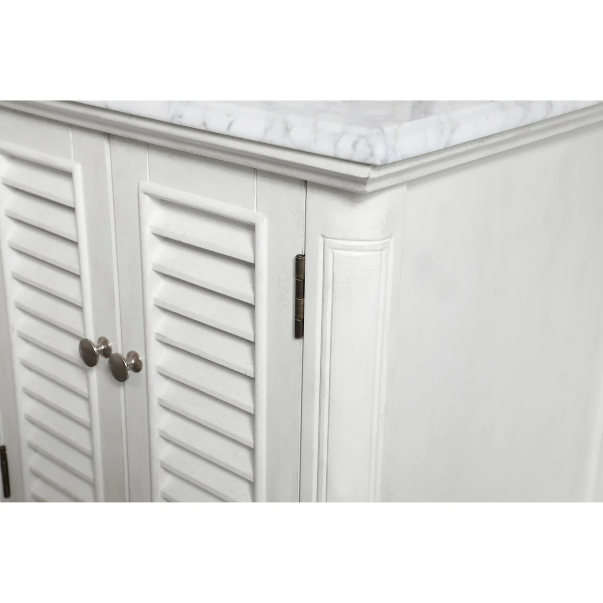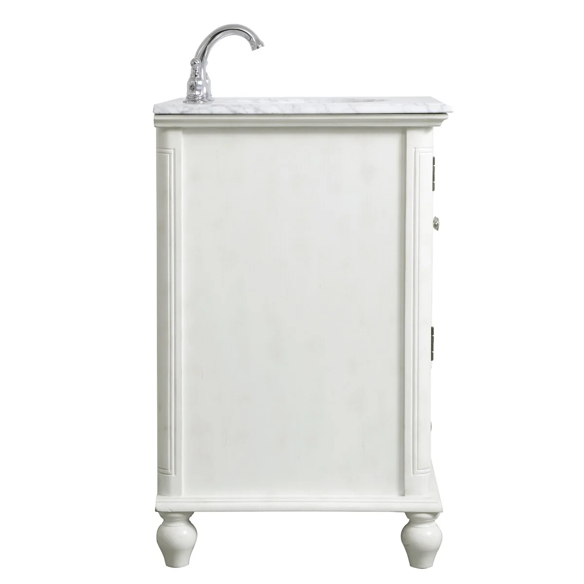 - Distressed antique finish with a luxurious Carrara White marble countertop