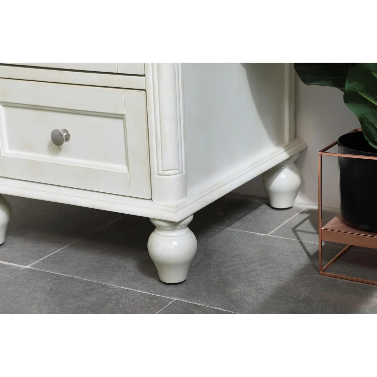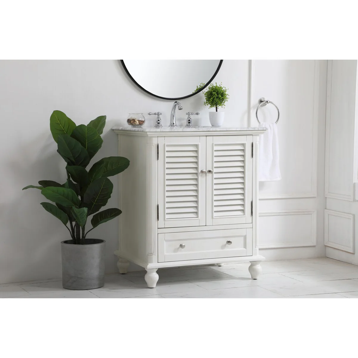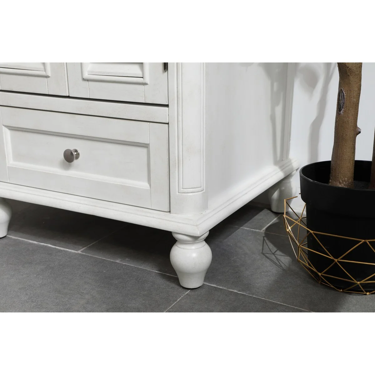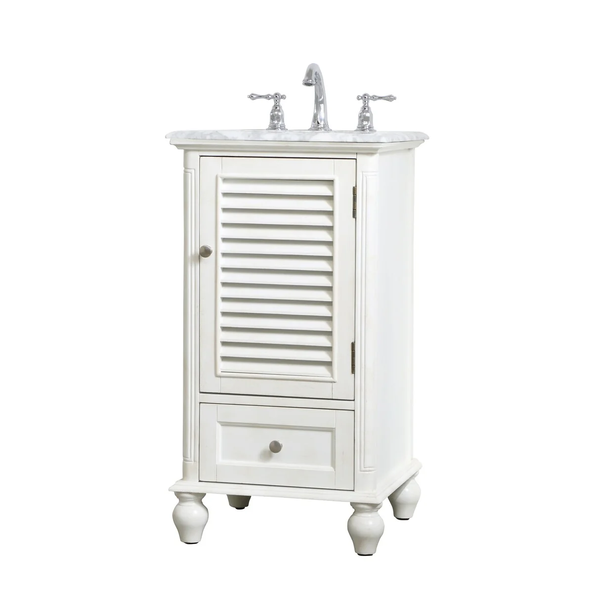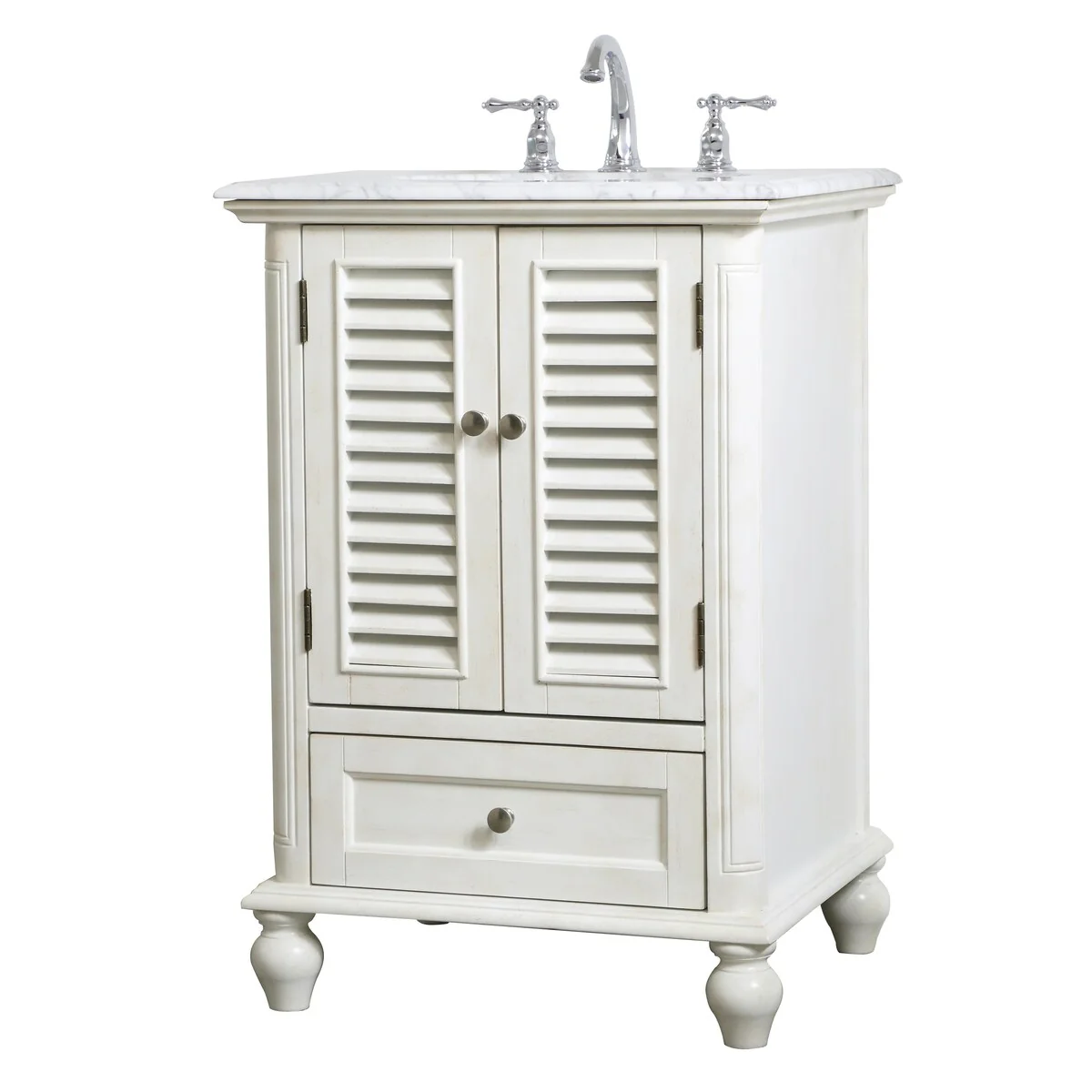 - Distressed antique finish with a luxurious Carrara White marble countertop
