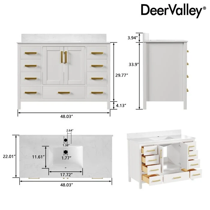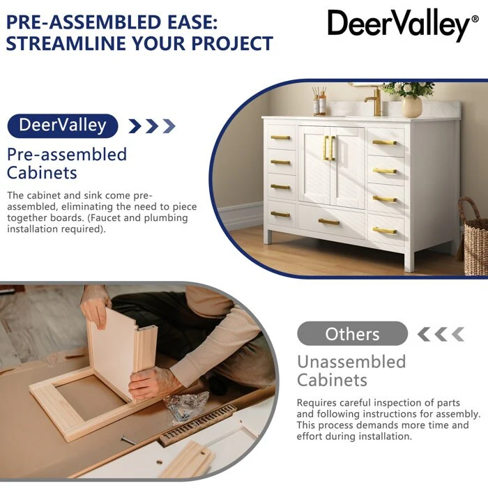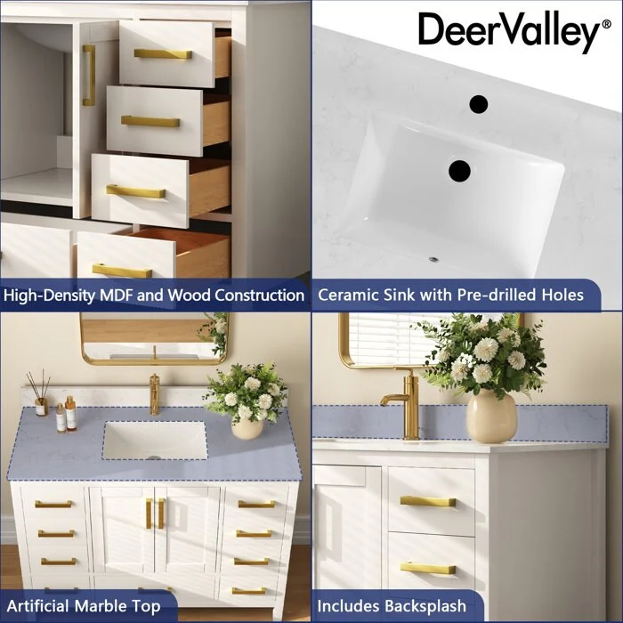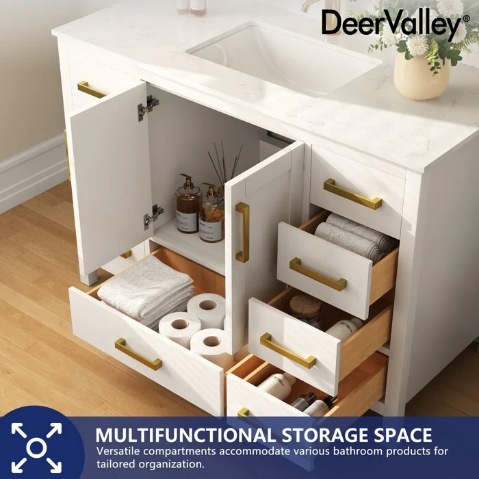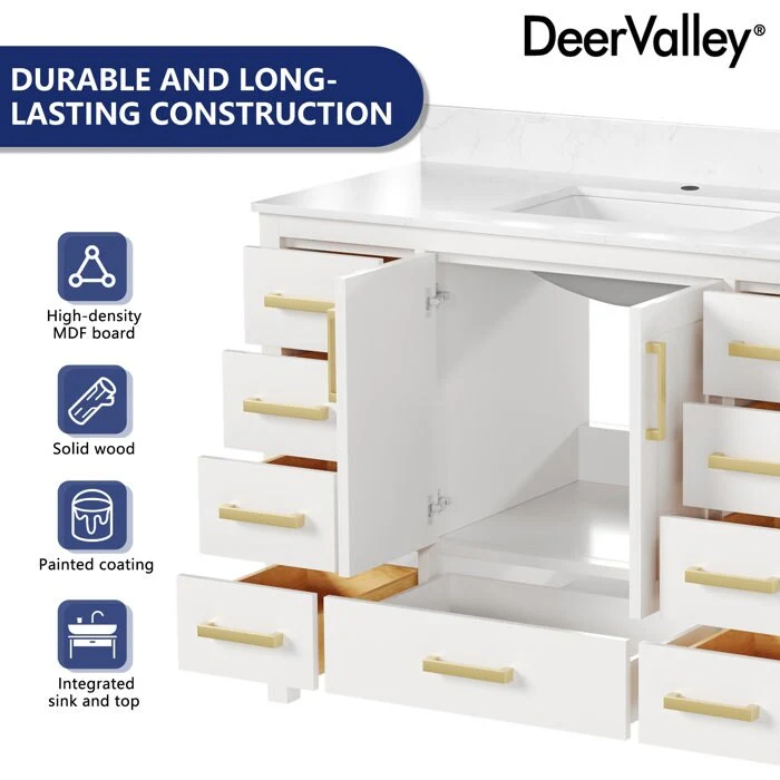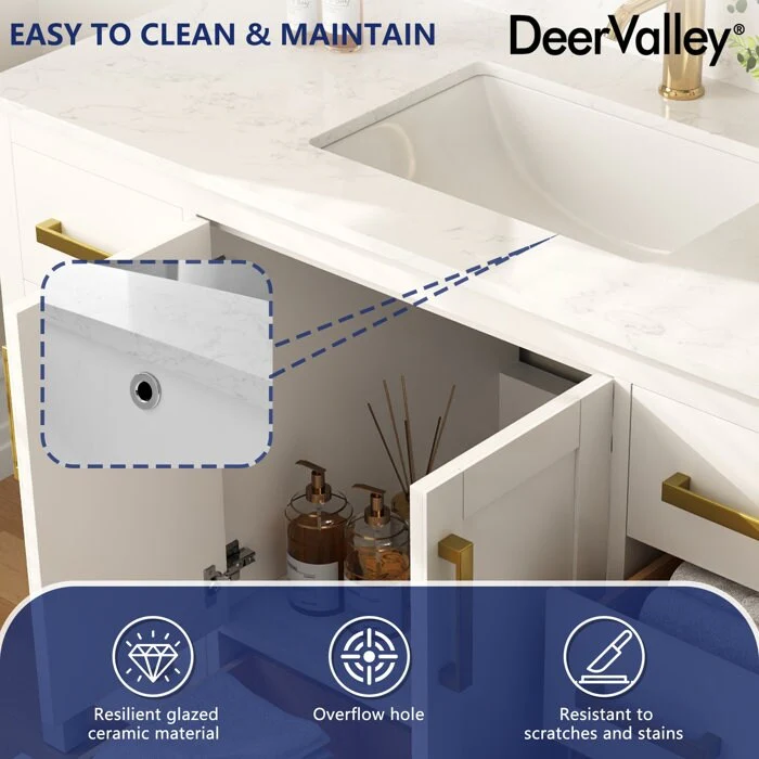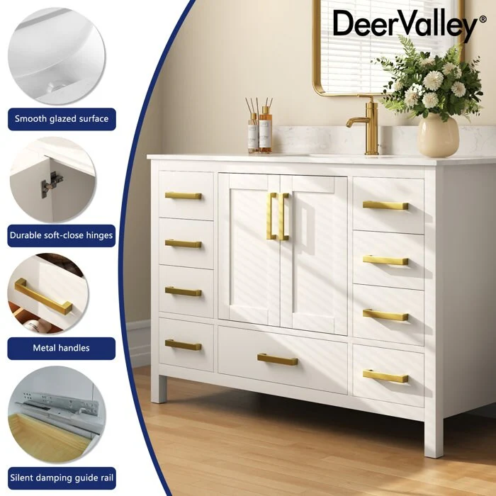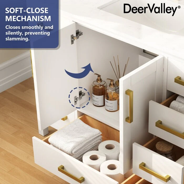DeerValley, your premier kitchen and bath brand, offers meticulously crafted products designed for lasting durability and style. Our bathroom vanities with sinks, made from premium materials like MDF and boxwood, combine functionality with sophistication. Elevate your bathroom with convenient features and ample storage, all in a sleek design.